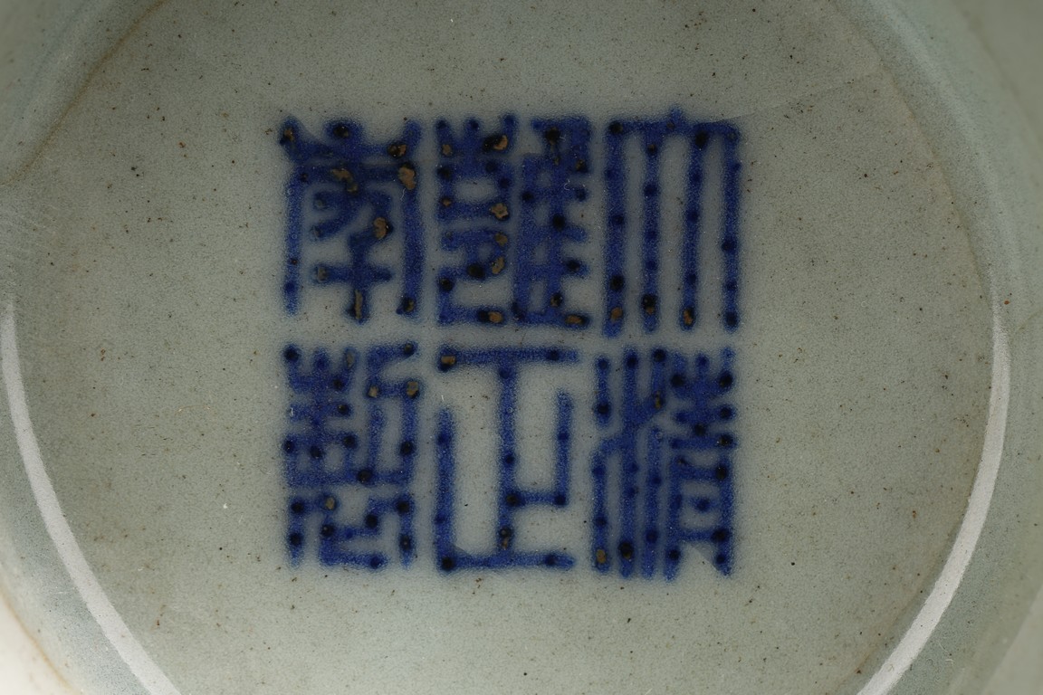 Qing Dynasty period. The square body with chamfered corners and supported on a splayed foot, surmounted by a tall cylindrical neck with lipped rim, flanked by a pair of curved handles issuing from the mouths of moulded dragon heads, the exterior suffused with fine network of crackles reserved on pale grey ground, the base inscribed with a six-character reign mark.