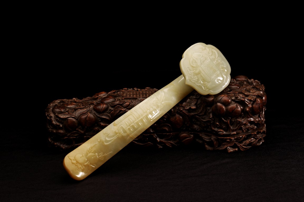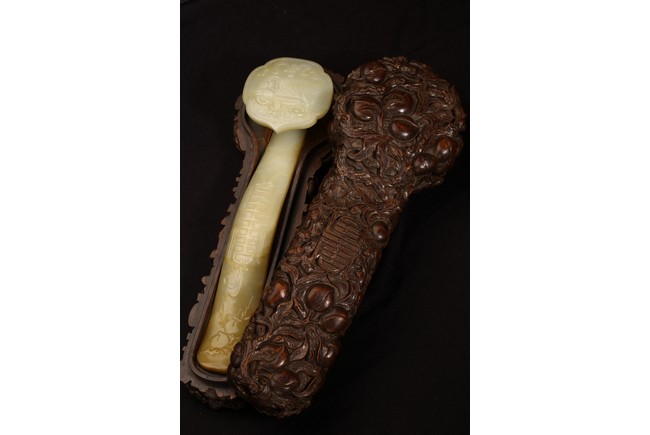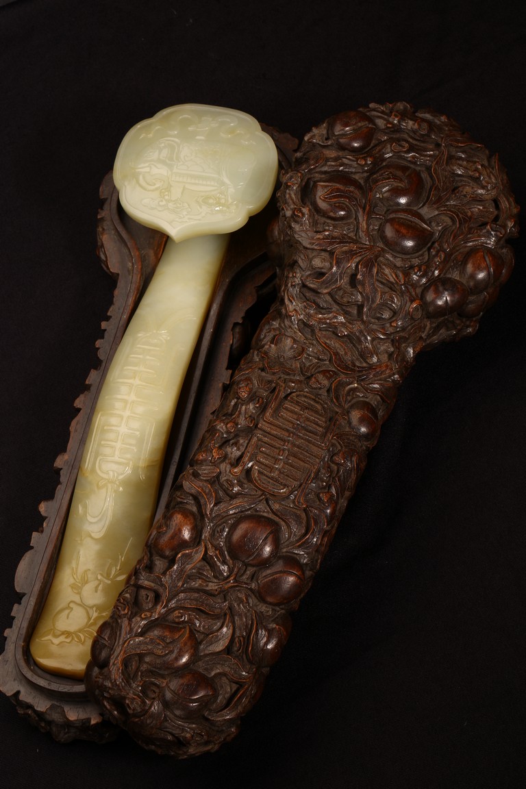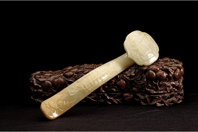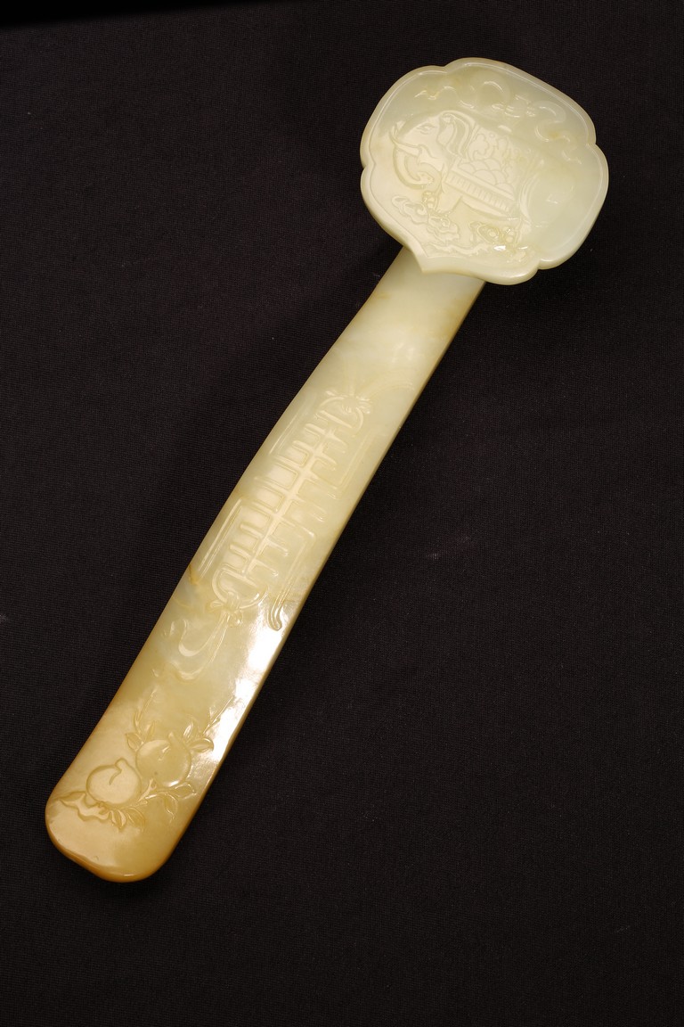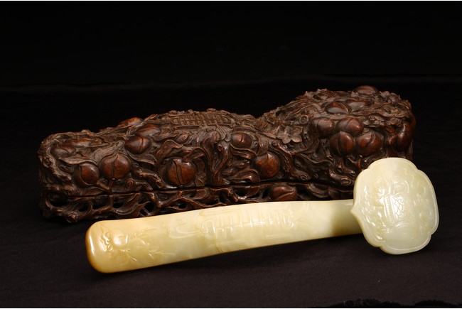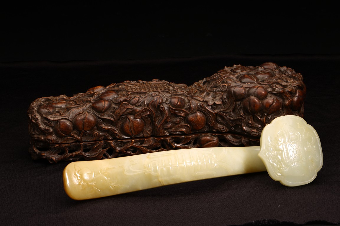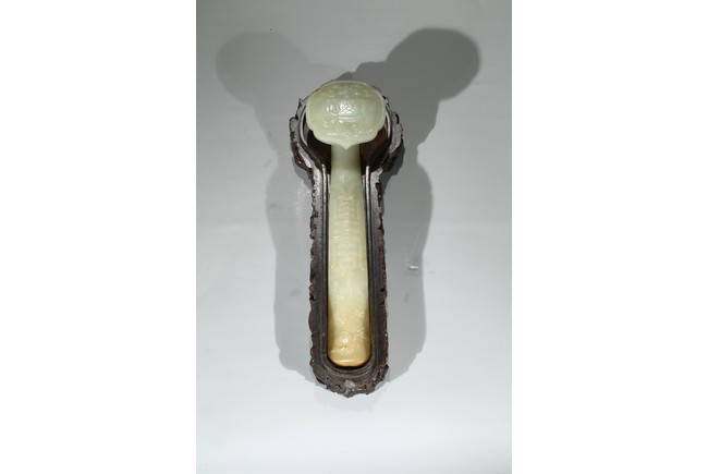 此柄如意以整塊青白玉雕琢而成,質地光潤,器身呈靈芝式,雲葉首,柄身中部隆起,自上而下漸寬,曲線優美。正面浮雕太平有象紋飾,吉祥圖案常畫像馱寶瓶,瓶中還插有花卉作裝飾。“太平有像”也叫“太平景象”、“喜像昇平”,藉以形容河清海晏、民康物阜。而此大象圍以雲氣刻於如意結頭之上,又借《易經》“變化雲為吉事有祥”之句,取吉祥如意以象徵。如意執柄分段作“壽字紋”“蟠桃紋”,刻工精巧細緻,予人富麗雅緻之感。配硬木福壽紋盒。
