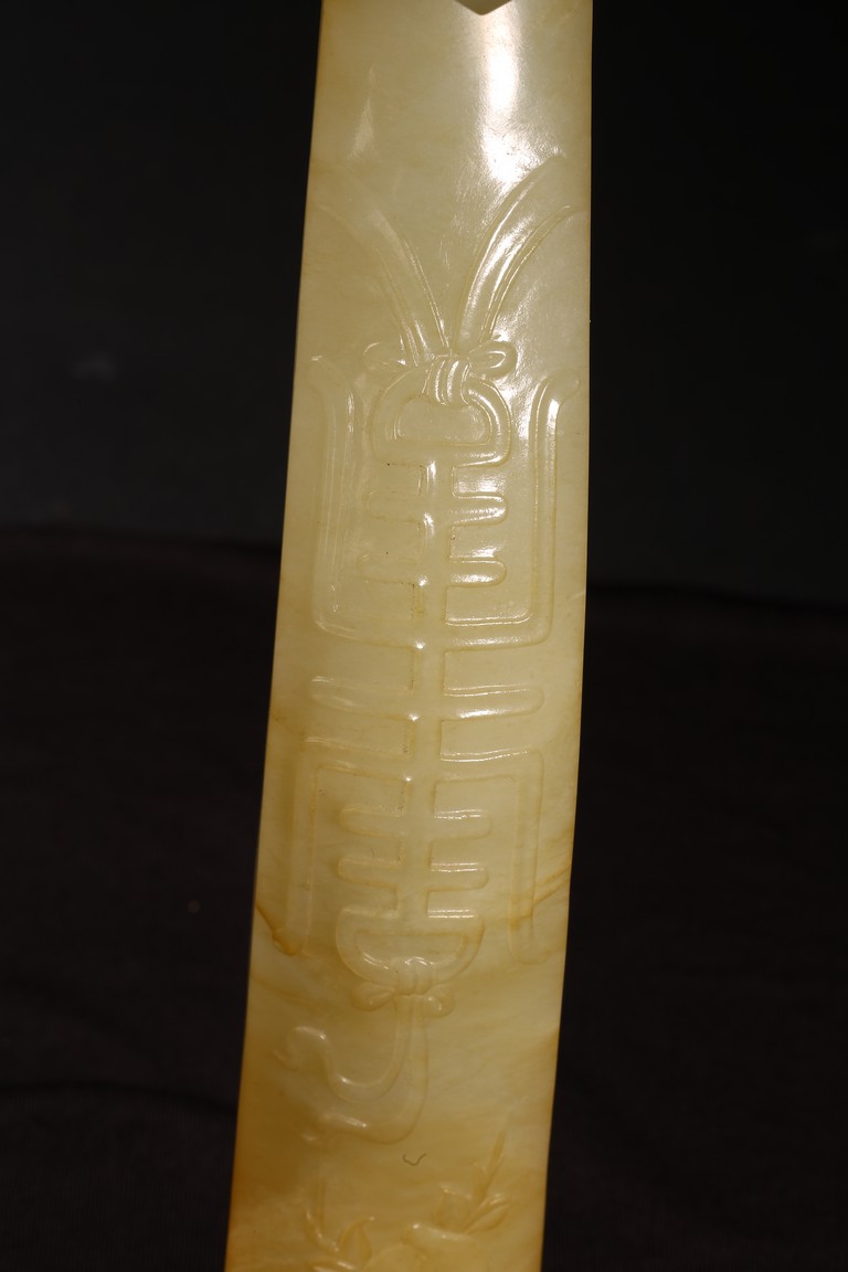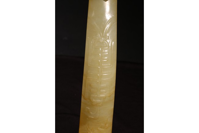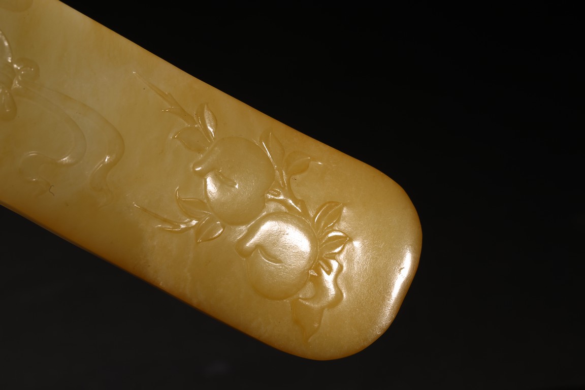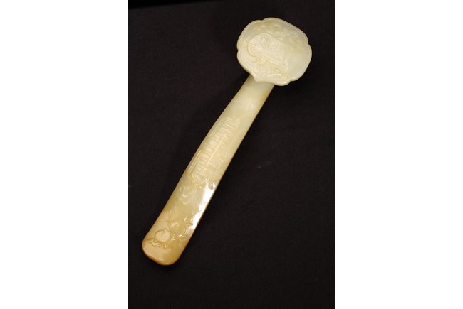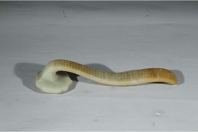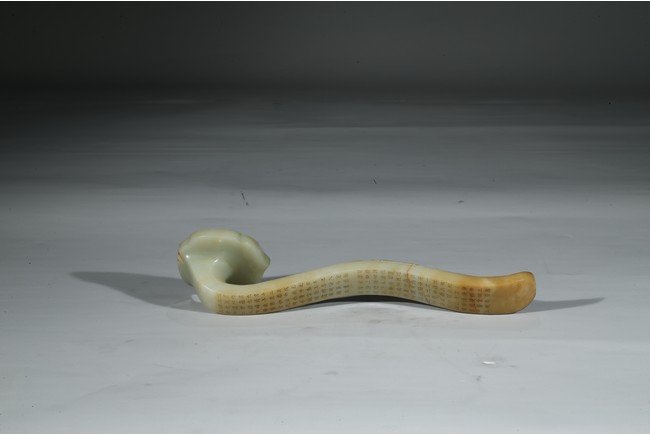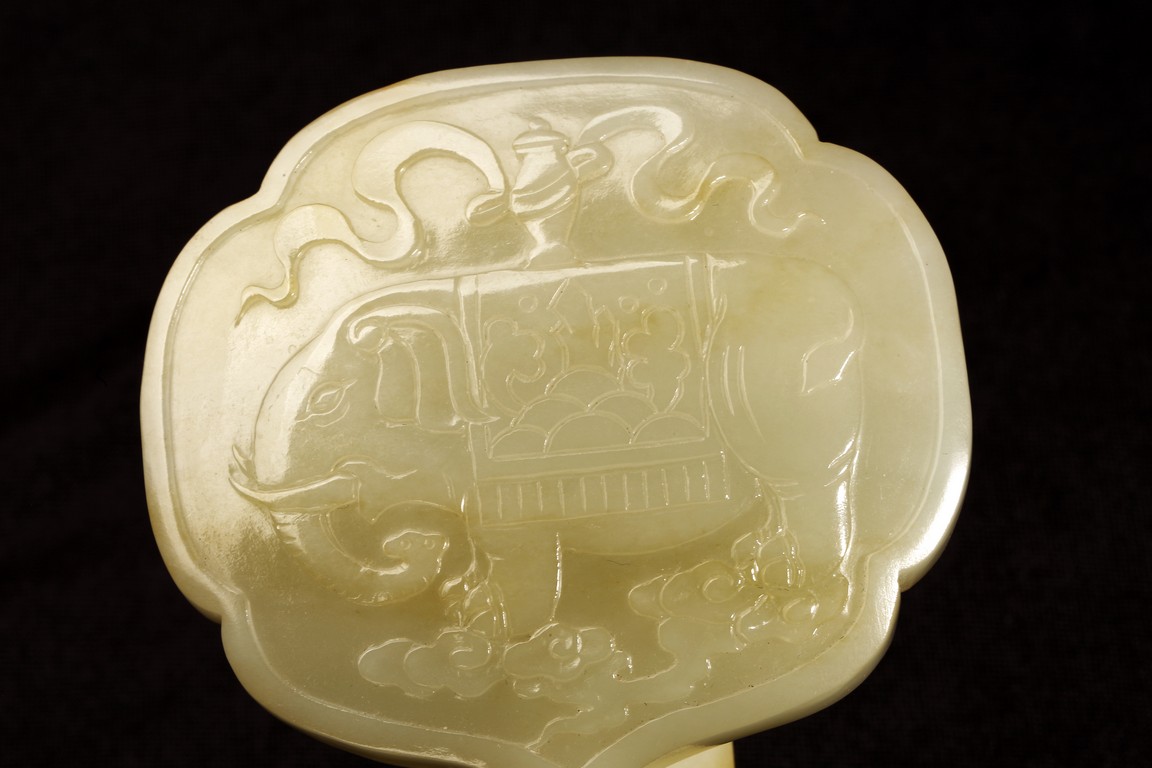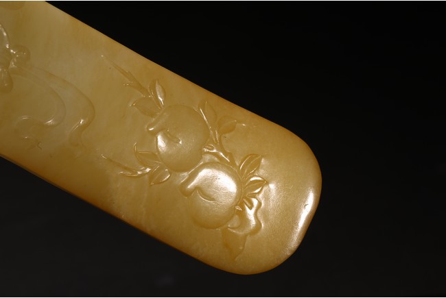 此柄如意以整塊青白玉雕琢而成,質地光潤,器身呈靈芝式,雲葉首,柄身中部隆起,自上而下漸寬,曲線優美。正面浮雕太平有象紋飾,吉祥圖案常畫像馱寶瓶,瓶中還插有花卉作裝飾。“太平有像”也叫“太平景象”、“喜像昇平”,藉以形容河清海晏、民康物阜。而此大象圍以雲氣刻於如意結頭之上,又借《易經》“變化雲為吉事有祥”之句,取吉祥如意以象徵。如意執柄分段作“壽字紋”“蟠桃紋”,刻工精巧細緻,予人富麗雅緻之感。配硬木福壽紋盒。
