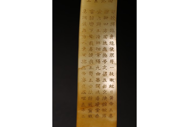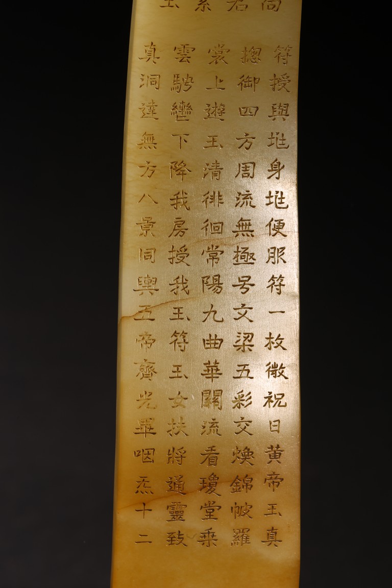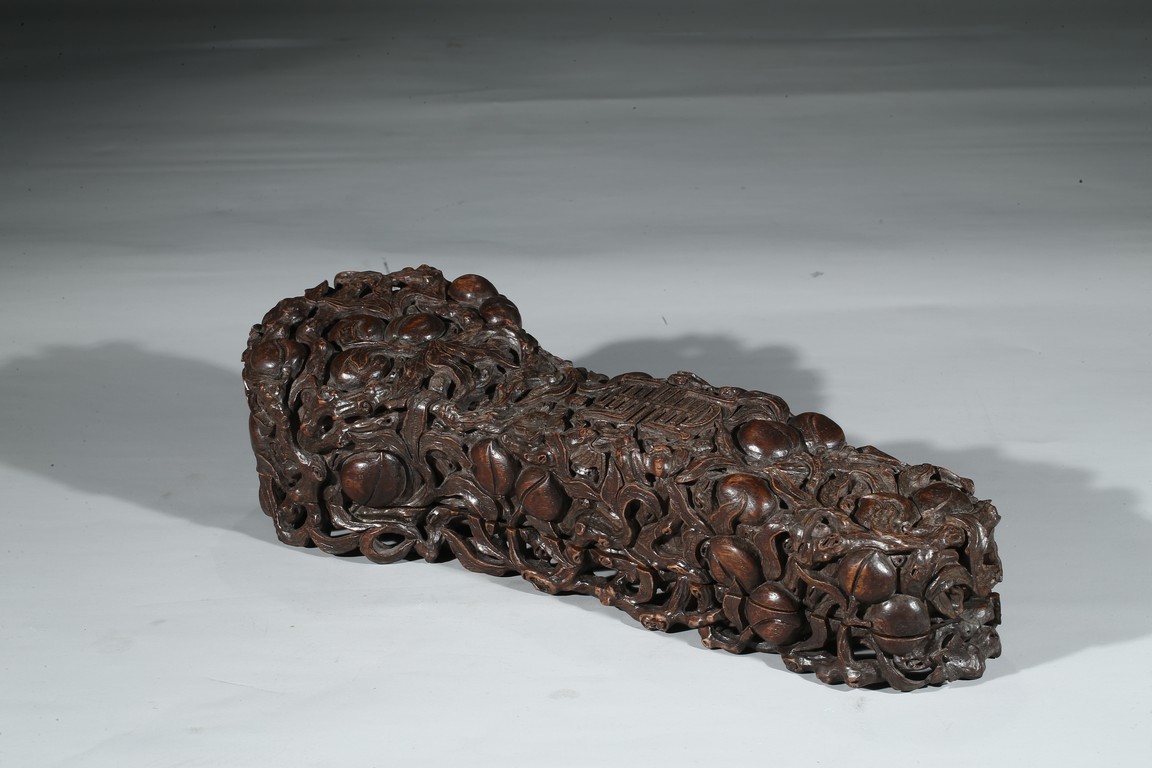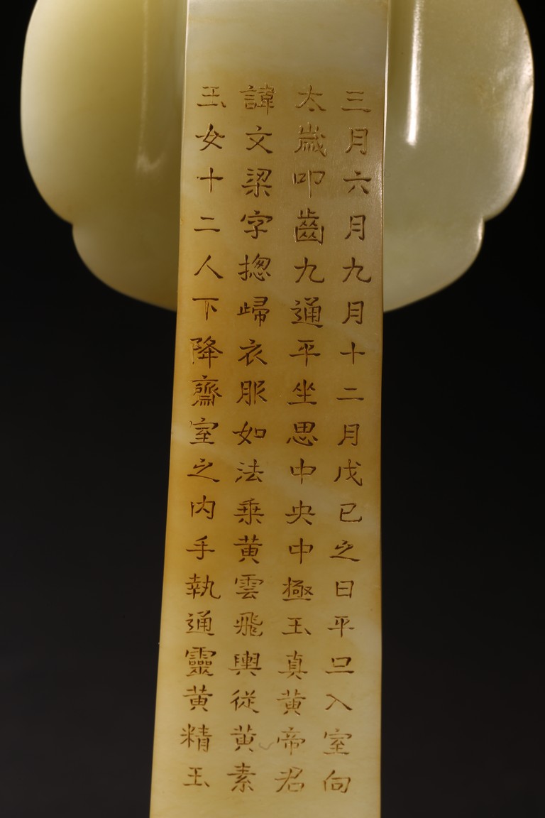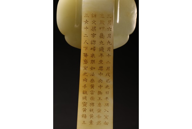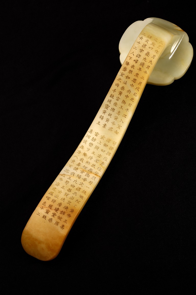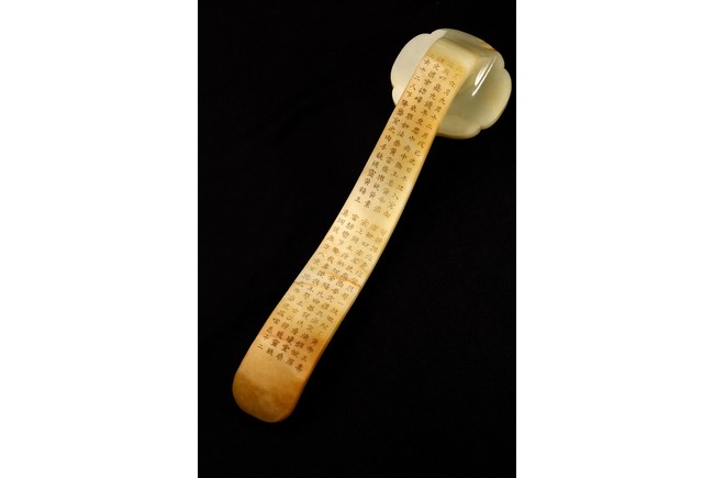 此柄如意以整塊青白玉雕琢而成,質地光潤,器身呈靈芝式,雲葉首,柄身中部隆起,自上而下漸寬,曲線優美。正面浮雕太平有象紋飾,吉祥圖案常畫像馱寶瓶,瓶中還插有花卉作裝飾。“太平有像”也叫“太平景象”、“喜像昇平”,藉以形容河清海晏、民康物阜。而此大象圍以雲氣刻於如意結頭之上,又借《易經》“變化雲為吉事有祥”之句,取吉祥如意以象徵。如意執柄分段作“壽字紋”“蟠桃紋”,刻工精巧細緻,予人富麗雅緻之感。配硬木福壽紋盒。