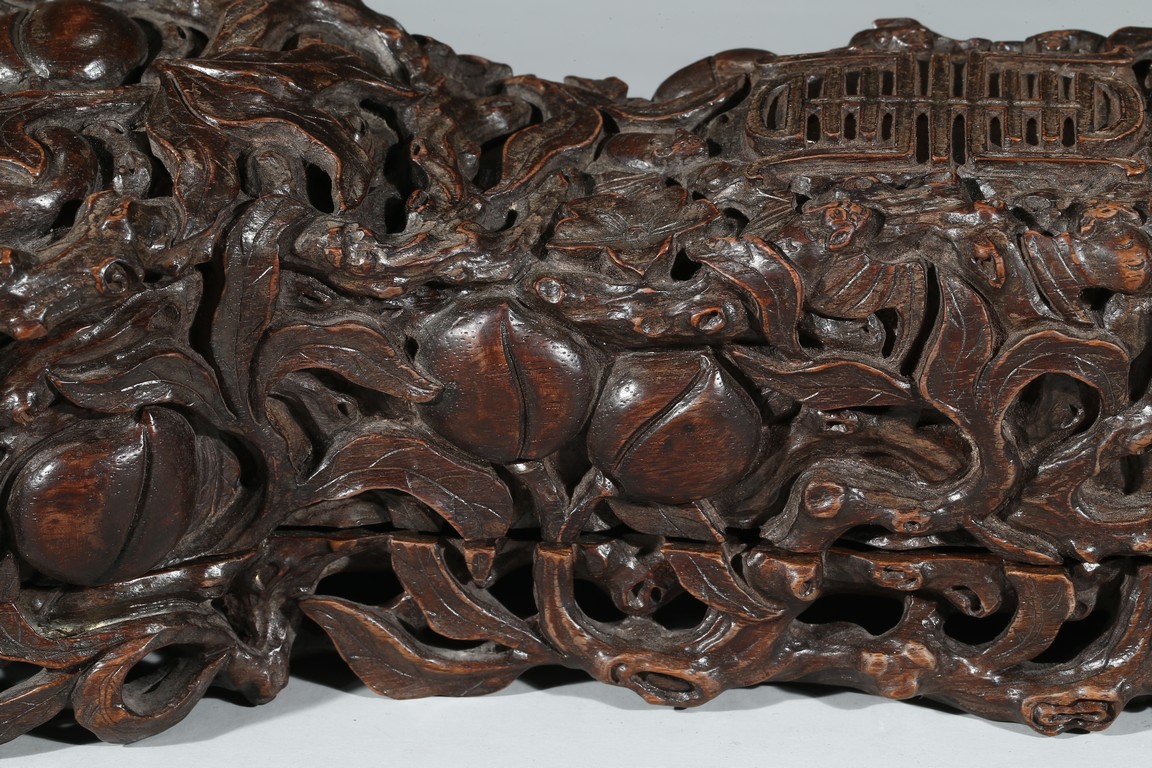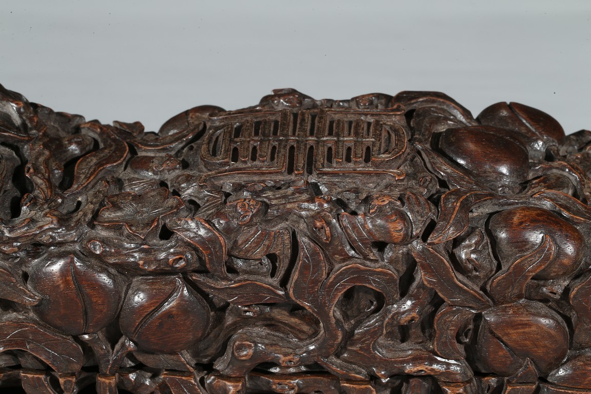 The head carved in relief to depict elephant supporting vase, the handle stylized auspicious characters, accompanied with delicately carved hardwood box.