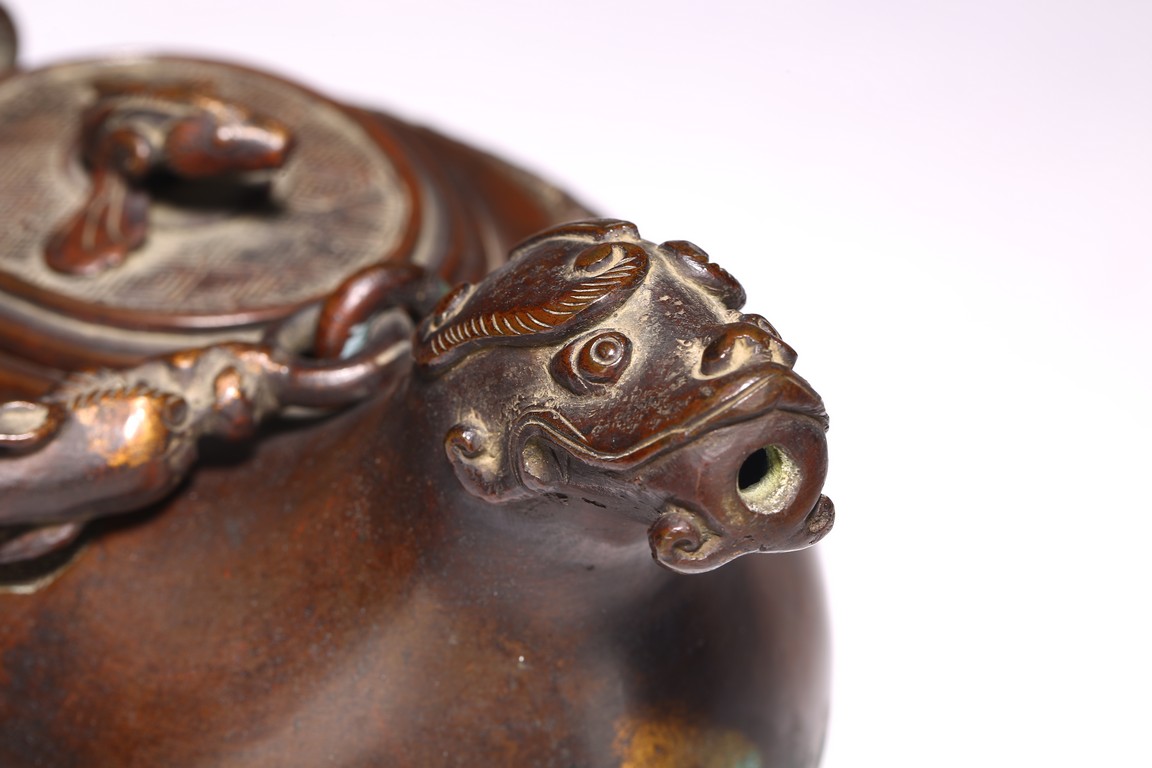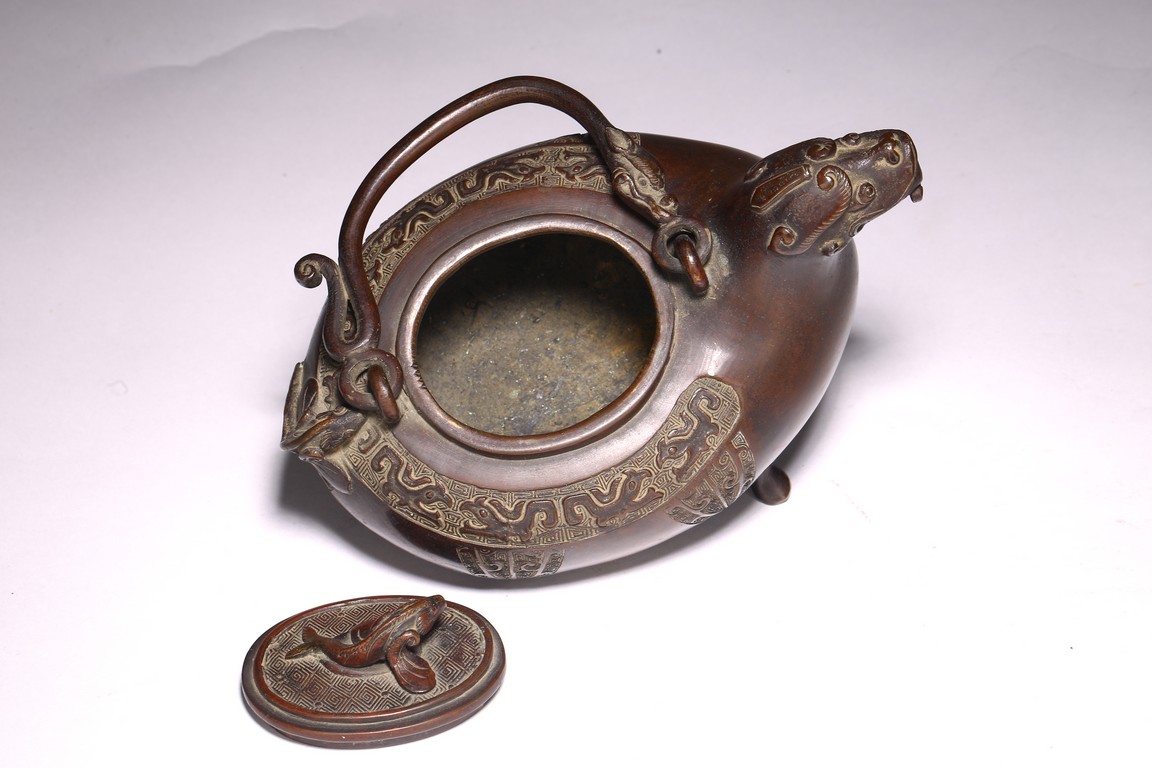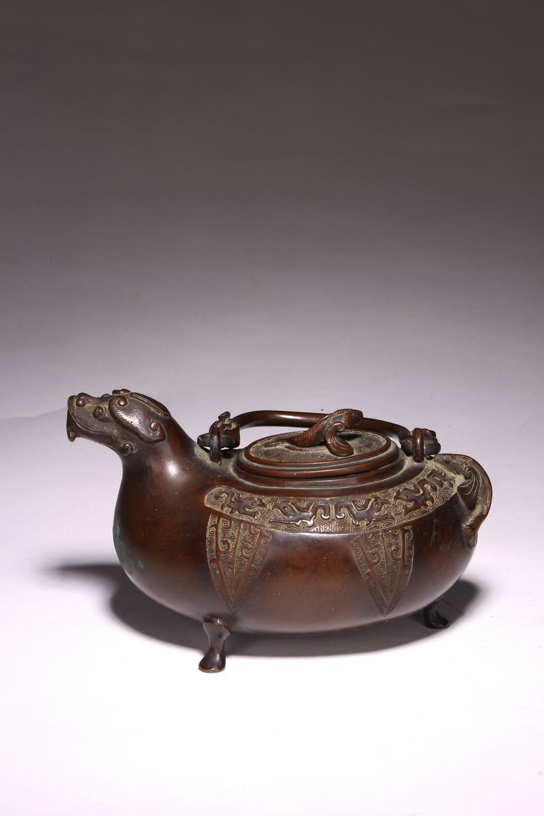 Qing Dynasty period. Cast in the form of a mythical beast standing on three feet, body engraved with archaistic pattern, the cover on the back surmounted with a fish like finial, tied with a loose handle, the mythical beast head as spout.