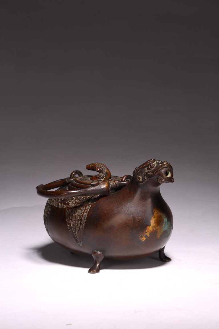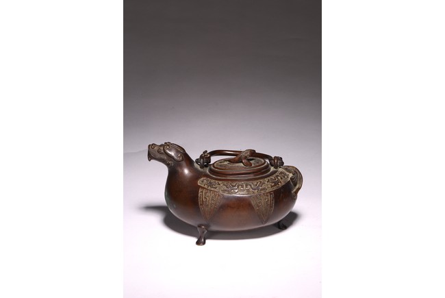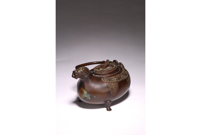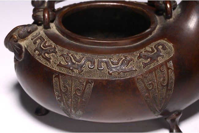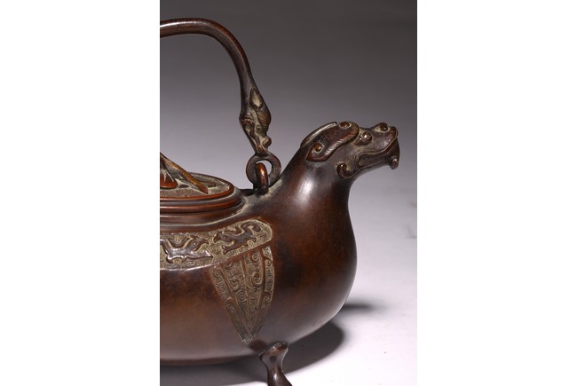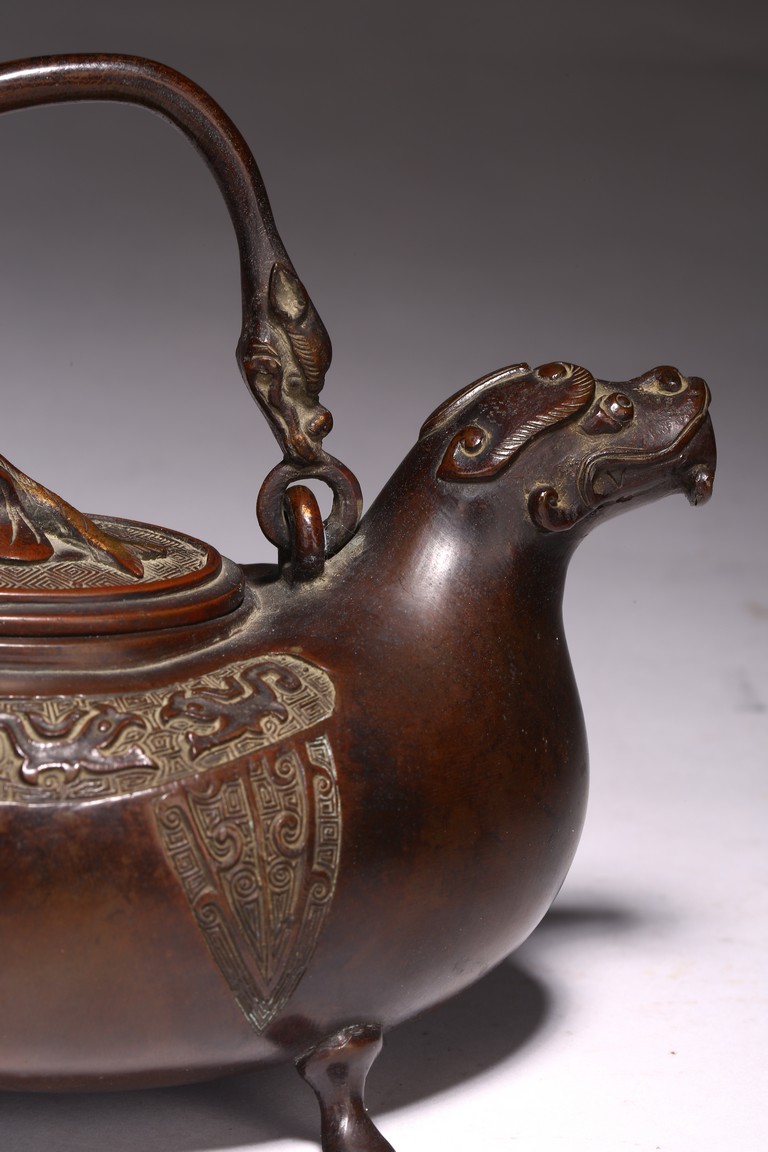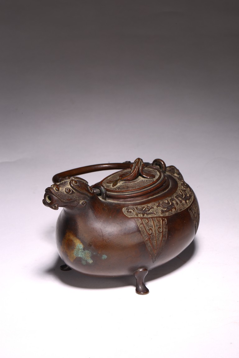 采用精炼铜制作而成,流口为瑞兽形状,瑞兽双目圆瞪,双耳后贴,神态憨厚。带盖,子母口,有提手,便于使用。腹部饰“夔龙纹”,纹饰清晰对称,带四个小兽足。