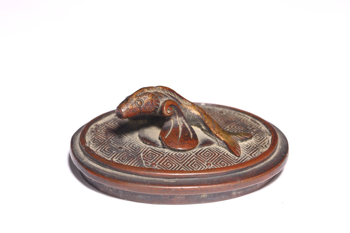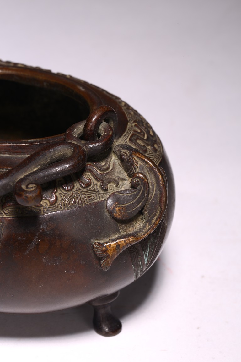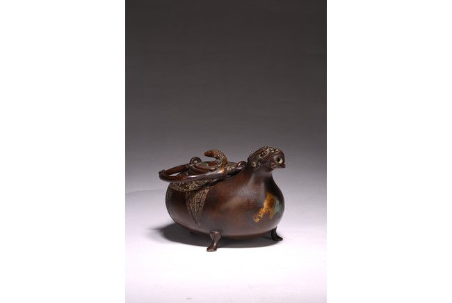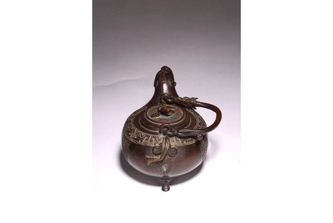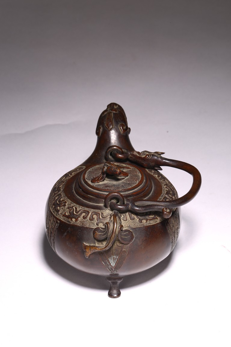 采用精炼铜制作而成,流口为瑞兽形状,瑞兽双目圆瞪,双耳后贴,神态憨厚。带盖,子母口,有提手,便于使用。腹部饰“夔龙纹”,纹饰清晰对称,带四个小兽足。