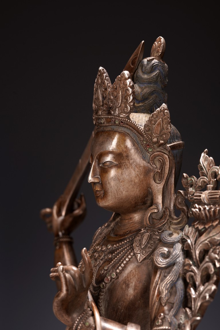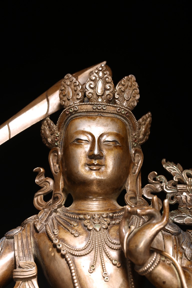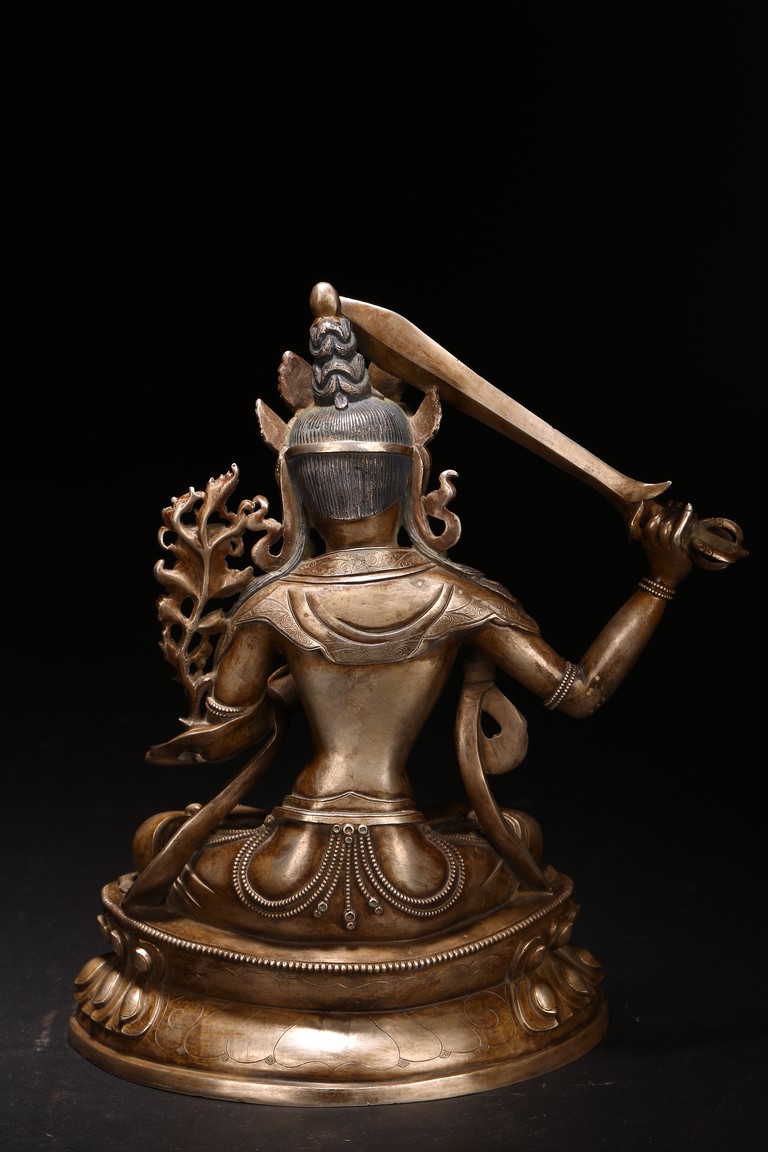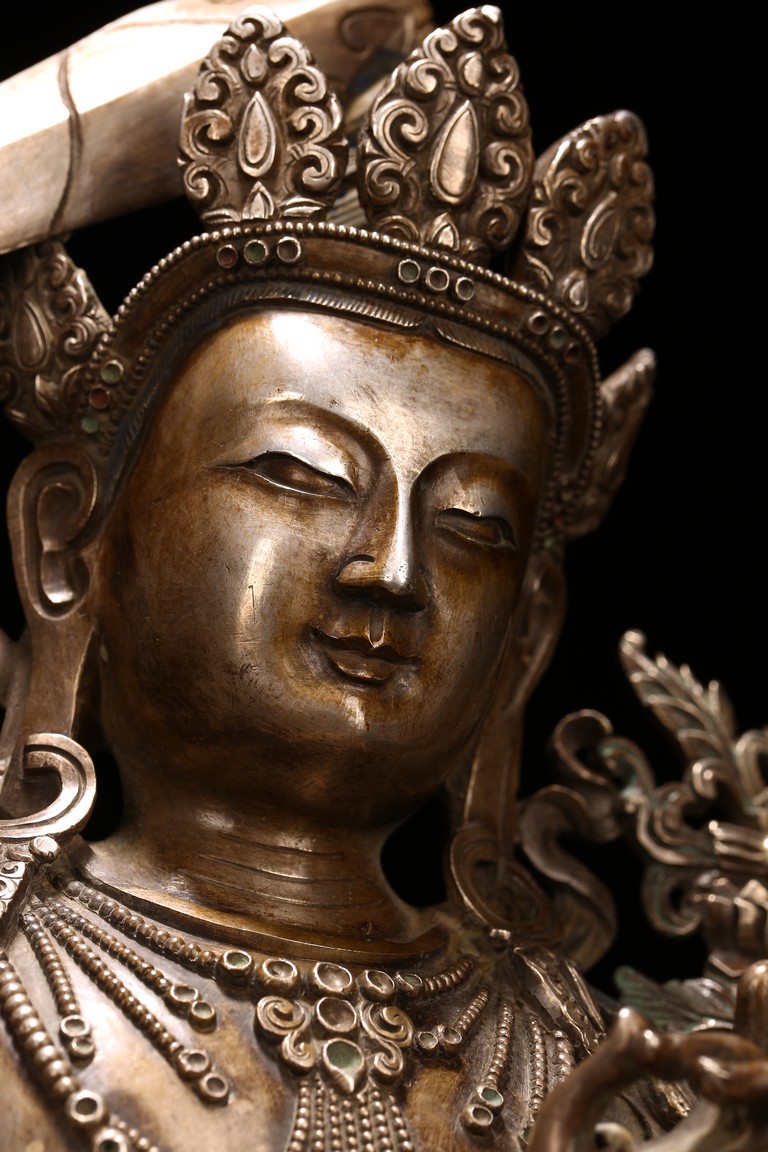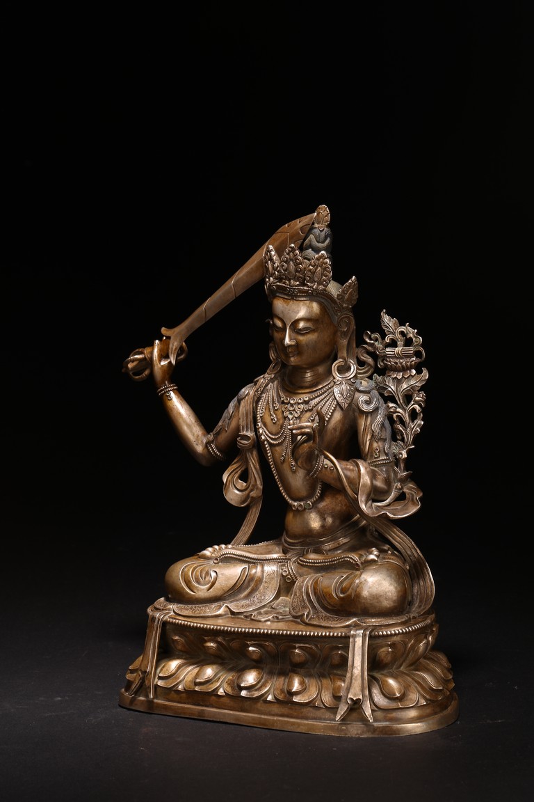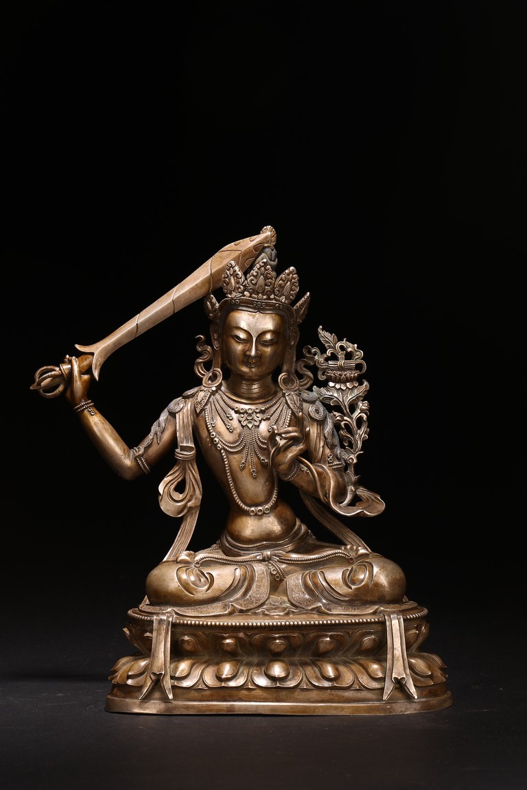 此文殊以純銀為材,跏趺於蓮花雙層寶座之上,左手於胸前施說法印,右手側舉寶劍。髮髻高聳,頭戴寶冠,面容柔美,神態祥和。細眉長目,耳飾圓璫,項鍊瓔珞飄然胸前,所嵌寶石有些脫落。整體氣質古樸,端莊周正,為一尊難得的佛教造像。 來源:德州達拉斯藏家收藏 Provenance: Property from a private collection, Dallas