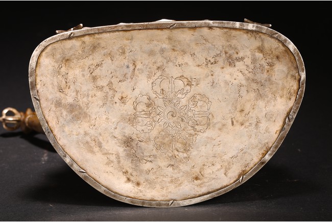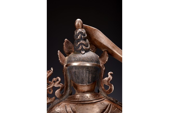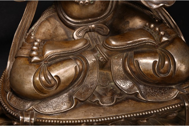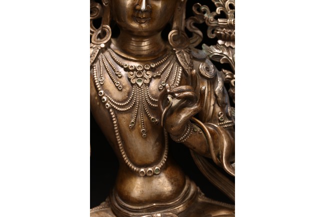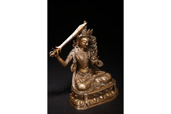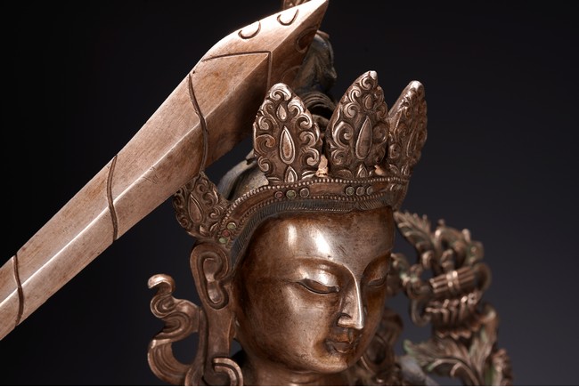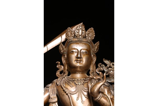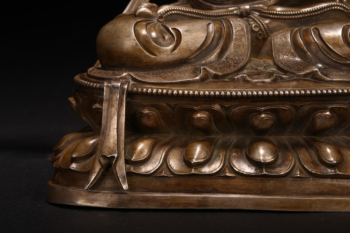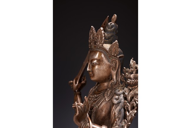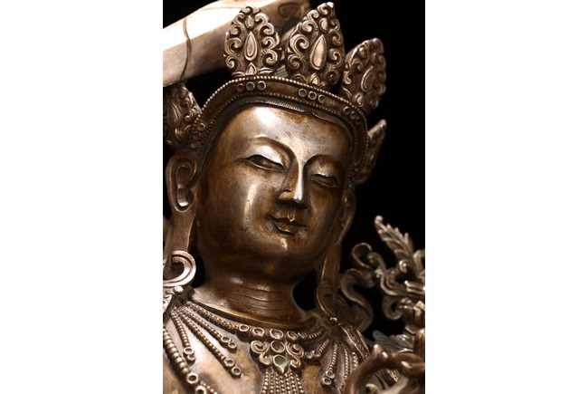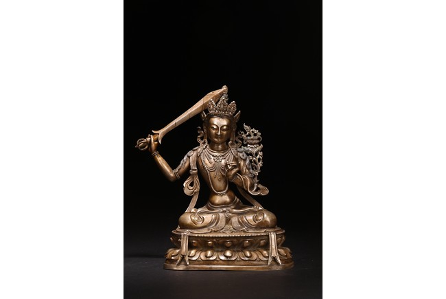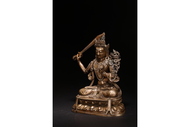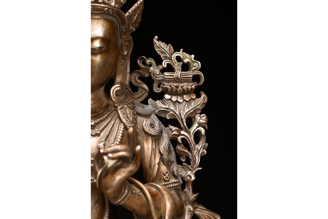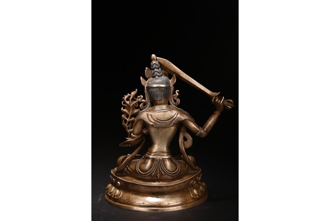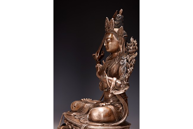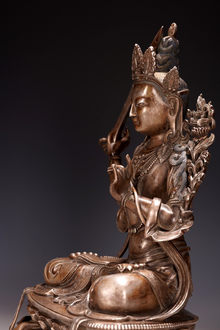 此文殊以純銀為材,跏趺於蓮花雙層寶座之上,左手於胸前施說法印,右手側舉寶劍。髮髻高聳,頭戴寶冠,面容柔美,神態祥和。細眉長目,耳飾圓璫,項鍊瓔珞飄然胸前,所嵌寶石有些脫落。整體氣質古樸,端莊周正,為一尊難得的佛教造像。 來源:德州達拉斯藏家收藏 Provenance: Property from a private collection, Dallas