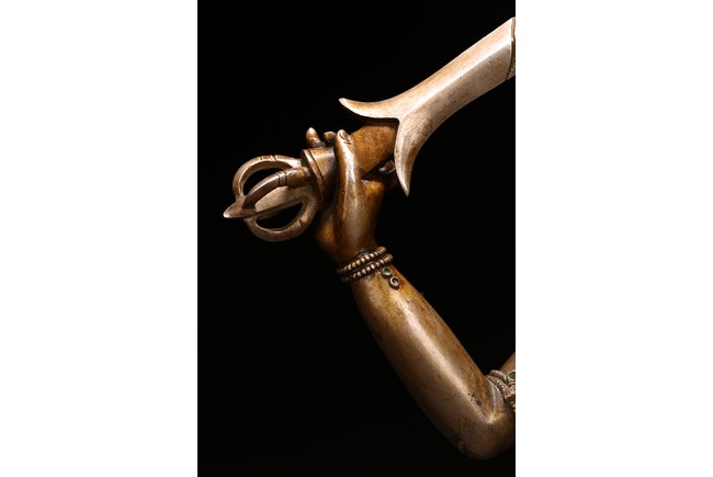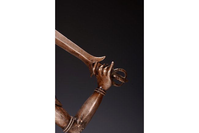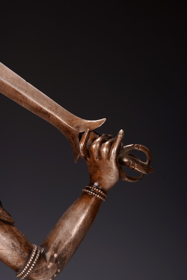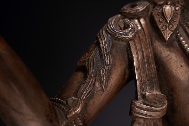 The figure seated in dhyanasana on a double lotus base, his right hand raised holding a sword, his left in karana mudra, his face with a serene expression and framed with pendant earrings and a five-point diadem, the hair tied up in a chignon surmounted with an ushnisha, wearing a dhoti, the hem incised with scrolling foliage, and a number of necklaces and bracelets.