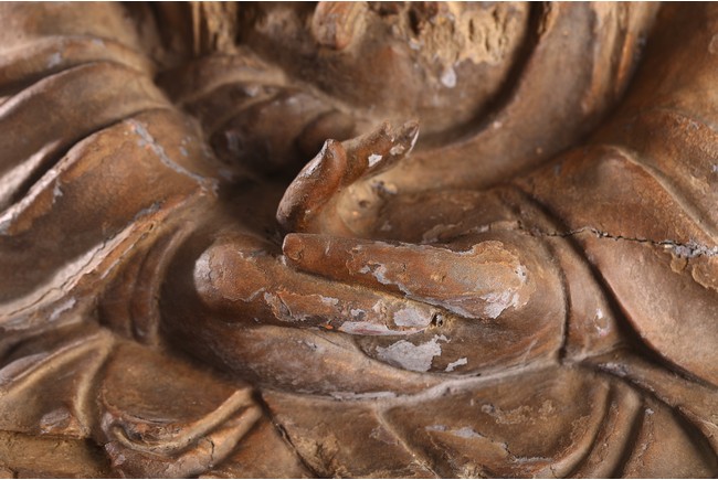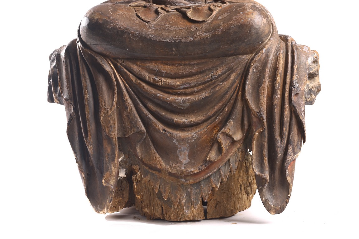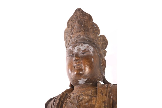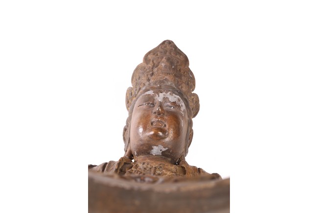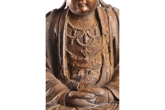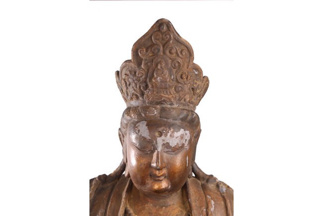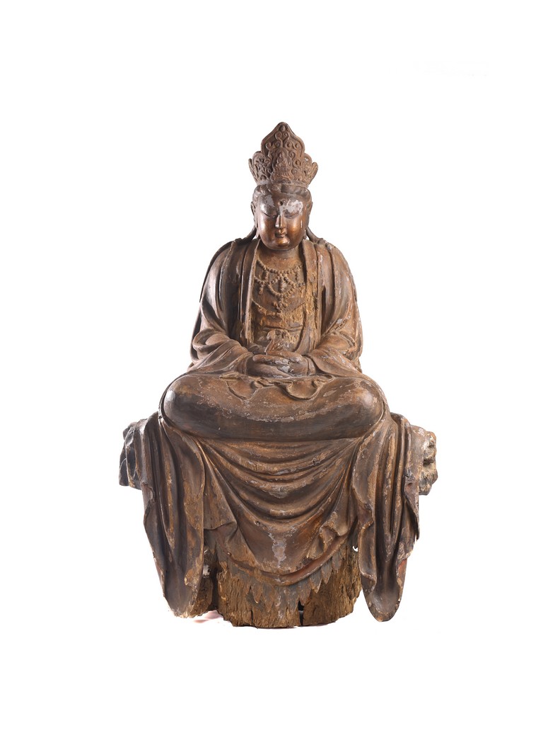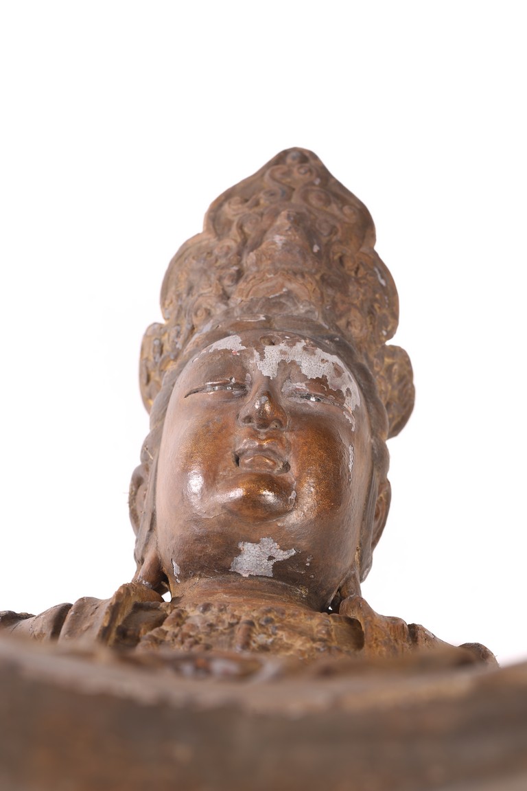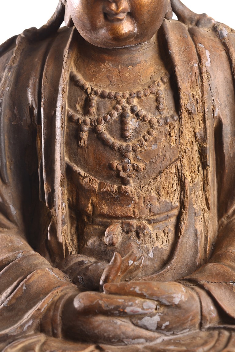 觀音菩薩又作觀世音菩薩、觀自在菩薩、光世音菩薩等,為四大菩薩之一,是佛教中最受崇拜的菩薩。觀音相貌端莊慈祥,具有無量的智慧和神通,大慈大悲,普救人間疾苦。當眾生有苦難時,只要稱念他的名號,即可獲得解脫苦厄。此尊觀音菩薩像高束髮,垂髮挽結,自然舒捲,搭於雙肩,富有寫實感。頭戴祥雲形花蔓寶冠,卷草紋雕飾精美,冠正中浮雕化佛阿彌陀佛。觀音面相豐滿端莊,雙目微頷,作俯視狀,五官刻畫柔美,輪廓端正,表情靜謐內省,充分表現出觀音菩薩大慈大悲、普度眾生的佛性。此像工藝精湛,造像軀體結構比例精準,體態自如,細部刻畫精緻寫實,線條流暢,如行雲流水,一氣呵成,代表了元明時期的高超藝術水準。 類似明木胎髹漆觀音菩薩坐像,參考美國佳士得1998年5月拍賣木雕彩繪觀音坐像,成交價90500美金 For a related lacquer wood guanyin statue, refer to Lot 132 sold in Christie's May 1995 for 90,500 USD