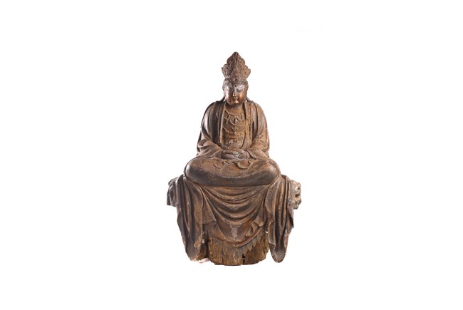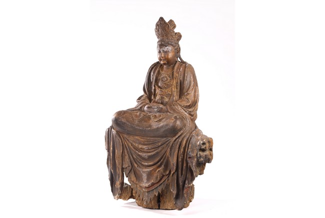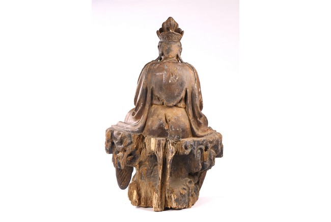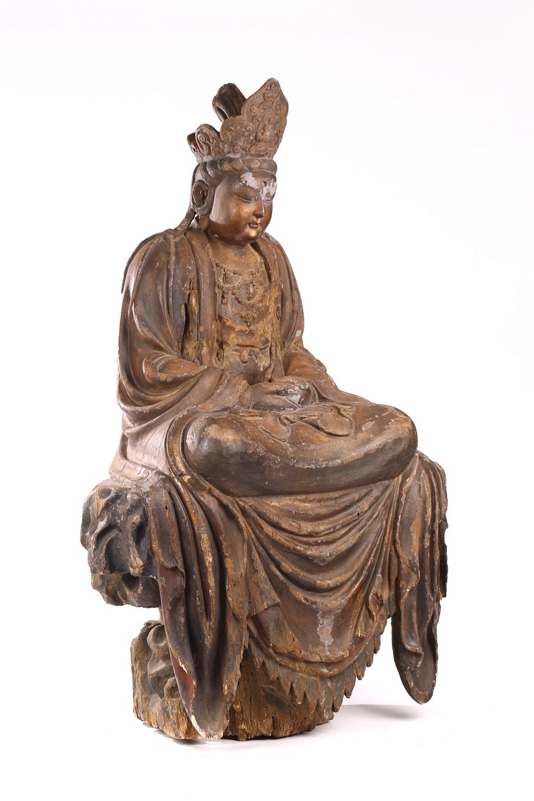 Ming Dynasty period. Seated on a 'rock outcrop' in lalitasana, the bodhisattva is shown with both hands rested in front of belly, dressed in flowing robe elegantly falling into neat voluminous folds and wearing beaded necklaces around chest, his face is shown with a meditative expression below an elaborate crown with a small figure of Amitabha.