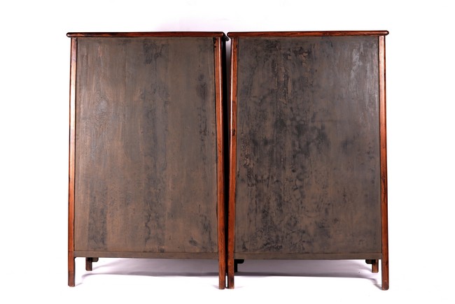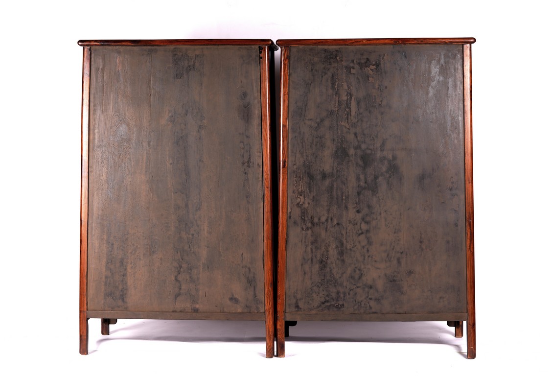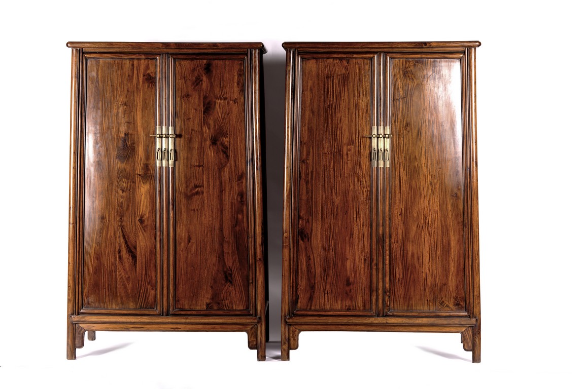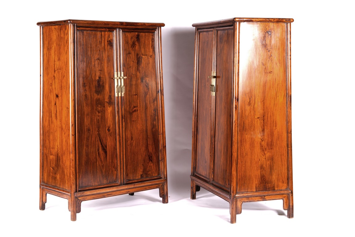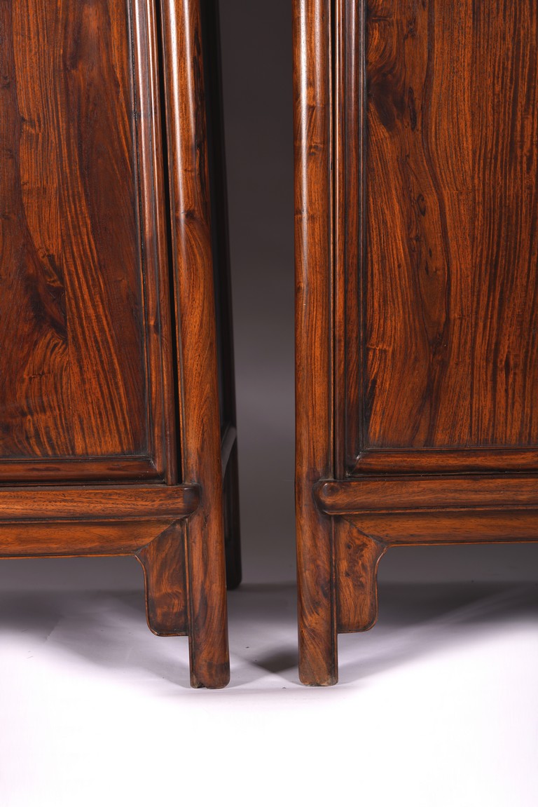 Late Qing Dynasty period/Republic period. Each slightly tapered rectangular cabinet with rounded corners and stiles, the top slightly overhanging the twin doors with recessed panels, divided by a central stile, arched beaded aprons, doors with baitong mounts, the wood of rich reddish-brown with attractive patterns.