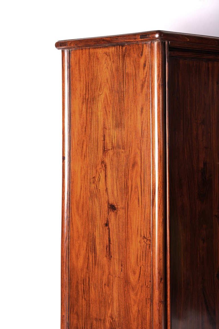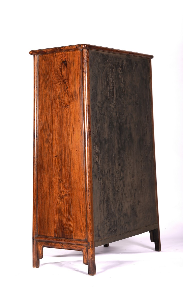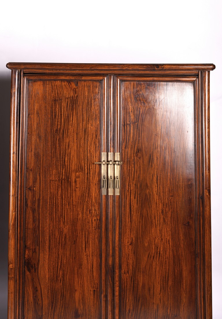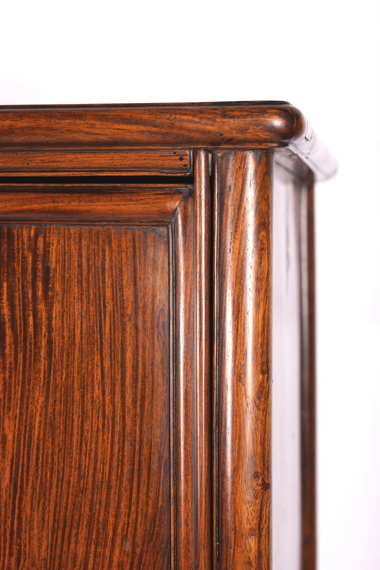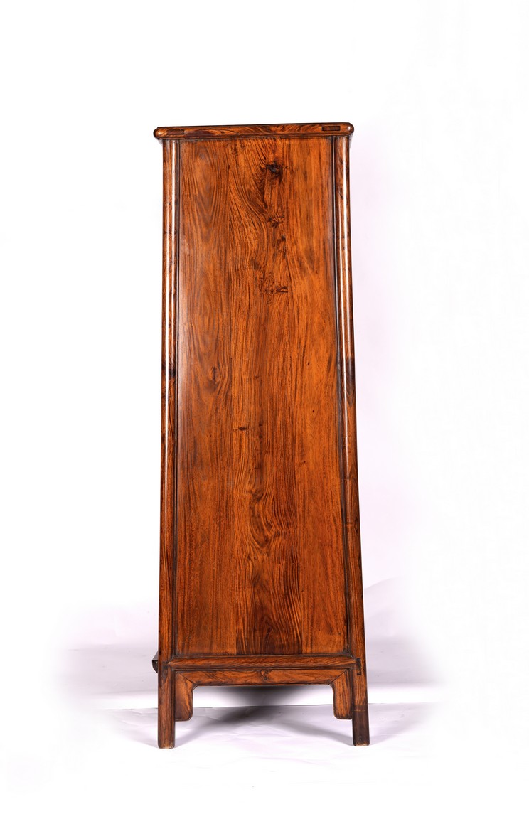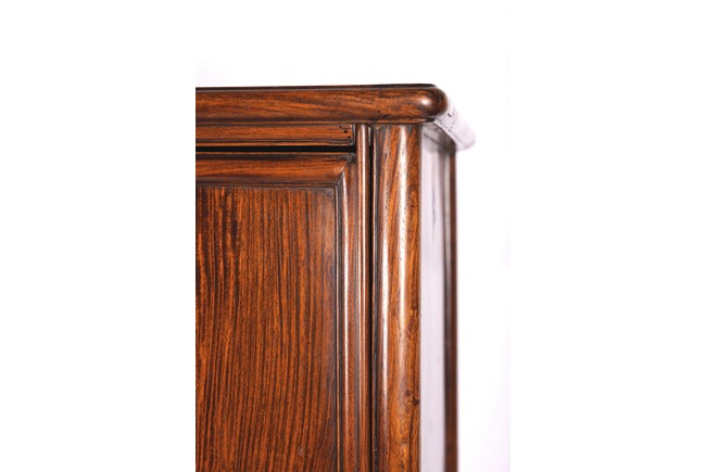 此圓角櫃為方材,以黃花梨製成,造型沉穩,腿足只倒去棱角,沒用線腳,不踩委角線,全身光素無紋,簡潔利落。櫃帽噴出,邊抹上舒下斂,至底壓線,線條硬朗利落。櫃門以格角榫攢邊裝獨板面心,選料奢侈精良,紋理清晰,有鬼面紋、漣漪水波紋。櫃內設三層空間,第二層隔板下裝兩具抽屜,充足的空間成就了它儲物的主要功能,實用性強。兩側櫃幫板一為獨板,一為兩拼。櫃內髹漆,傳遞出濃郁的歷史氣息。四足較高,之間均安光素刀牙板。整器外形簡潔,形態挺拔,線條簡練,製作考究,榫卯嚴謹,包漿紅潤,保存完整。