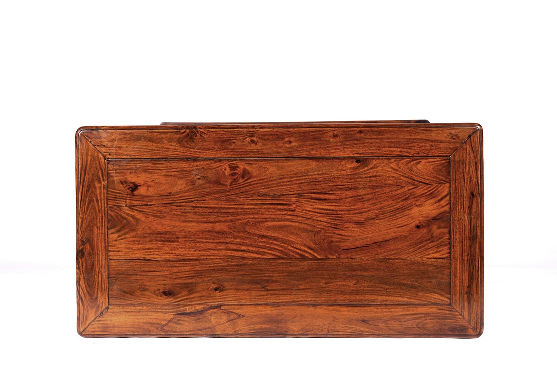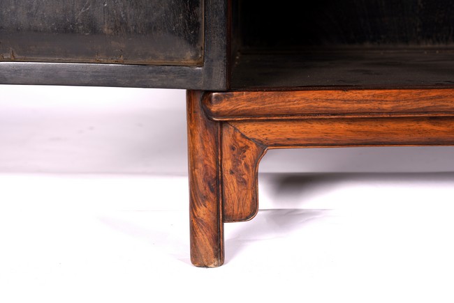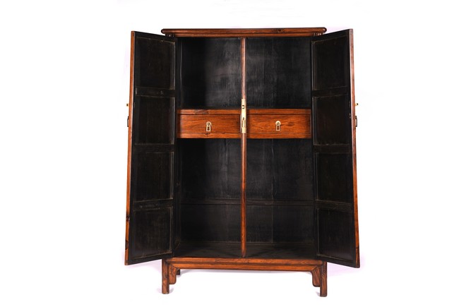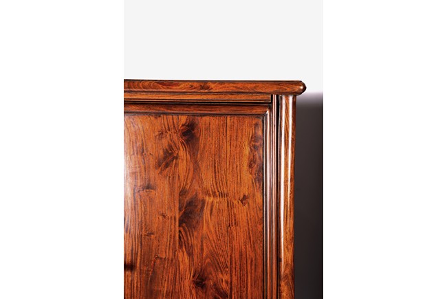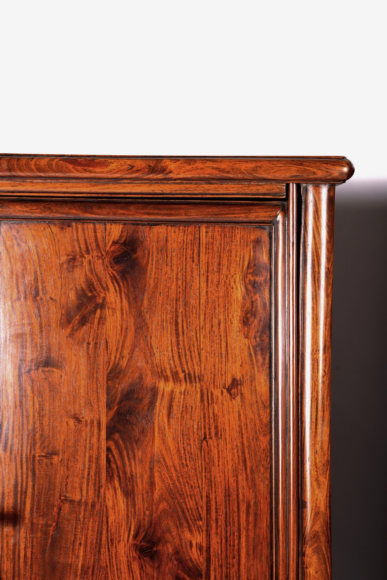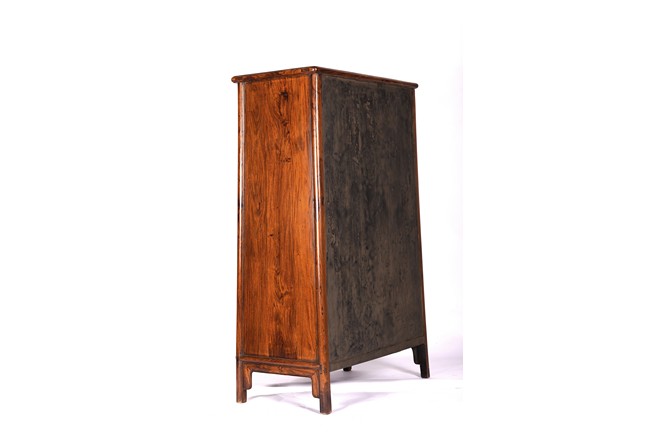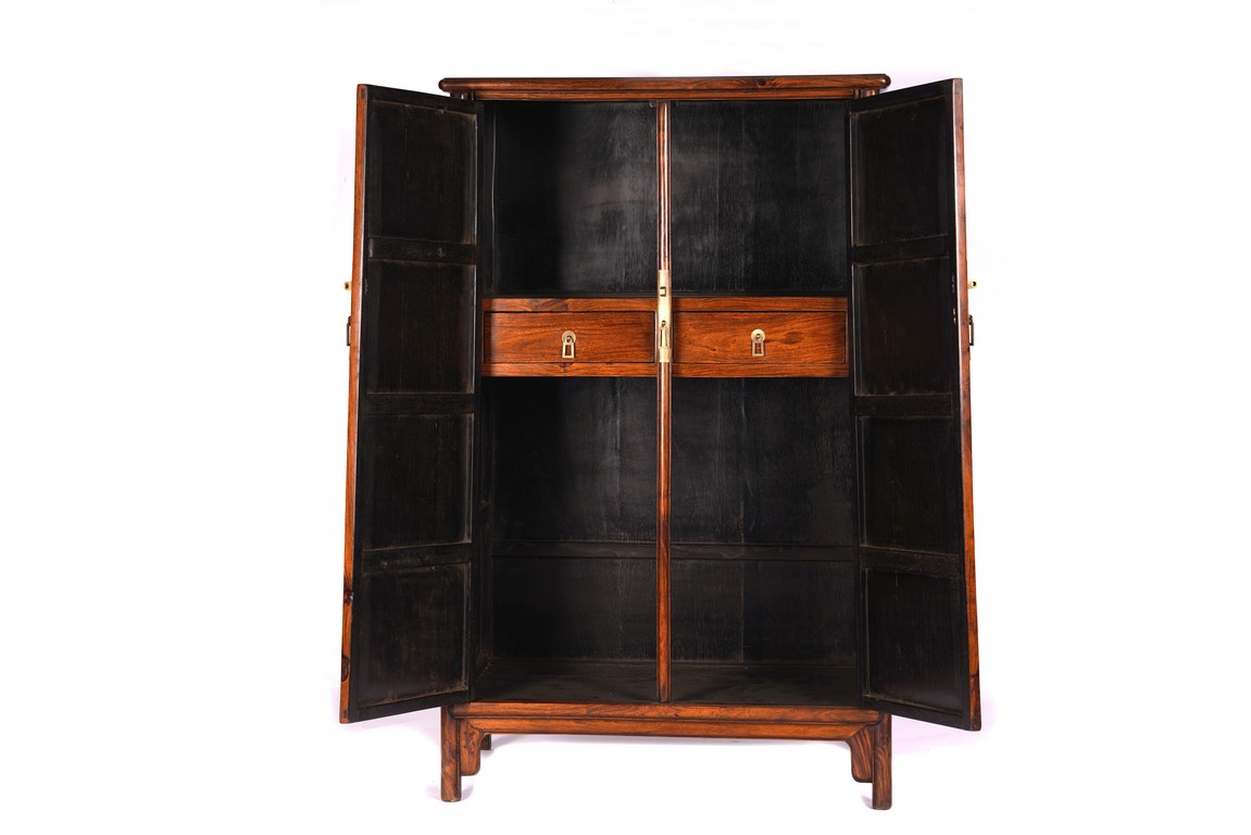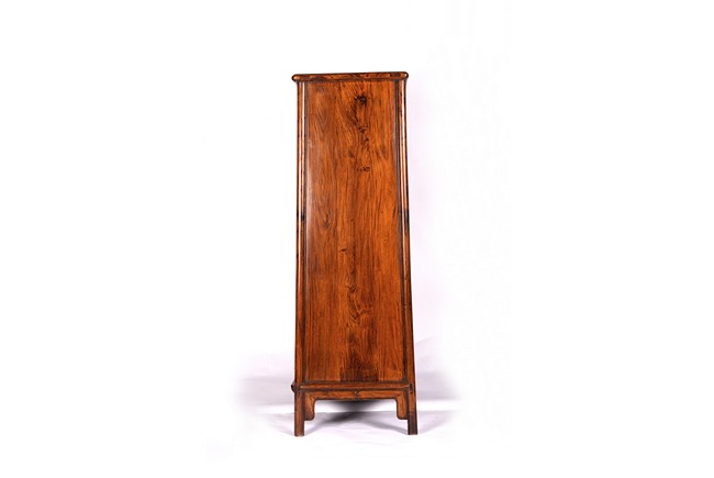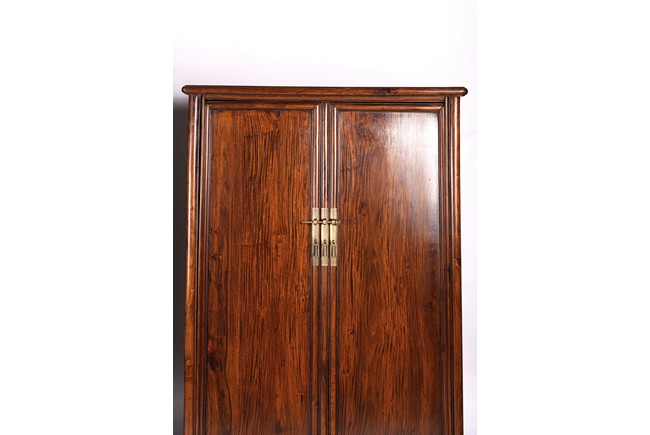 此圓角櫃為方材,以黃花梨製成,造型沉穩,腿足只倒去棱角,沒用線腳,不踩委角線,全身光素無紋,簡潔利落。櫃帽噴出,邊抹上舒下斂,至底壓線,線條硬朗利落。櫃門以格角榫攢邊裝獨板面心,選料奢侈精良,紋理清晰,有鬼面紋、漣漪水波紋。櫃內設三層空間,第二層隔板下裝兩具抽屜,充足的空間成就了它儲物的主要功能,實用性強。兩側櫃幫板一為獨板,一為兩拼。櫃內髹漆,傳遞出濃郁的歷史氣息。四足較高,之間均安光素刀牙板。整器外形簡潔,形態挺拔,線條簡練,製作考究,榫卯嚴謹,包漿紅潤,保存完整。