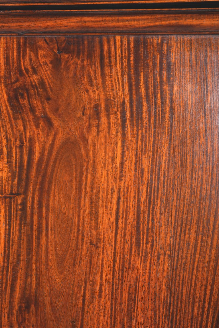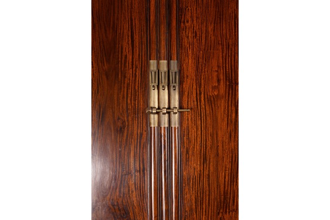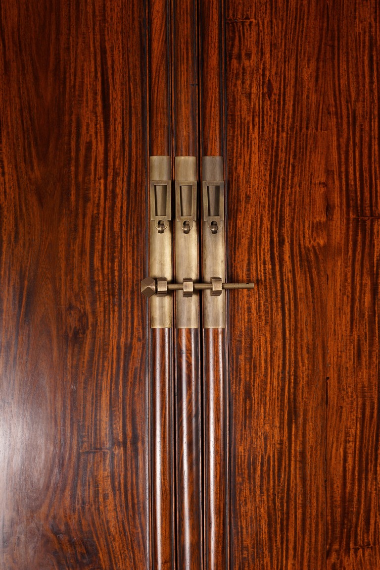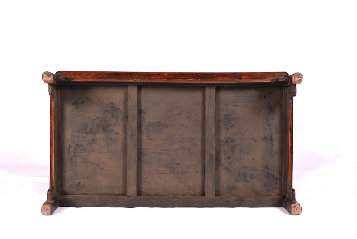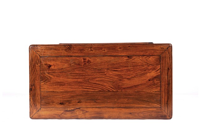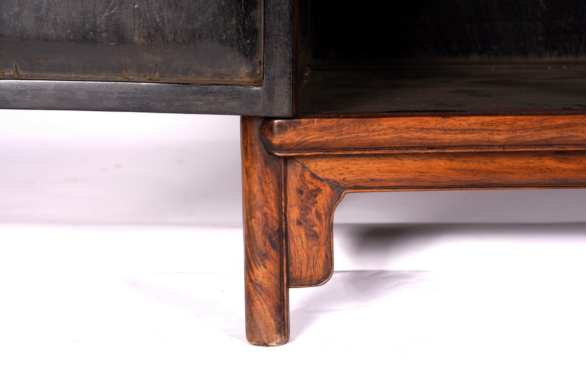 此圓角櫃為方材,以黃花梨製成,造型沉穩,腿足只倒去棱角,沒用線腳,不踩委角線,全身光素無紋,簡潔利落。櫃帽噴出,邊抹上舒下斂,至底壓線,線條硬朗利落。櫃門以格角榫攢邊裝獨板面心,選料奢侈精良,紋理清晰,有鬼面紋、漣漪水波紋。櫃內設三層空間,第二層隔板下裝兩具抽屜,充足的空間成就了它儲物的主要功能,實用性強。兩側櫃幫板一為獨板,一為兩拼。櫃內髹漆,傳遞出濃郁的歷史氣息。四足較高,之間均安光素刀牙板。整器外形簡潔,形態挺拔,線條簡練,製作考究,榫卯嚴謹,包漿紅潤,保存完整。