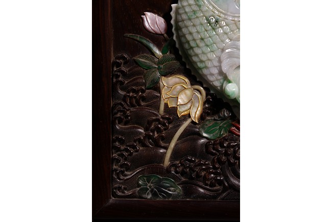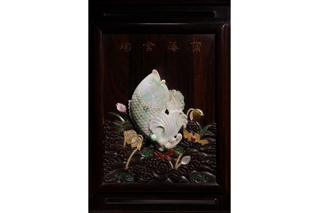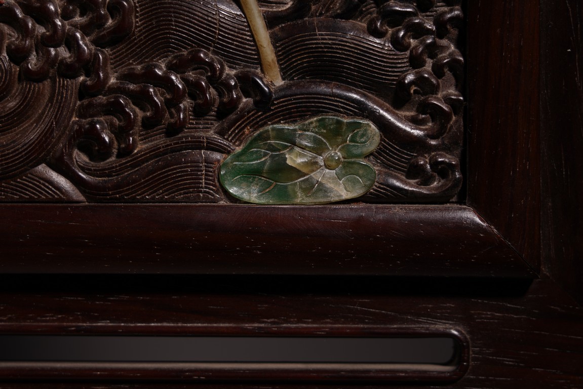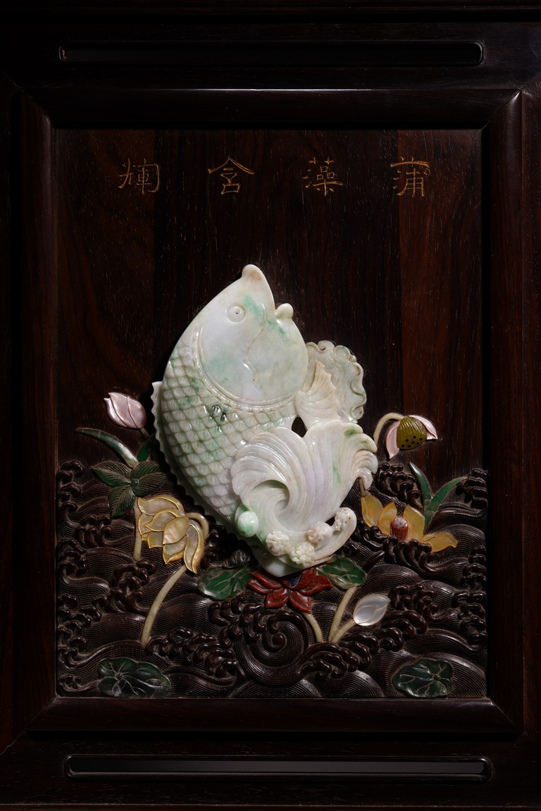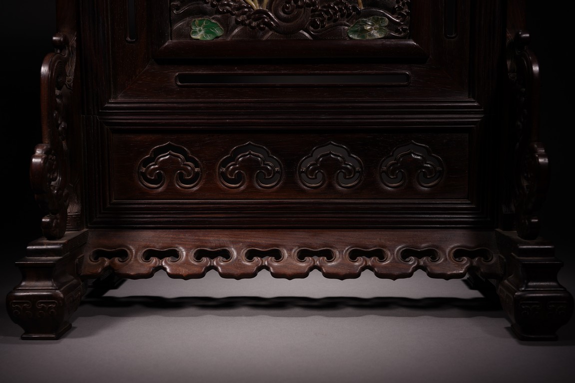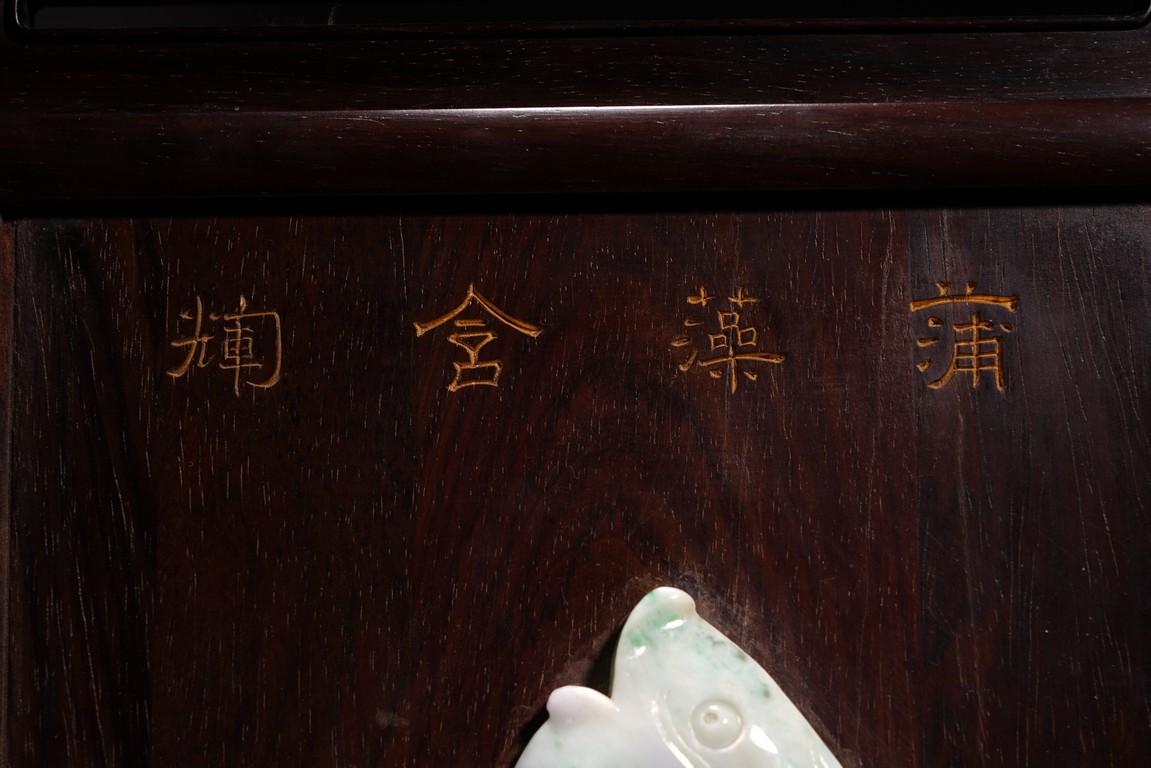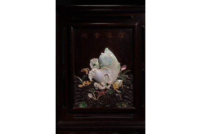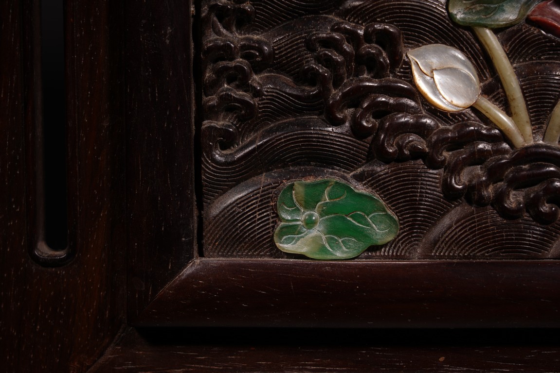 以紅木為材,制器形碩大的插屏,一面屏心為鯉魚、蓮花、荷葉及波浪紋等,紋飾以翡翠、南紅、鏍鈿鑲嵌,屏心正面上部刻“蒲藻含輝”四字,背面刻詩一首。整體製作精湛,細節刻畫精緻細膩,逼真靈動,栩栩如生,一絲不苟。
