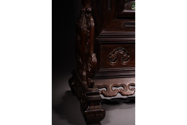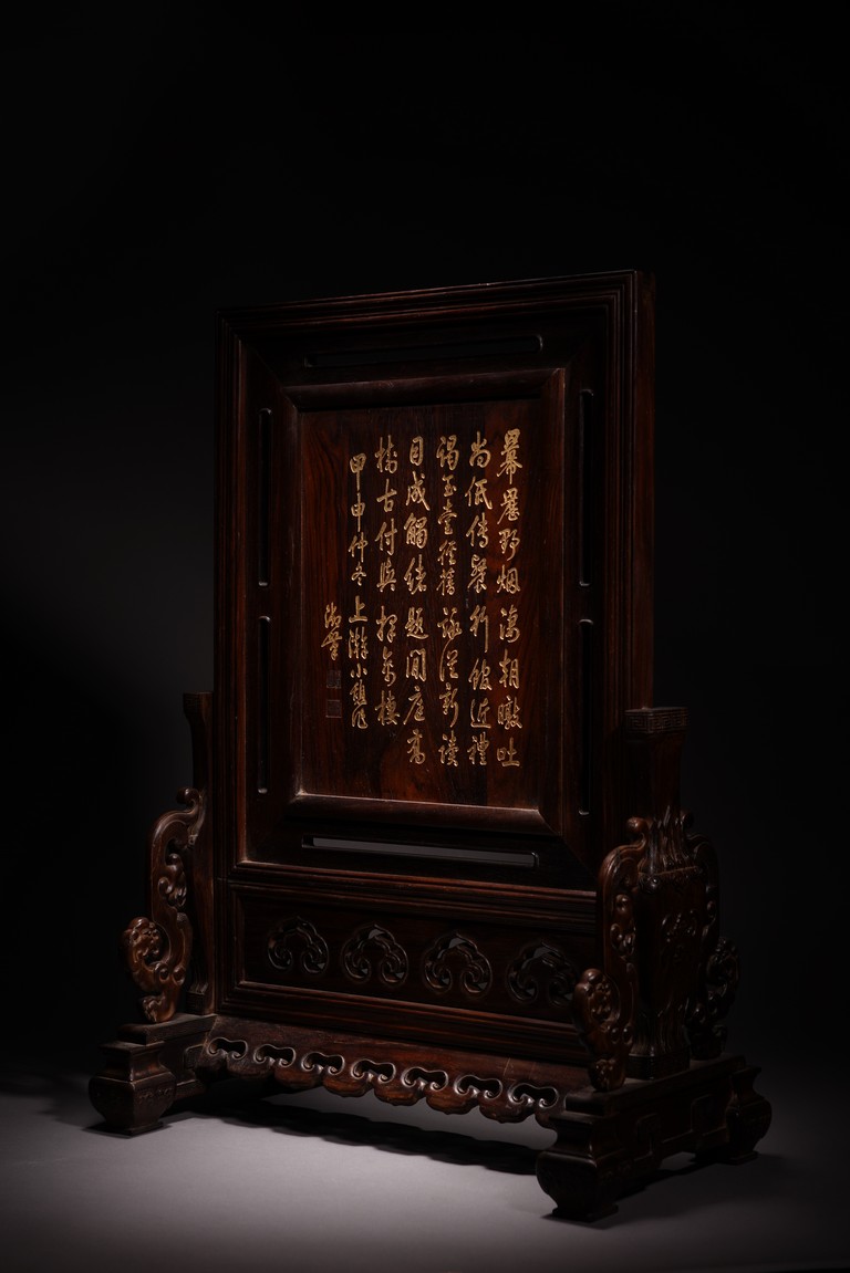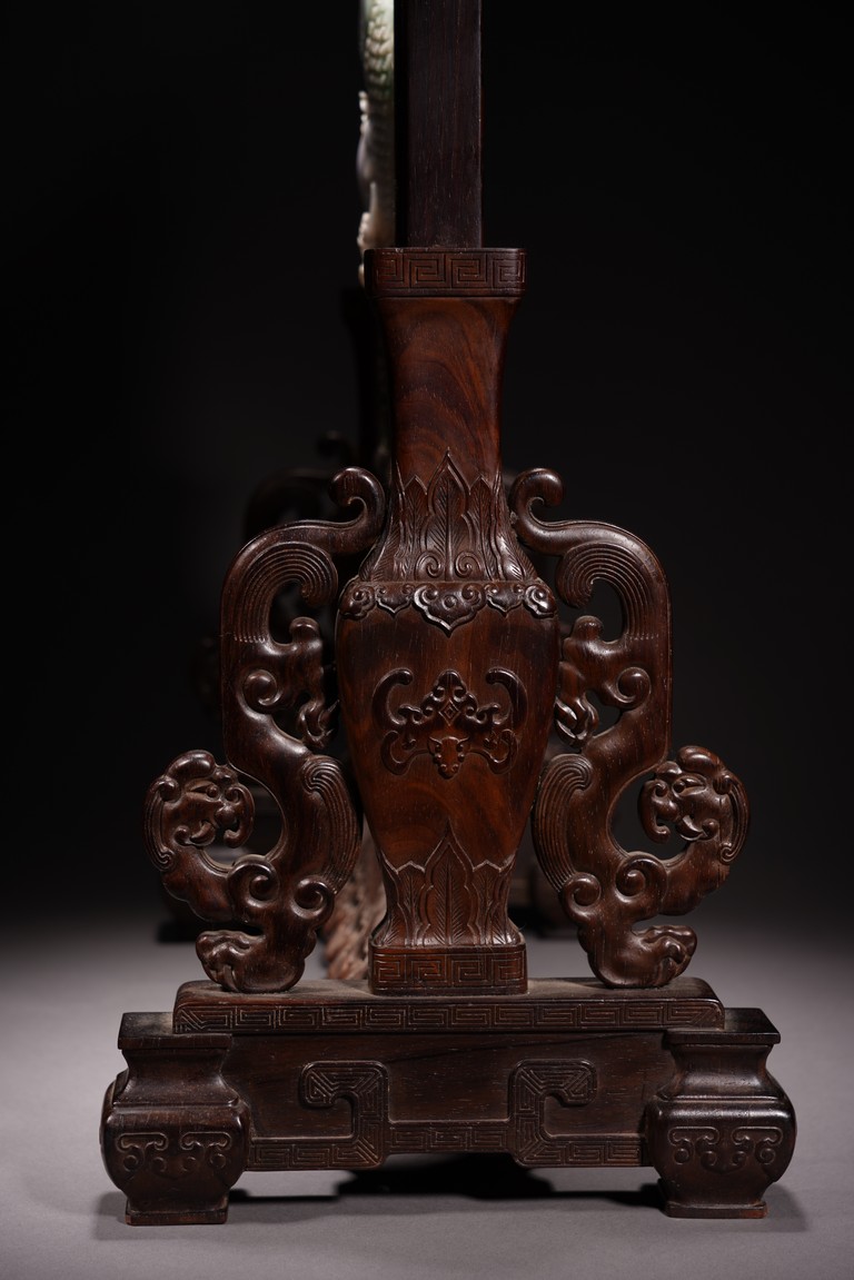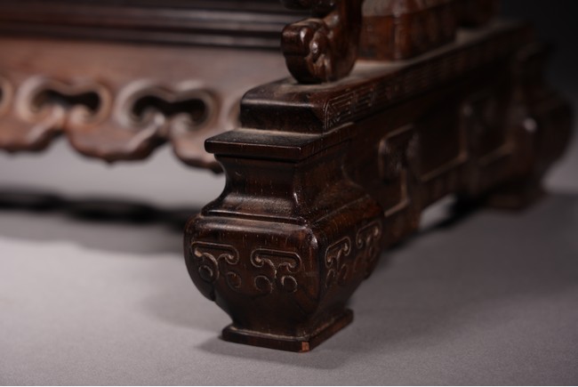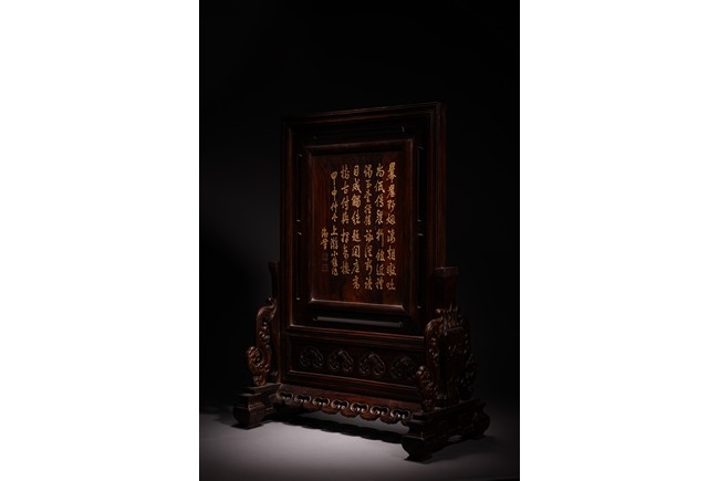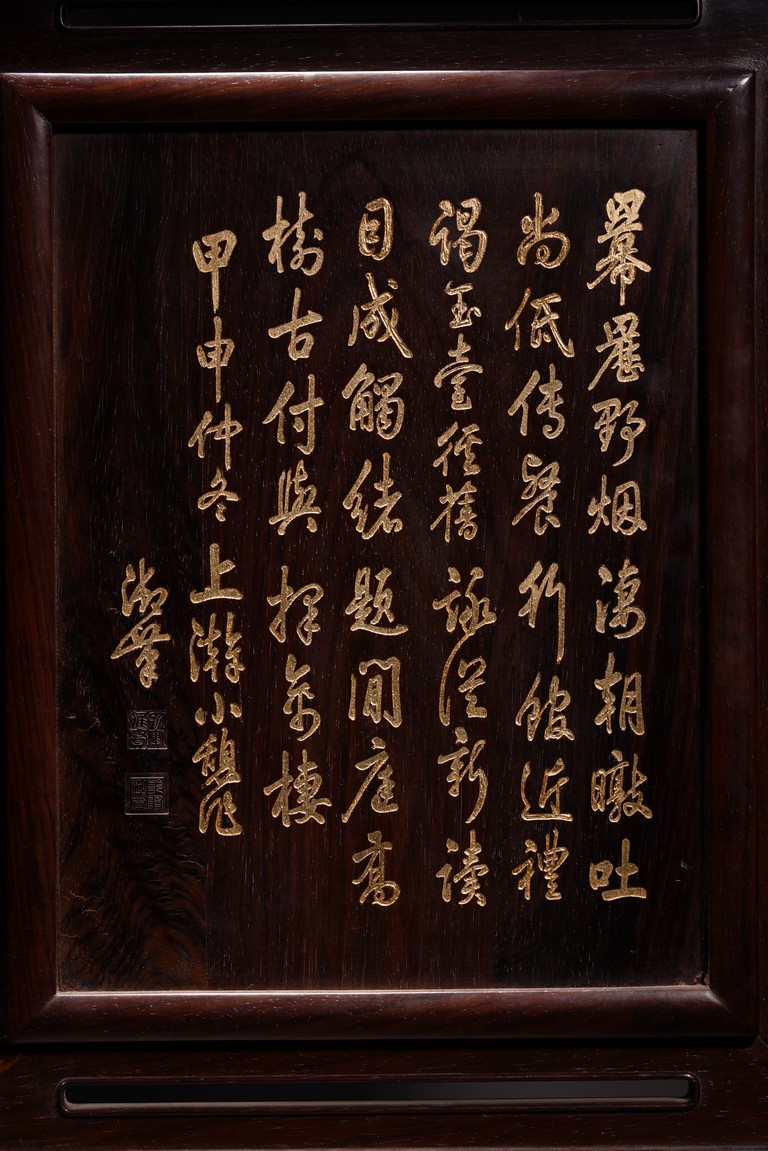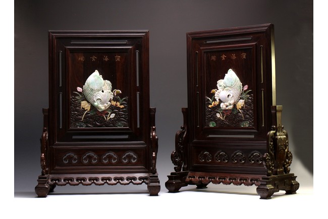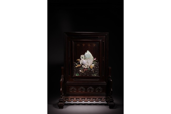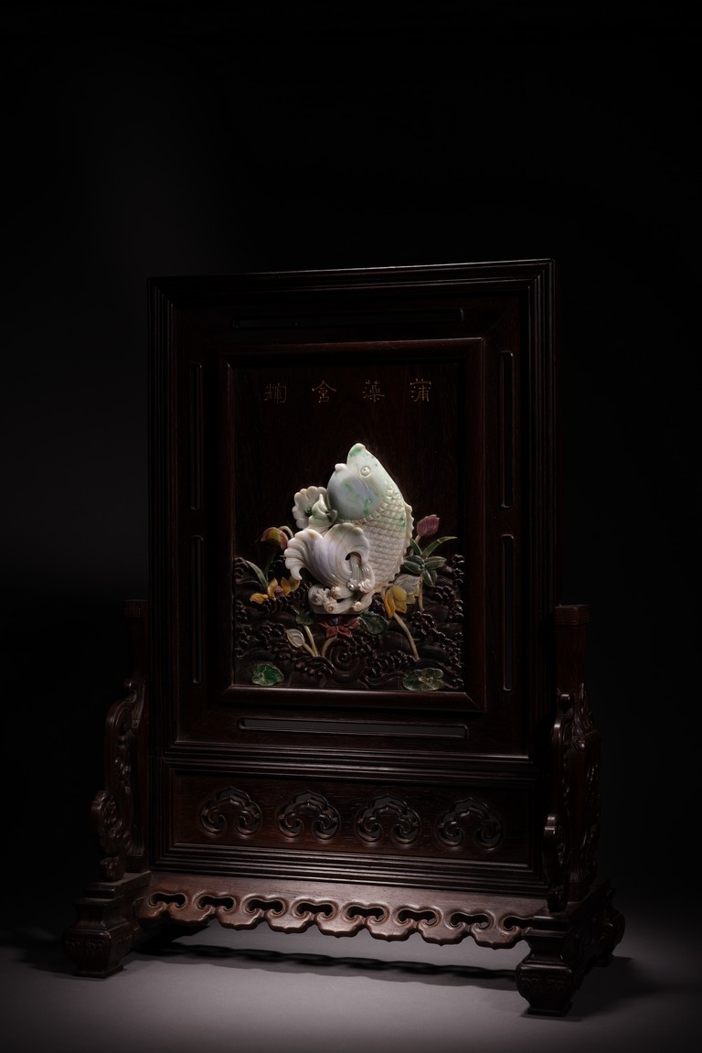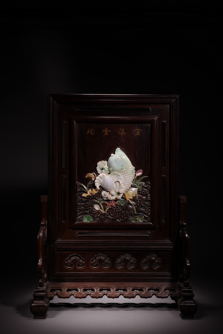 以紅木為材,制器形碩大的插屏,一面屏心為鯉魚、蓮花、荷葉及波浪紋等,紋飾以翡翠、南紅、鏍鈿鑲嵌,屏心正面上部刻“蒲藻含輝”四字,背面刻詩一首。整體製作精湛,細節刻畫精緻細膩,逼真靈動,栩栩如生,一絲不苟。