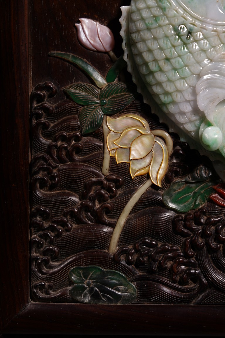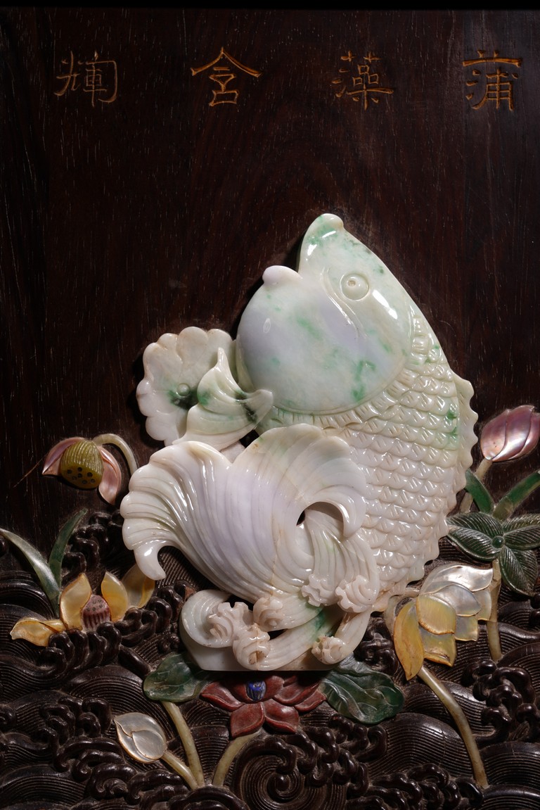 Of rectangular form, the hardwood panel inlaid with jadeite, agate, mother of pearl, and spinach green jades to depict a carp leaping from water, below four character in gilt, the reverse inscribed with running script poem.