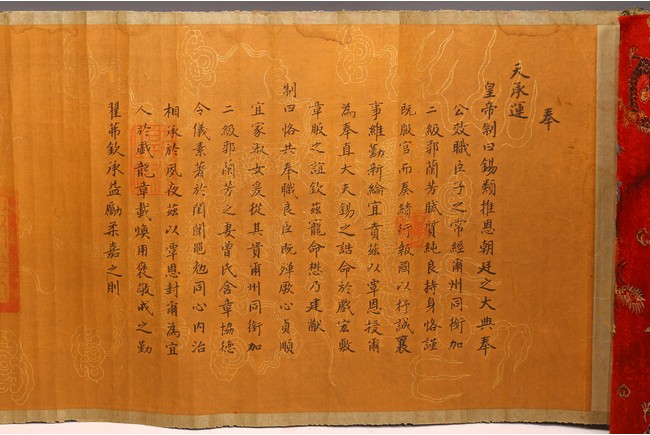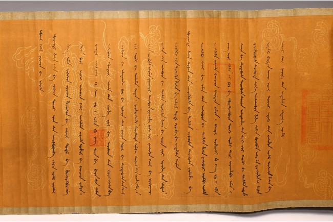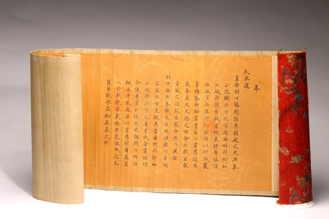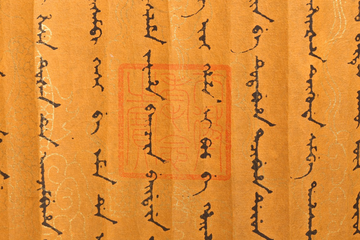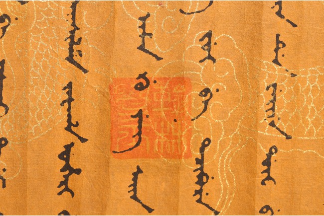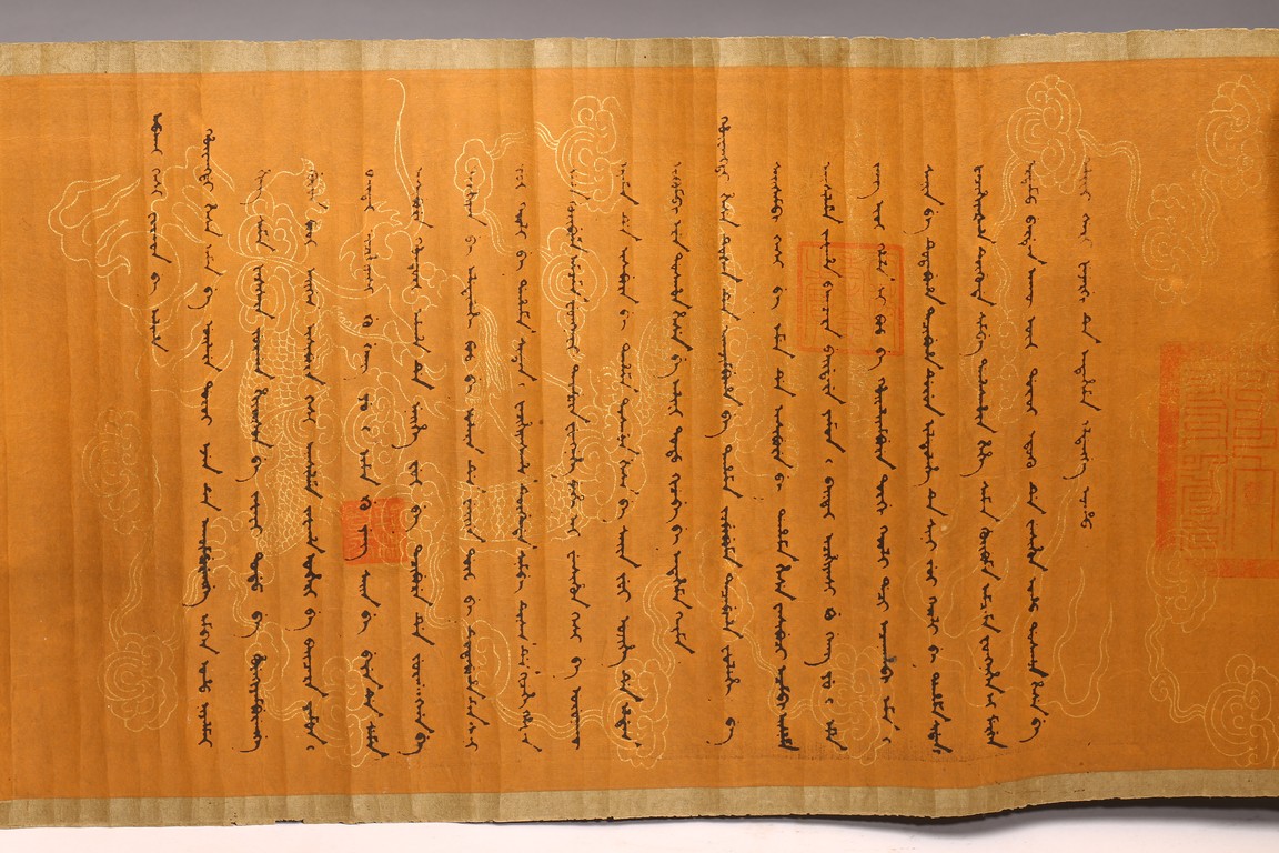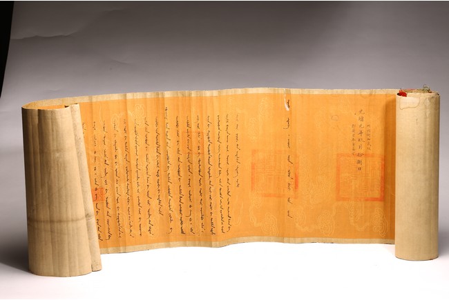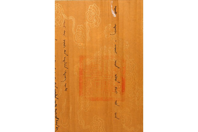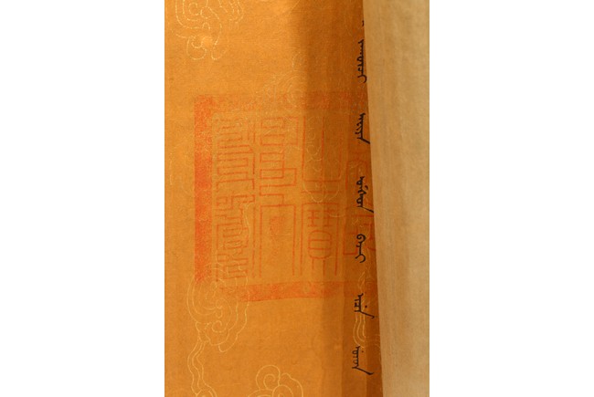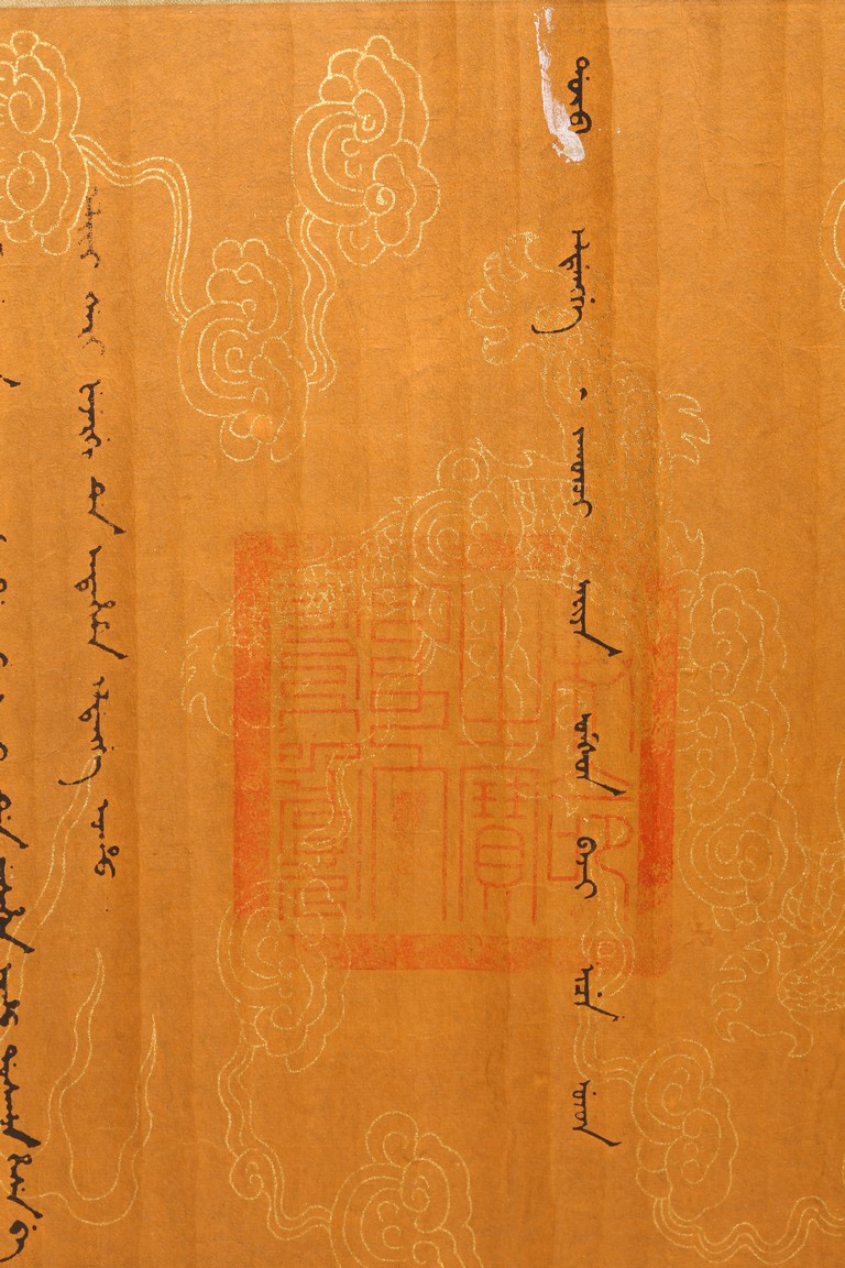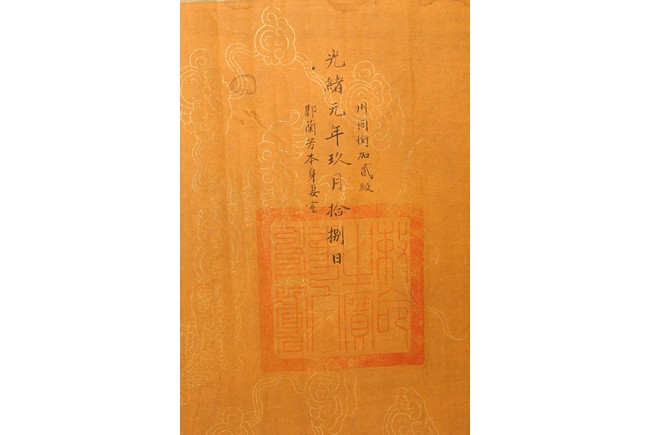 Written in gilt and ink on a woven silk brocade with both Manchurian and Chinese, corresponding to first year of Guangxu reign, 1875.