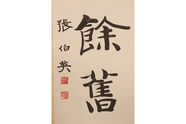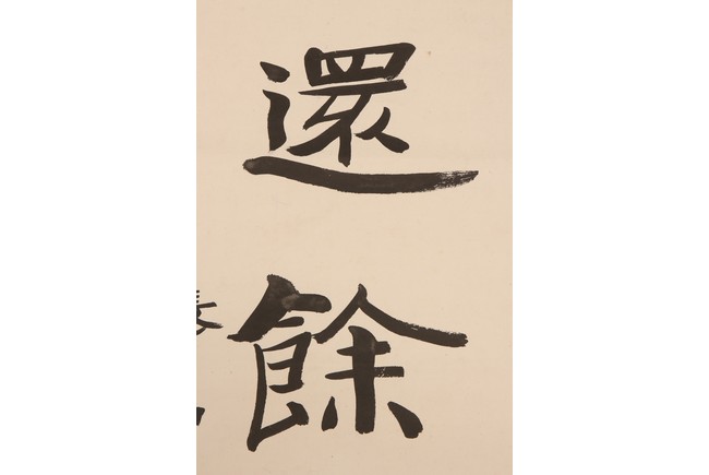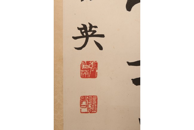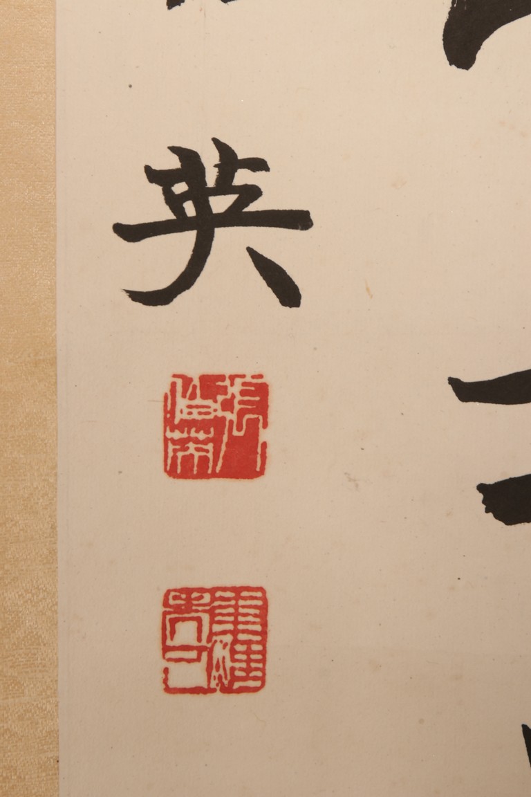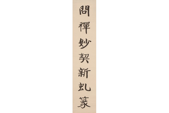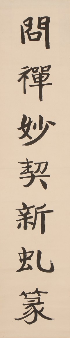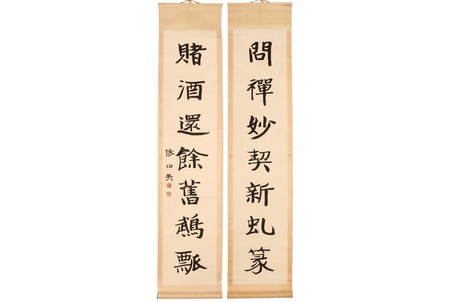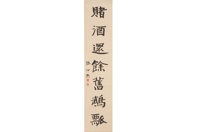 Ink on paper. Hanging scroll. Seven character regular script calligraphy couplet. Signed Zhang Boying with two seal marks. Attributed to Zhang Boying.