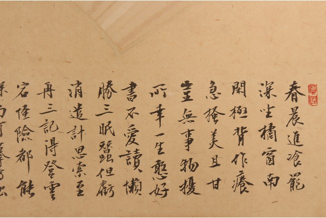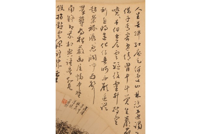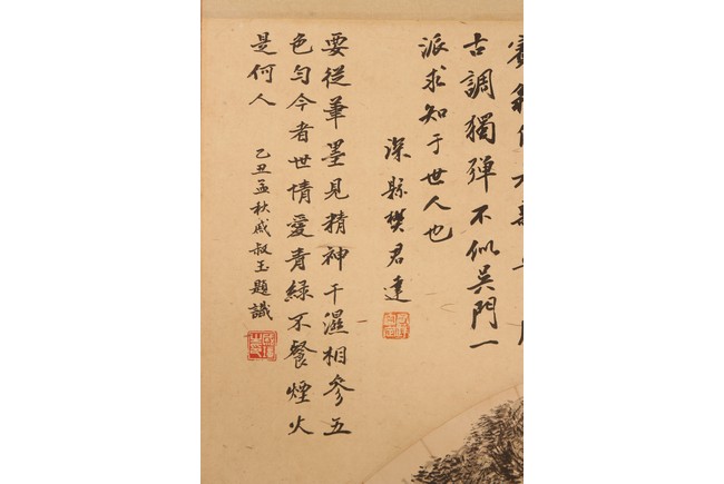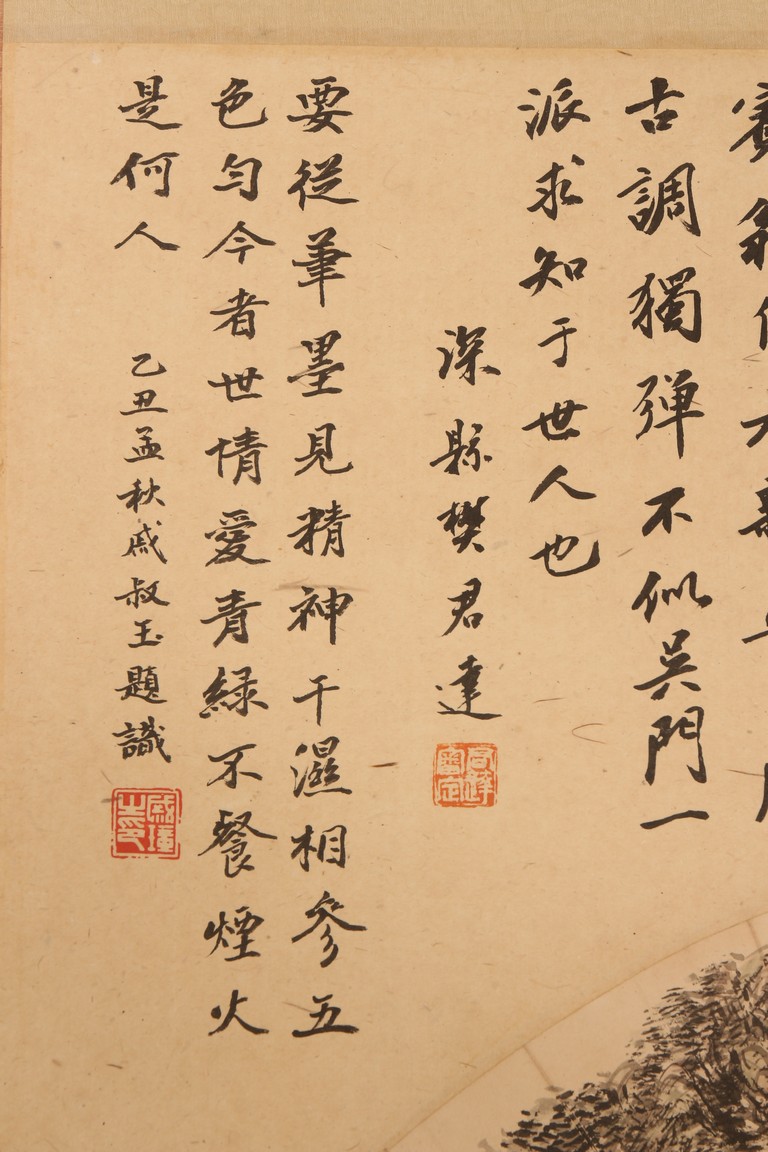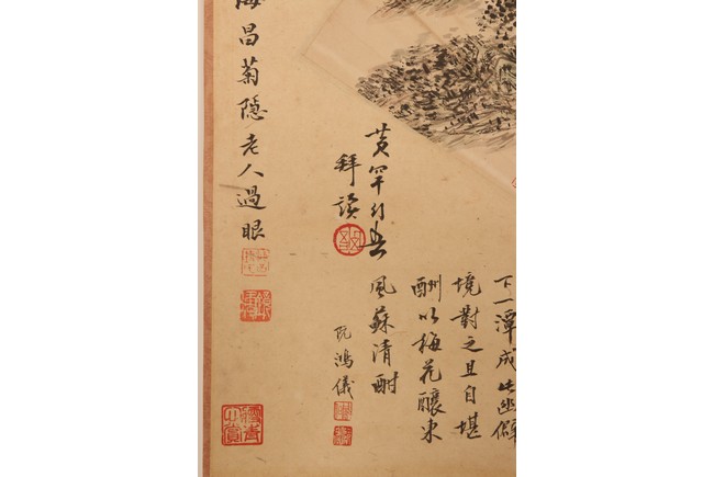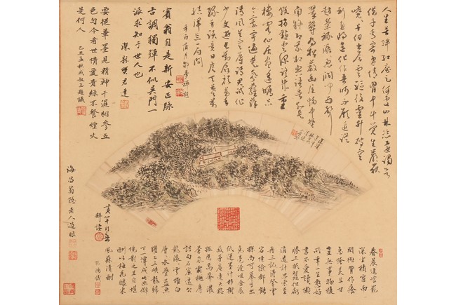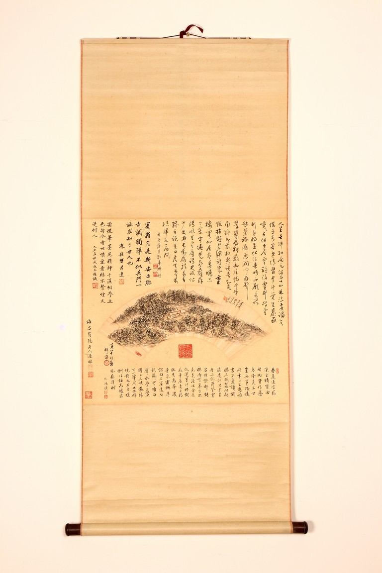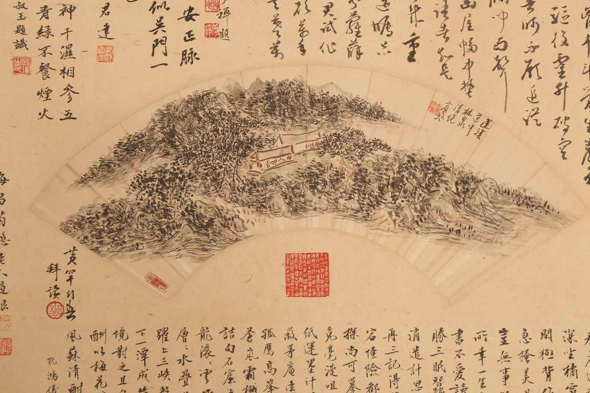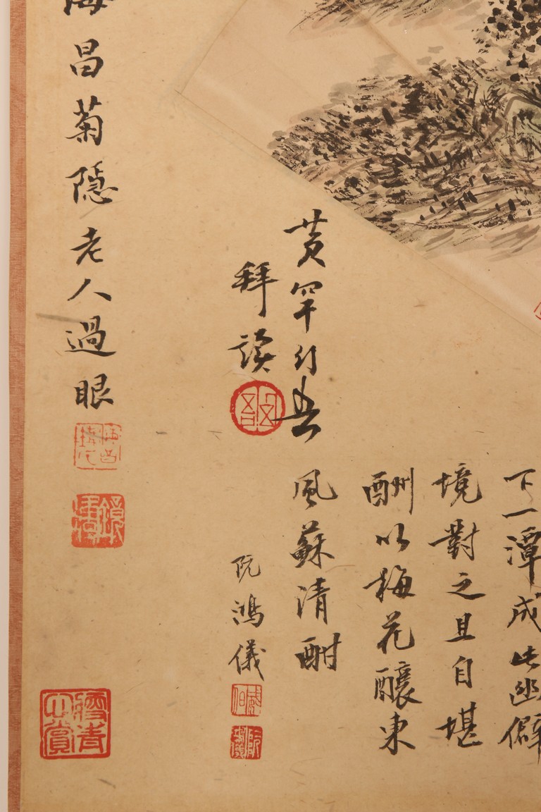 Ink on paper. Landscape fan painting. Hanging scroll. Inscribed and signed Binhong with two seal marks, surrounded by annotations and comments by various collectors and scholars with seal marks.