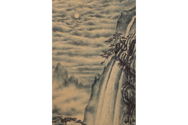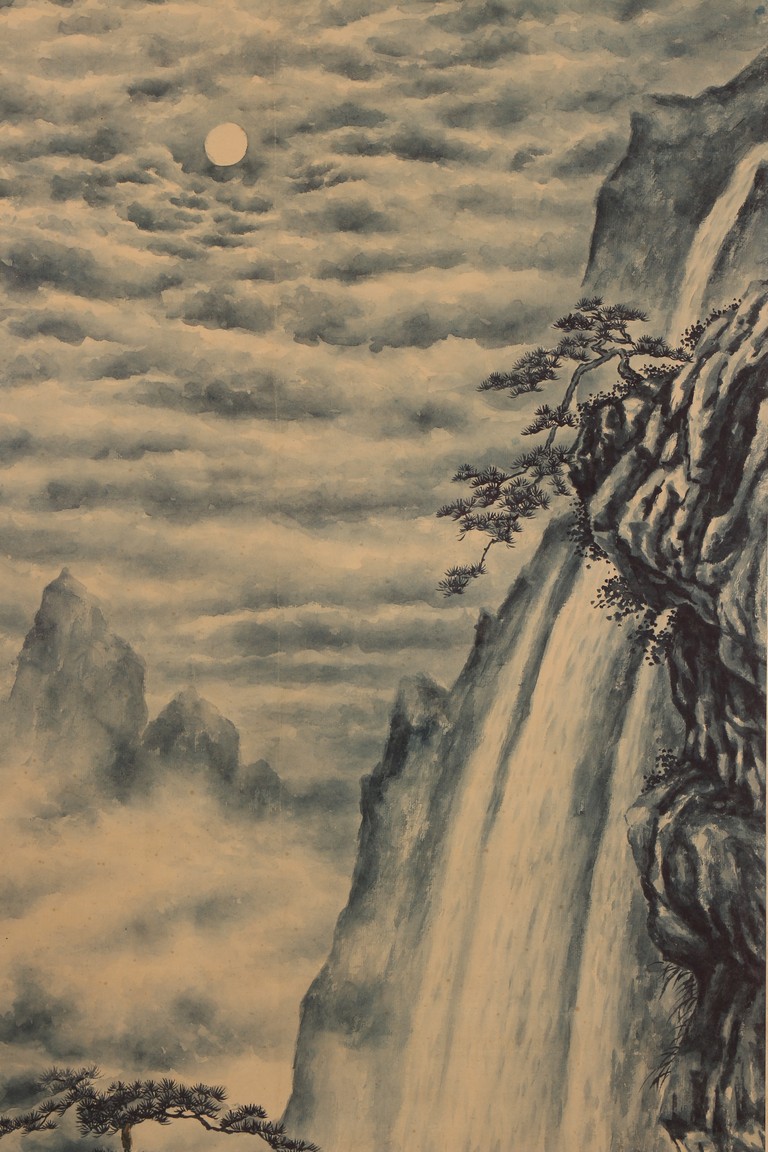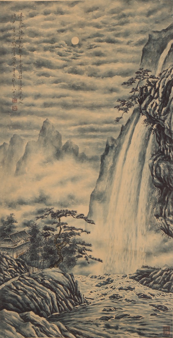 Color and ink on paper. Hanging scroll. Cold river under the moonlight. Inscribed and signed Tao Lengyue, with three seals of the artist.