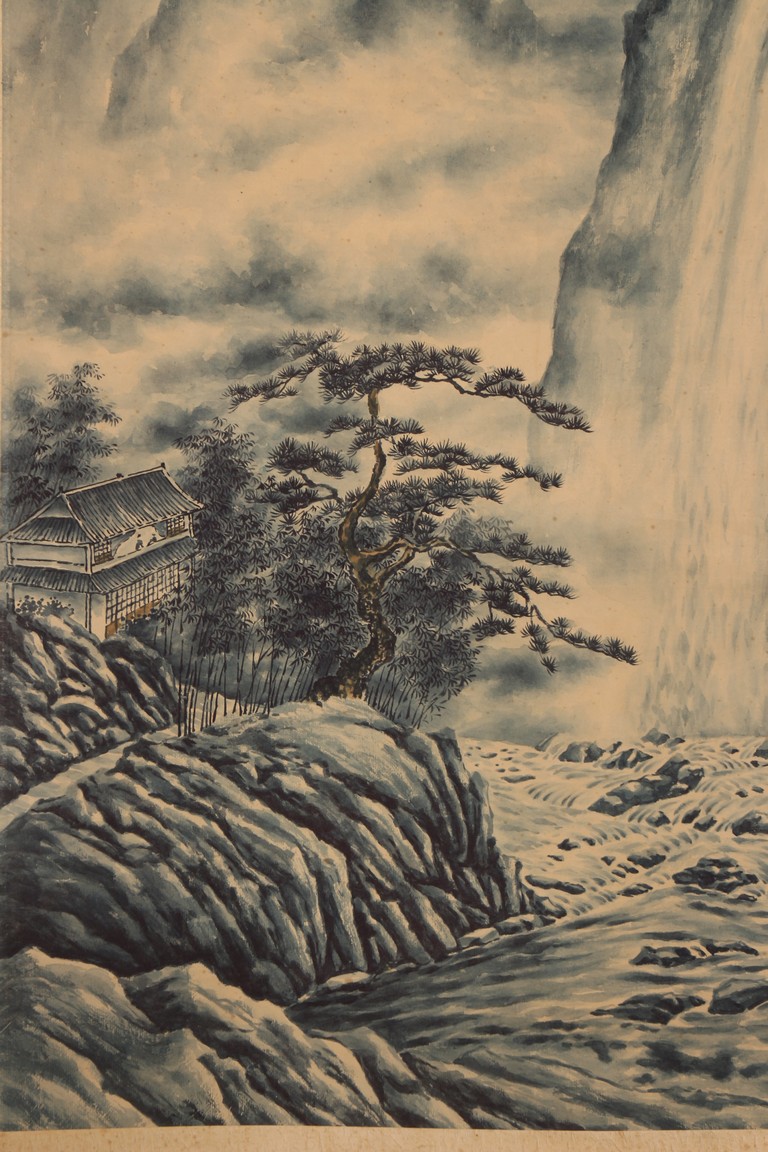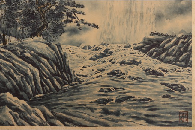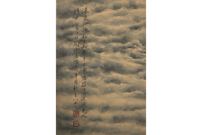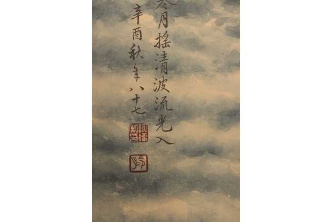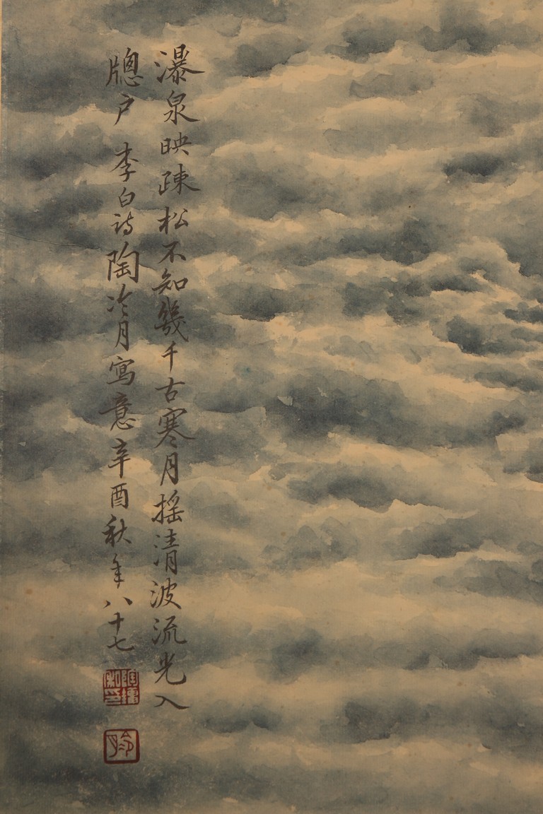 題識:瀑泉映疎松不知幾千古寒月搖清波流光入卜片悤戶 李白陶冷月寫意辛酉秋年八十七。鈐印:陶鏞之印,冷月。