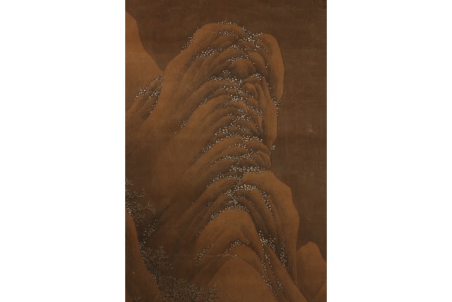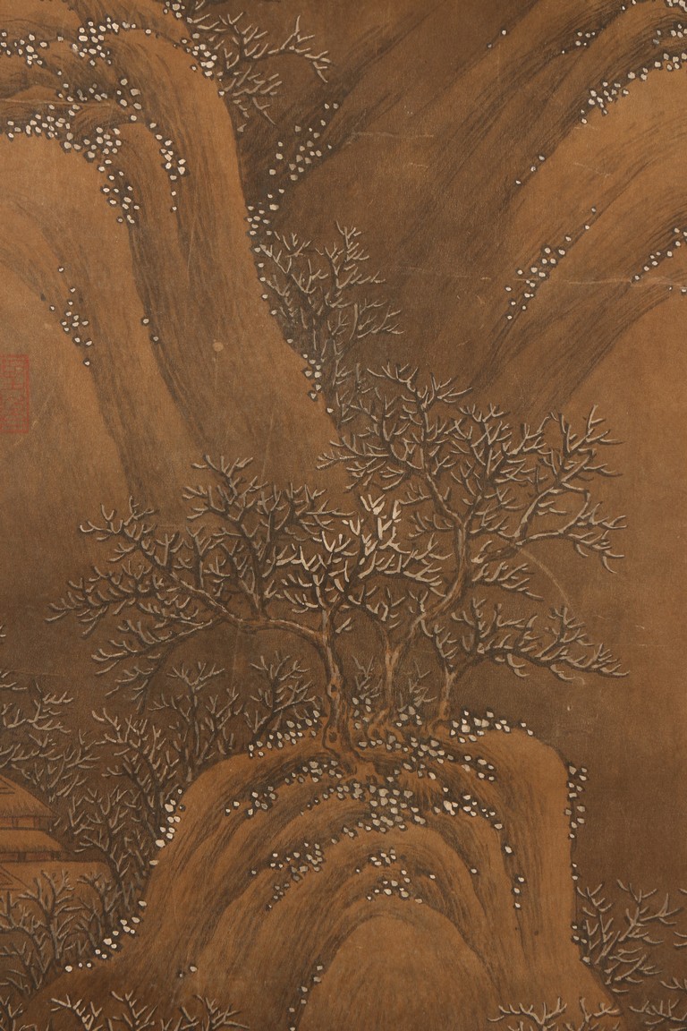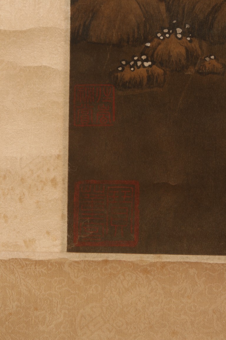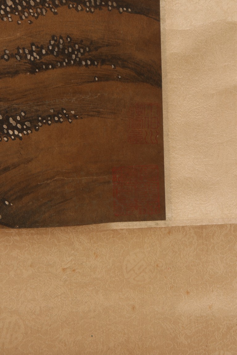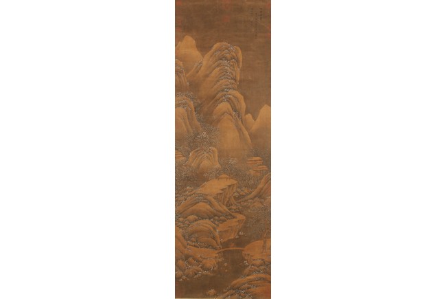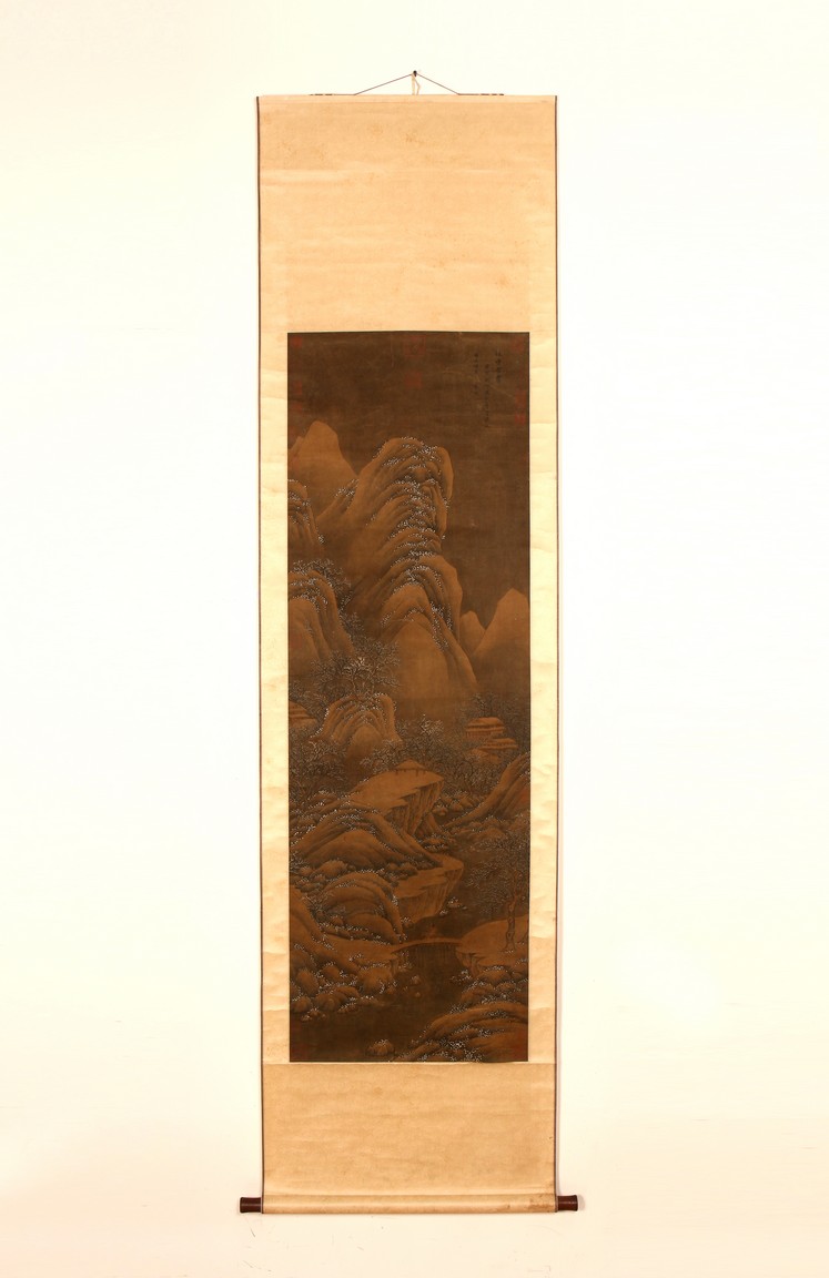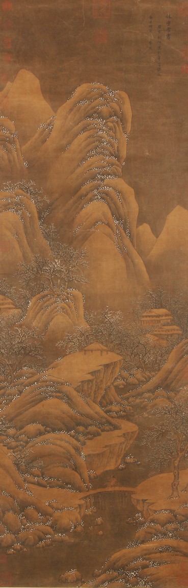 Ink and color on silk. Hanging scroll. Snow Landscape. Inscribed and signed Li Cheng with various seal marks of artist and collectors. Attributed to Lan Ying.