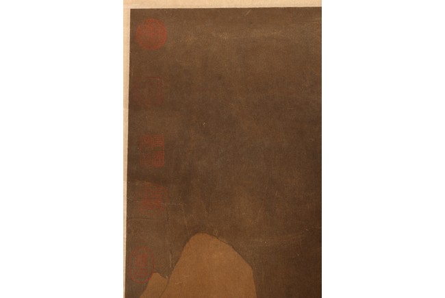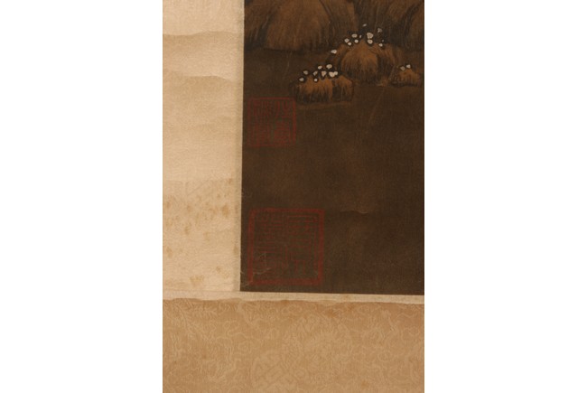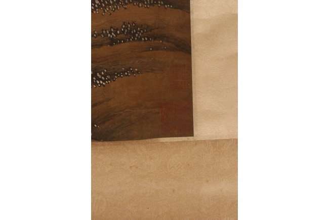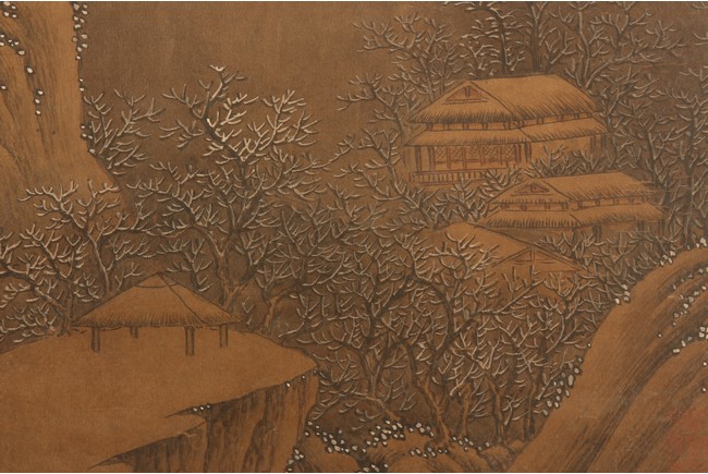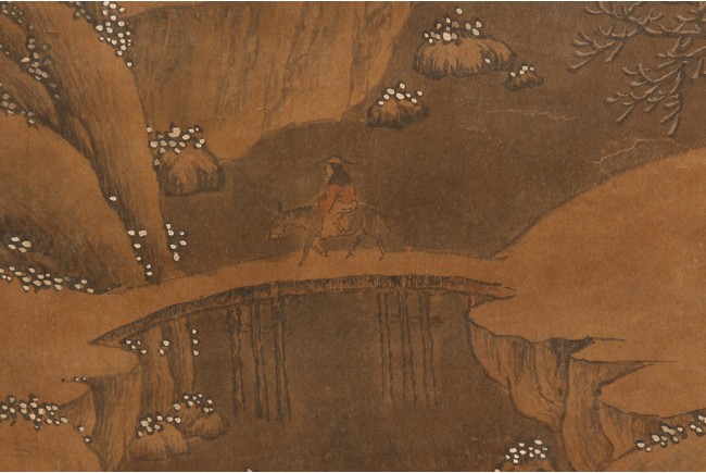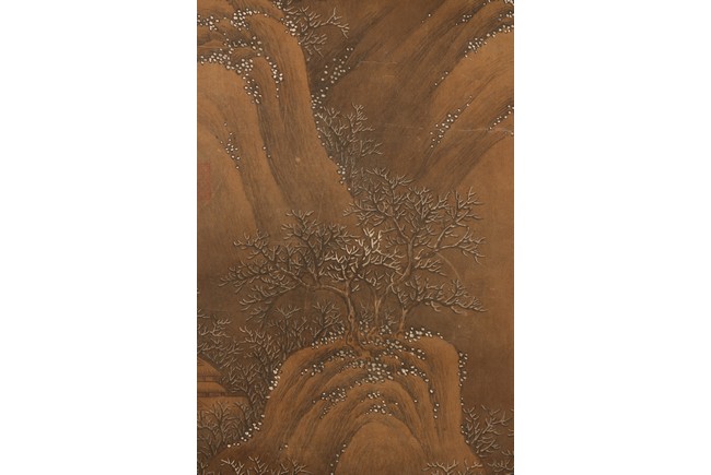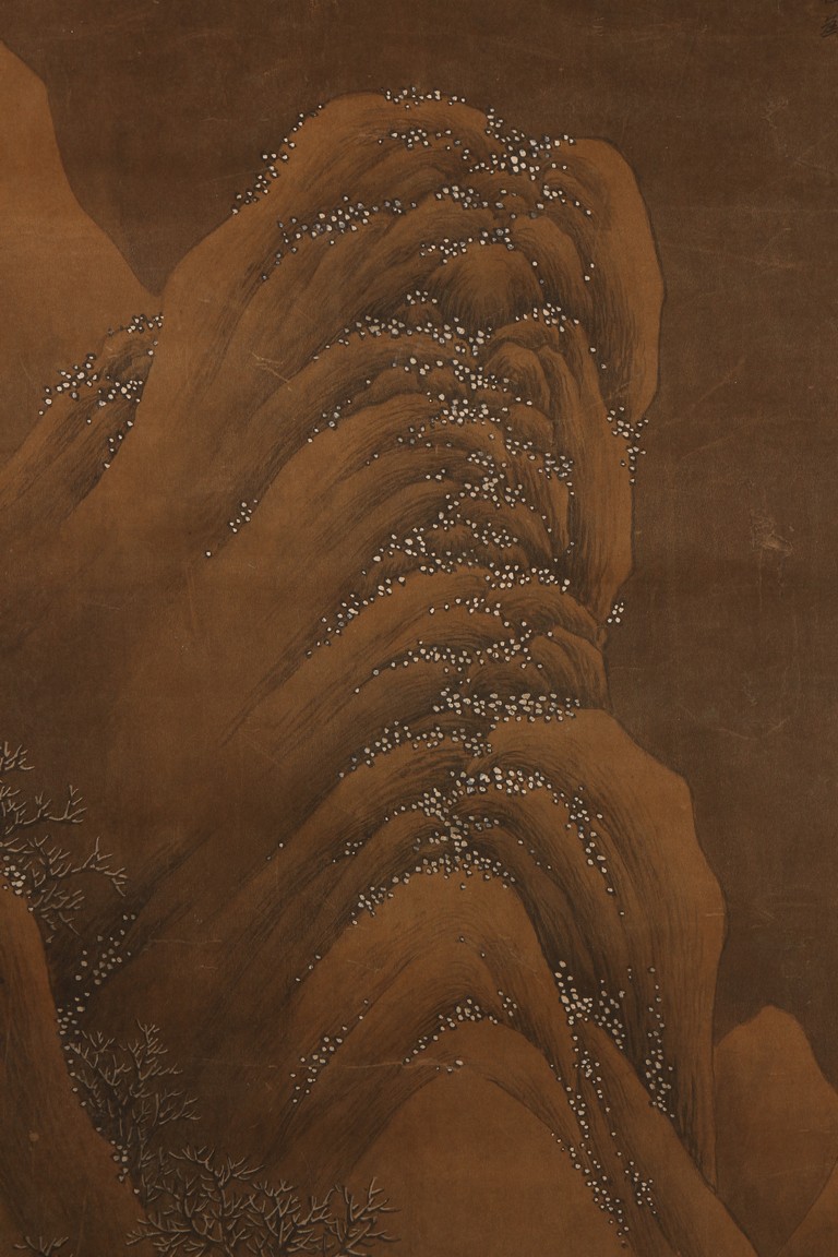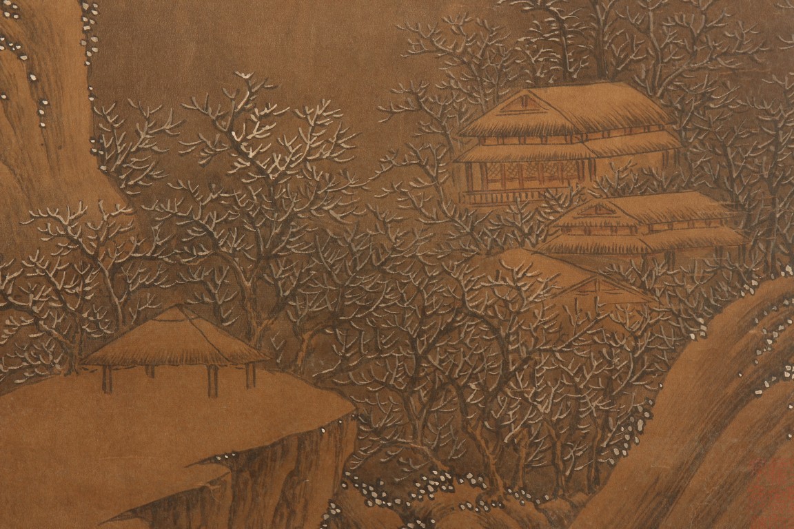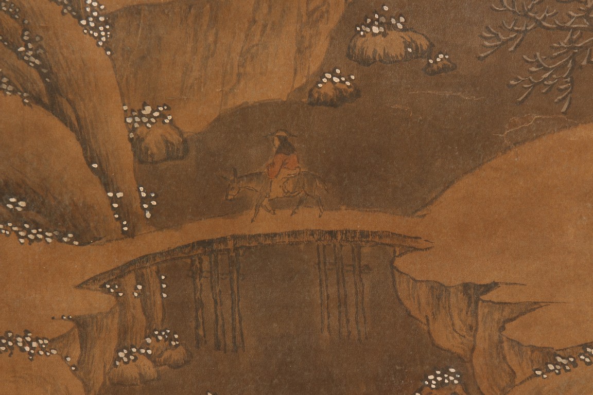 Ink and color on silk. Hanging scroll. Snow Landscape. Inscribed and signed Li Cheng with various seal marks of artist and collectors. Attributed to Lan Ying.