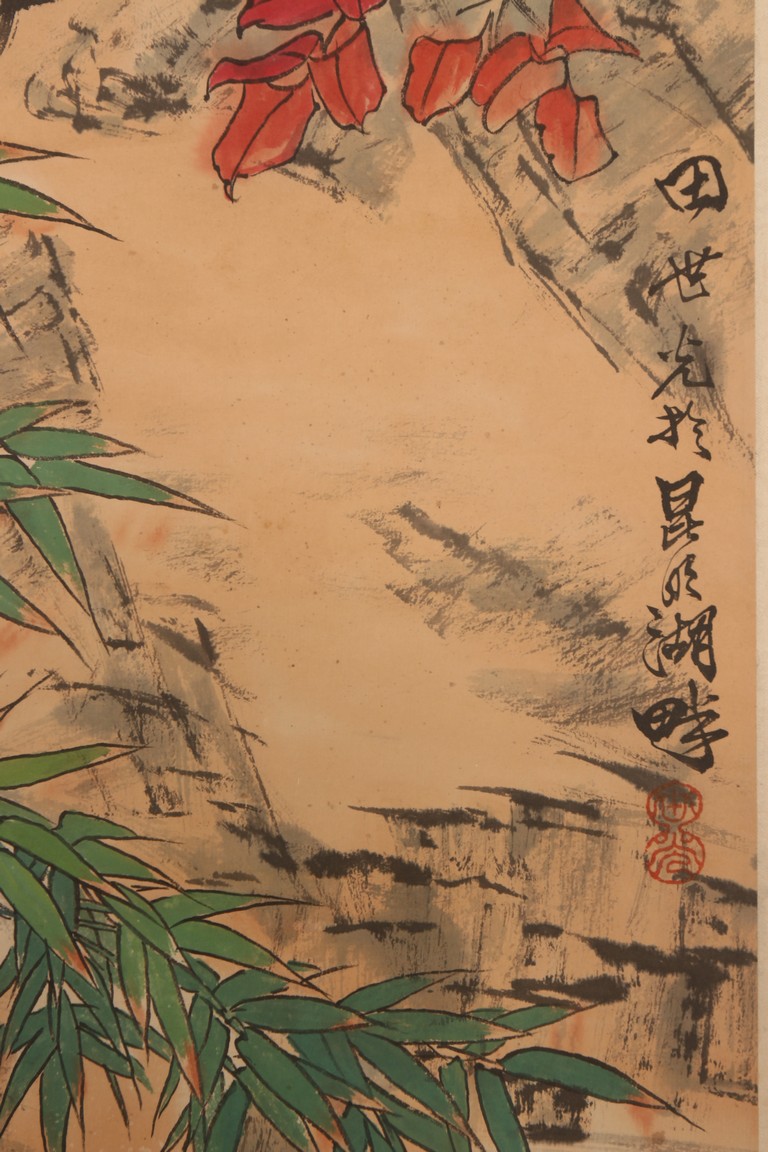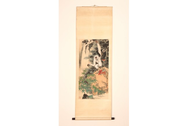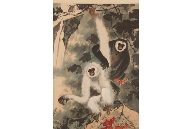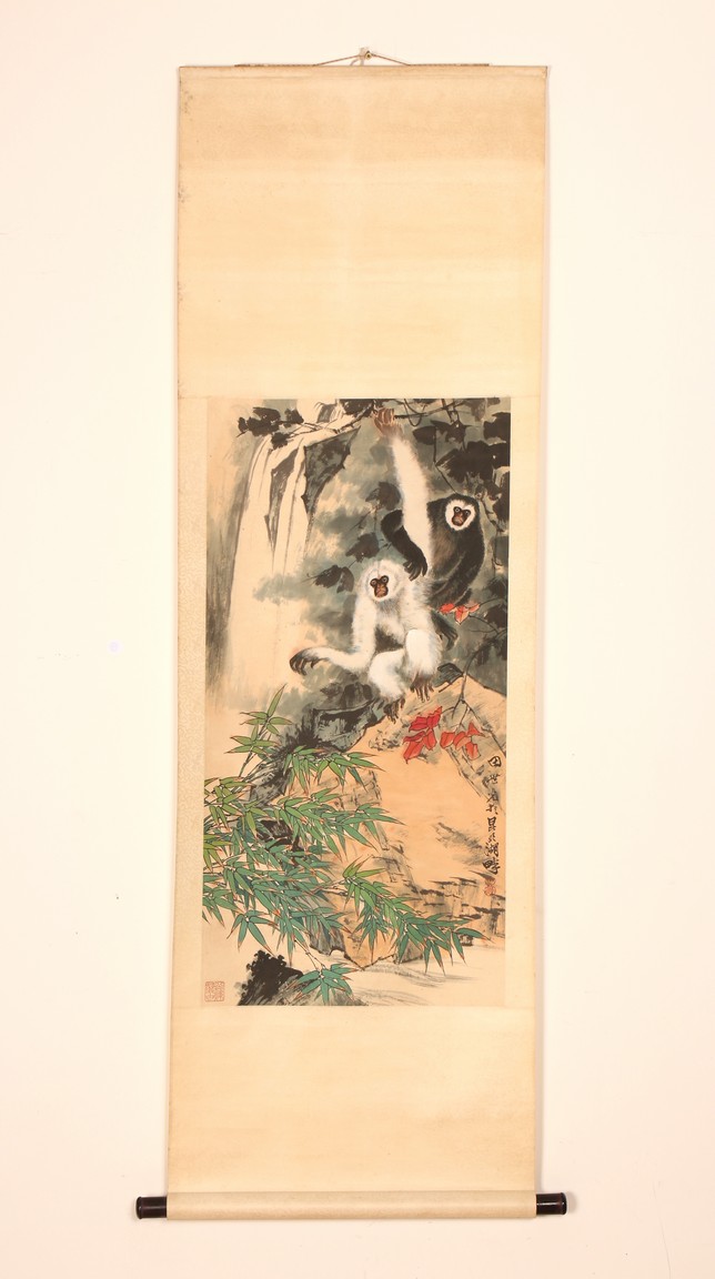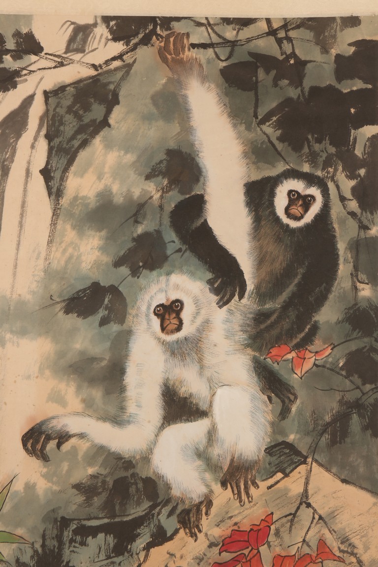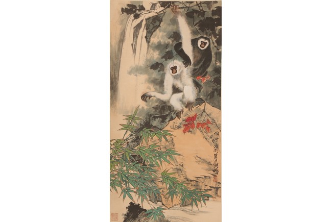 COLOR AND INK ON PAPER 'GIBBONS' PAINTING, TIAN SHIGUANG 田世光 猿猴圖 設色紙本 立軸