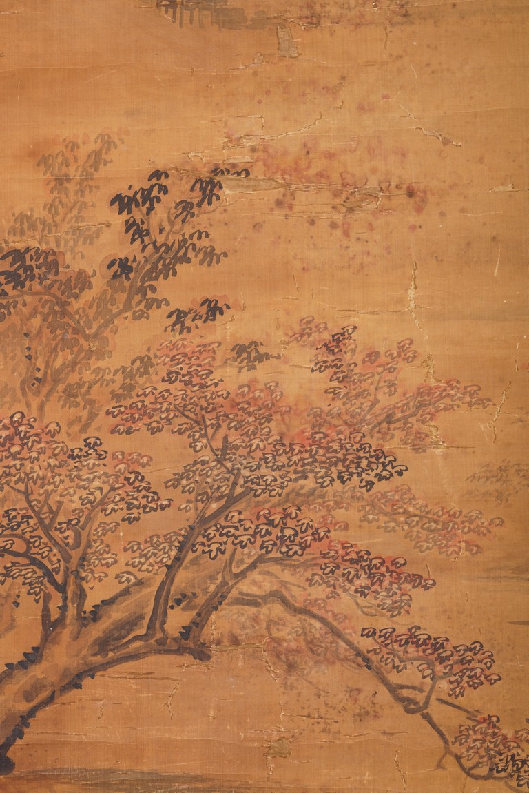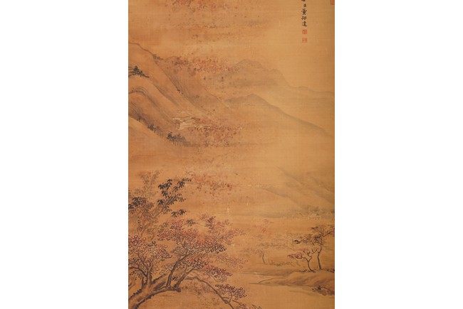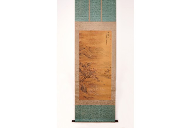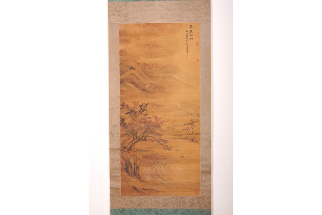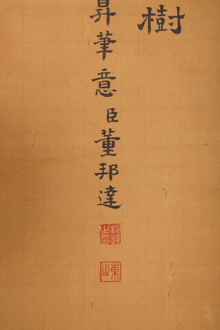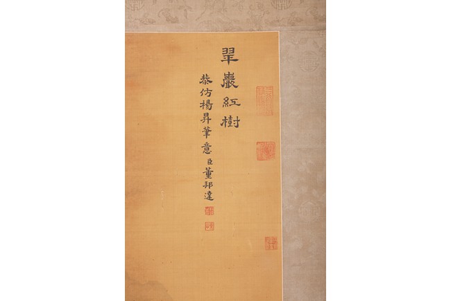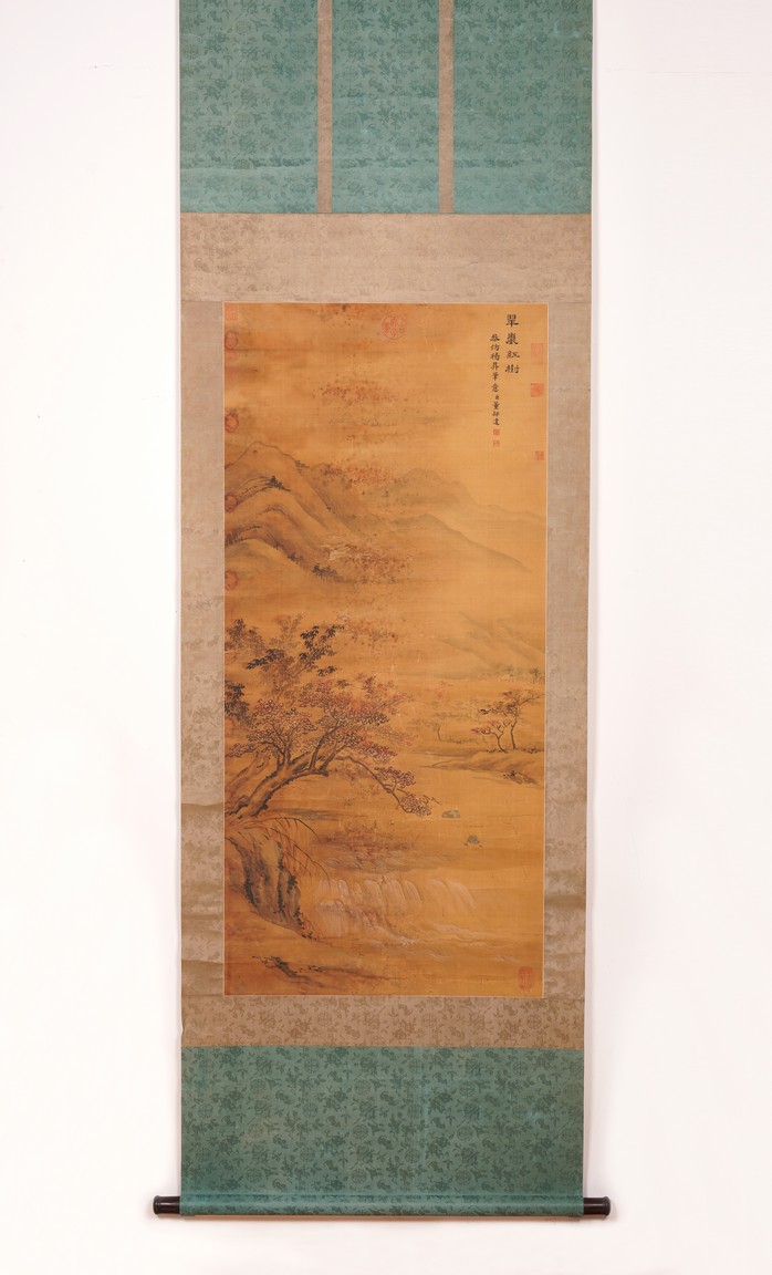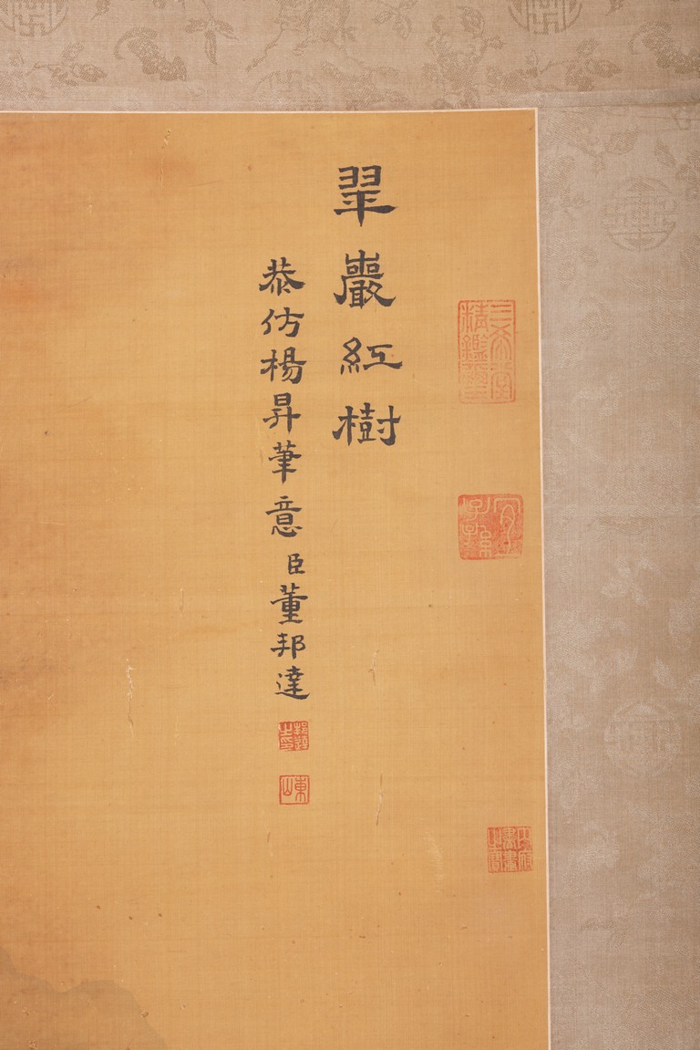 Color and ink on silk. Green Rocks and Red Trees. Hanging scroll. Inscribed and signed Dong Bangda, with eight seal marks.