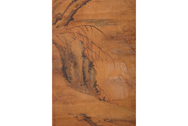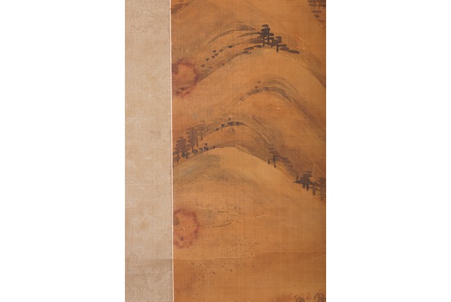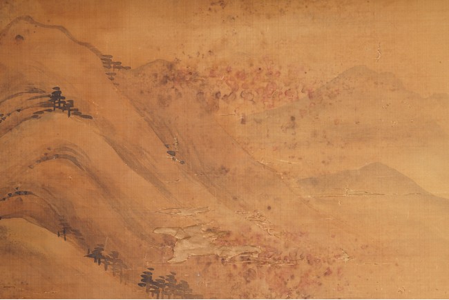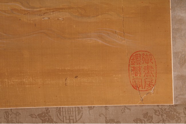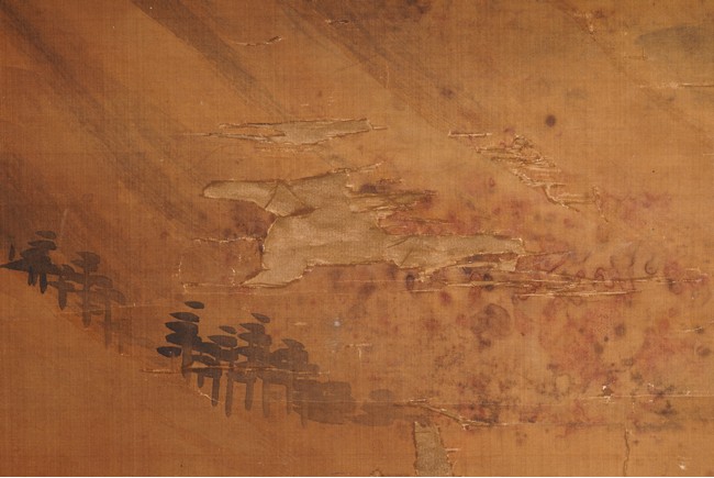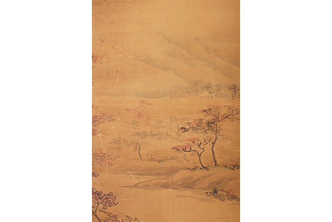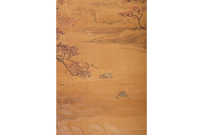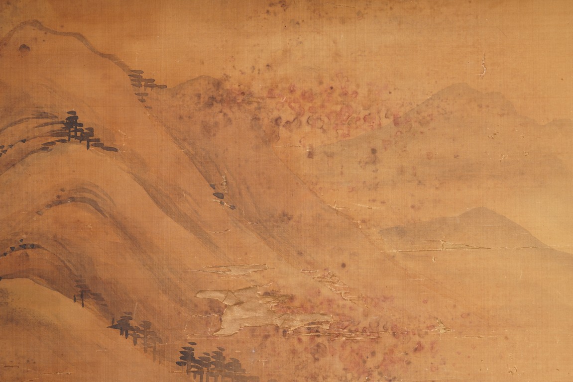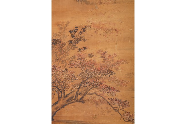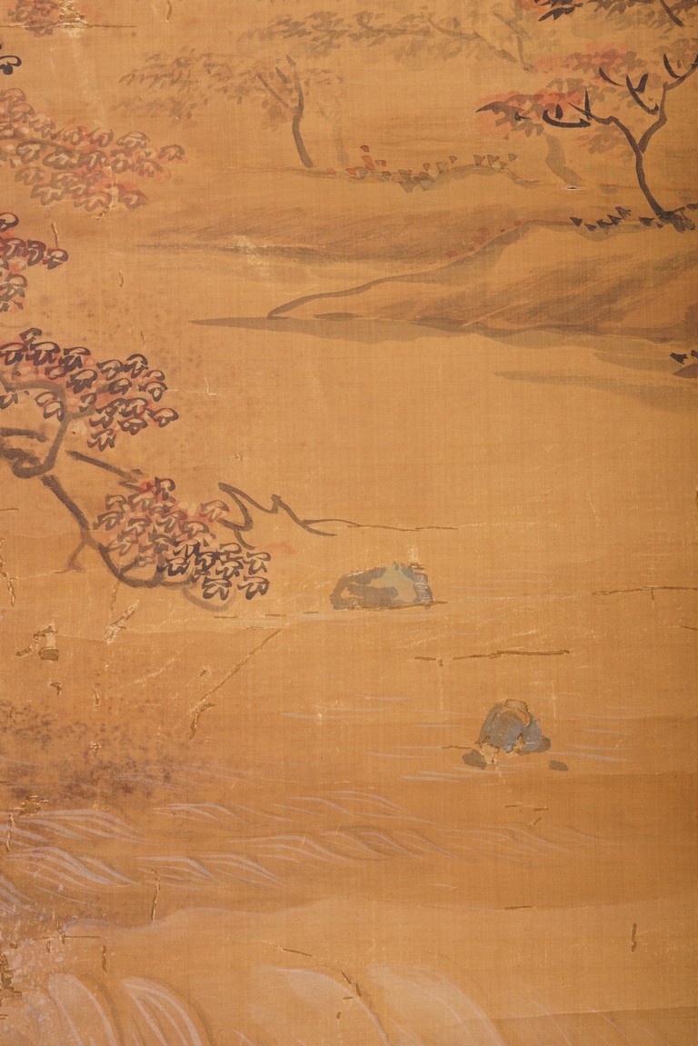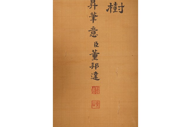 Color and ink on silk. Green Rocks and Red Trees. Hanging scroll. Inscribed and signed Dong Bangda, with eight seal marks.