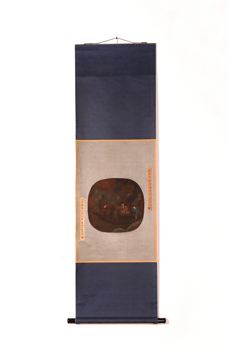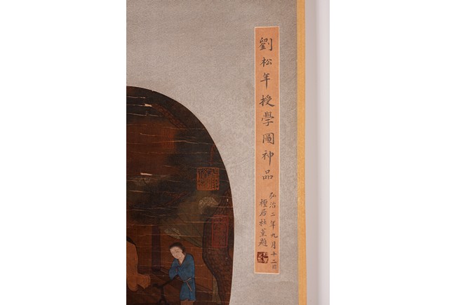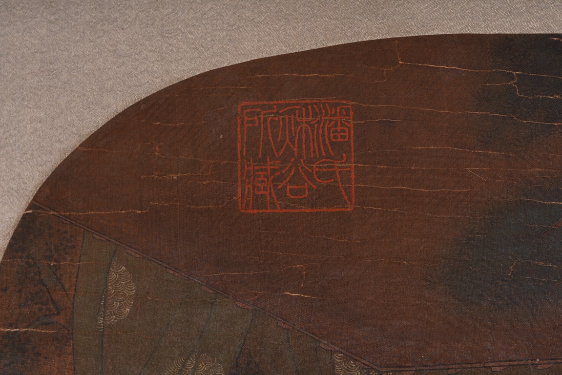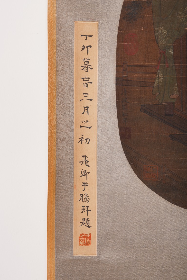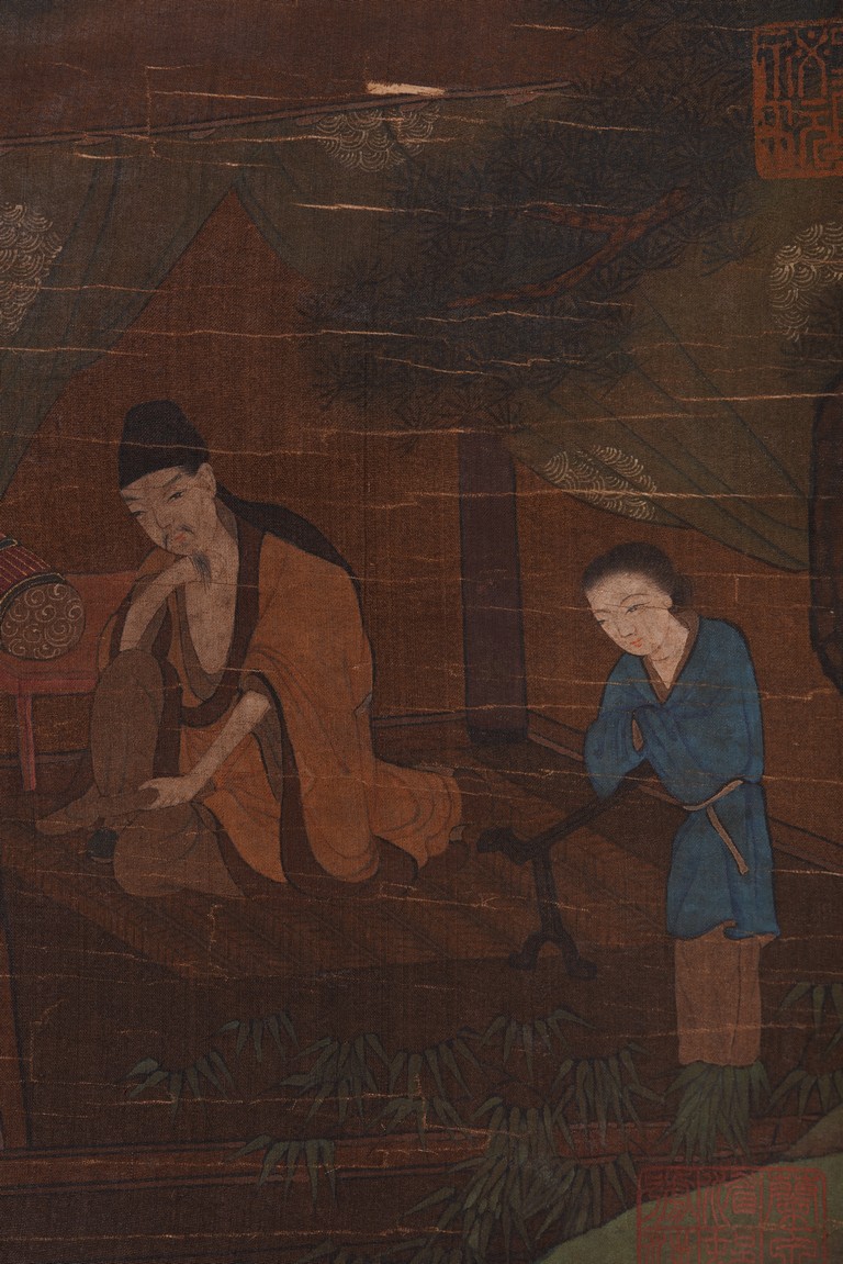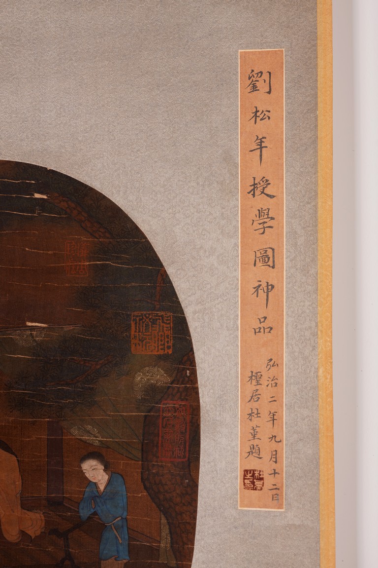 Color and ink on silk. Figures. Hanging scroll. Signed and attributed to Liu Songnian.with one seal of the artist and five seals of the collector.