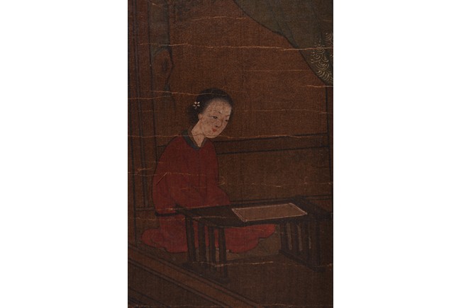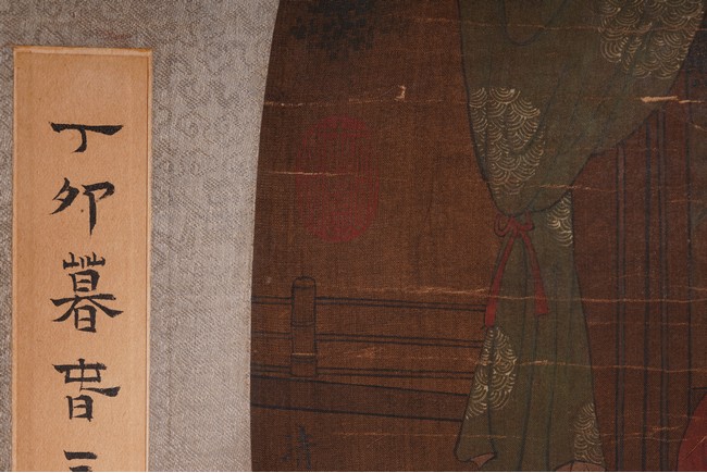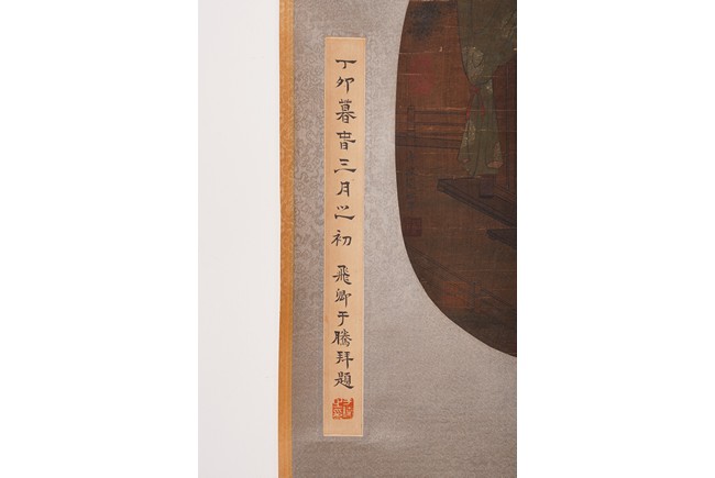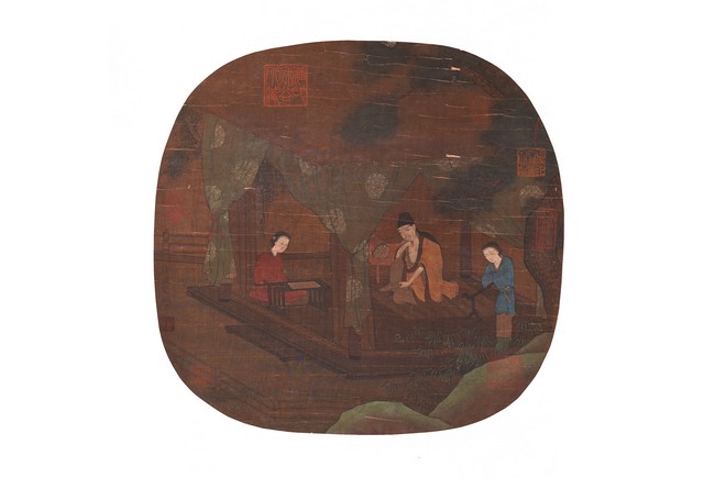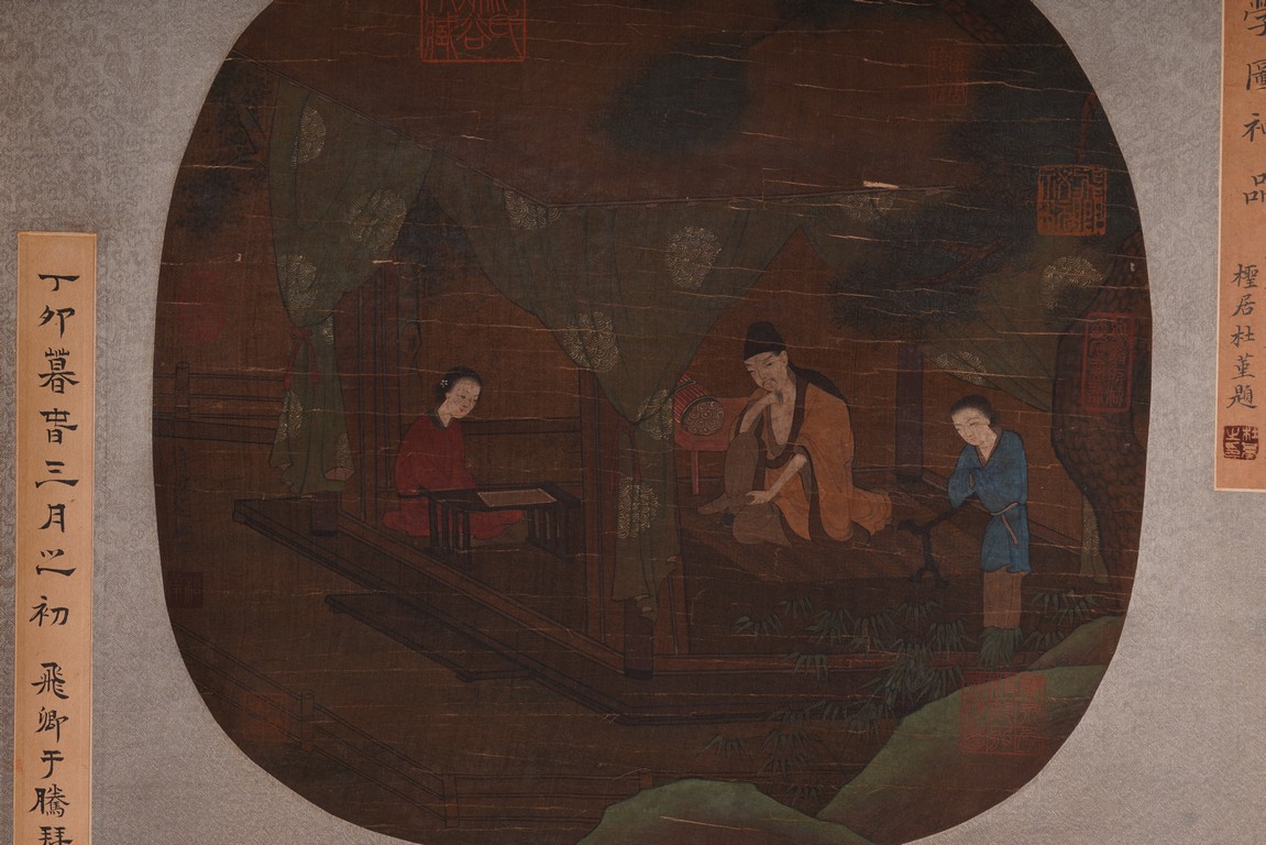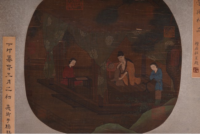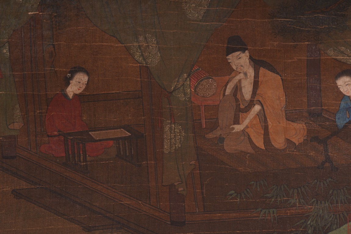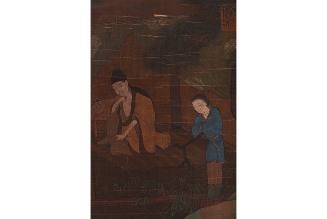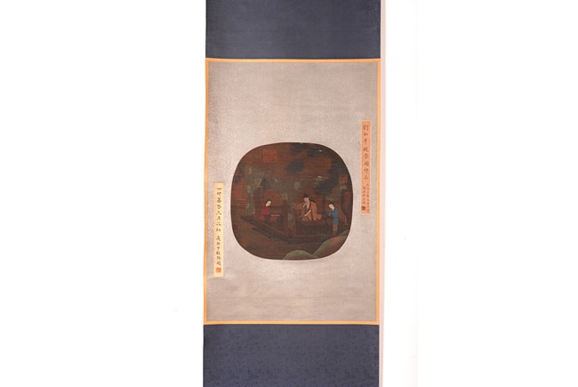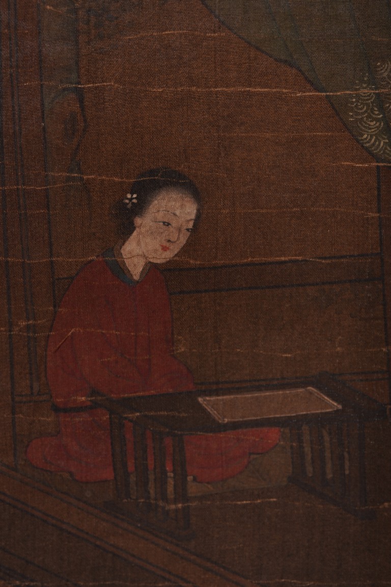 Color and ink on silk. Figures. Hanging scroll. Signed and attributed to Liu Songnian.with one seal of the artist and five seals of the collector.