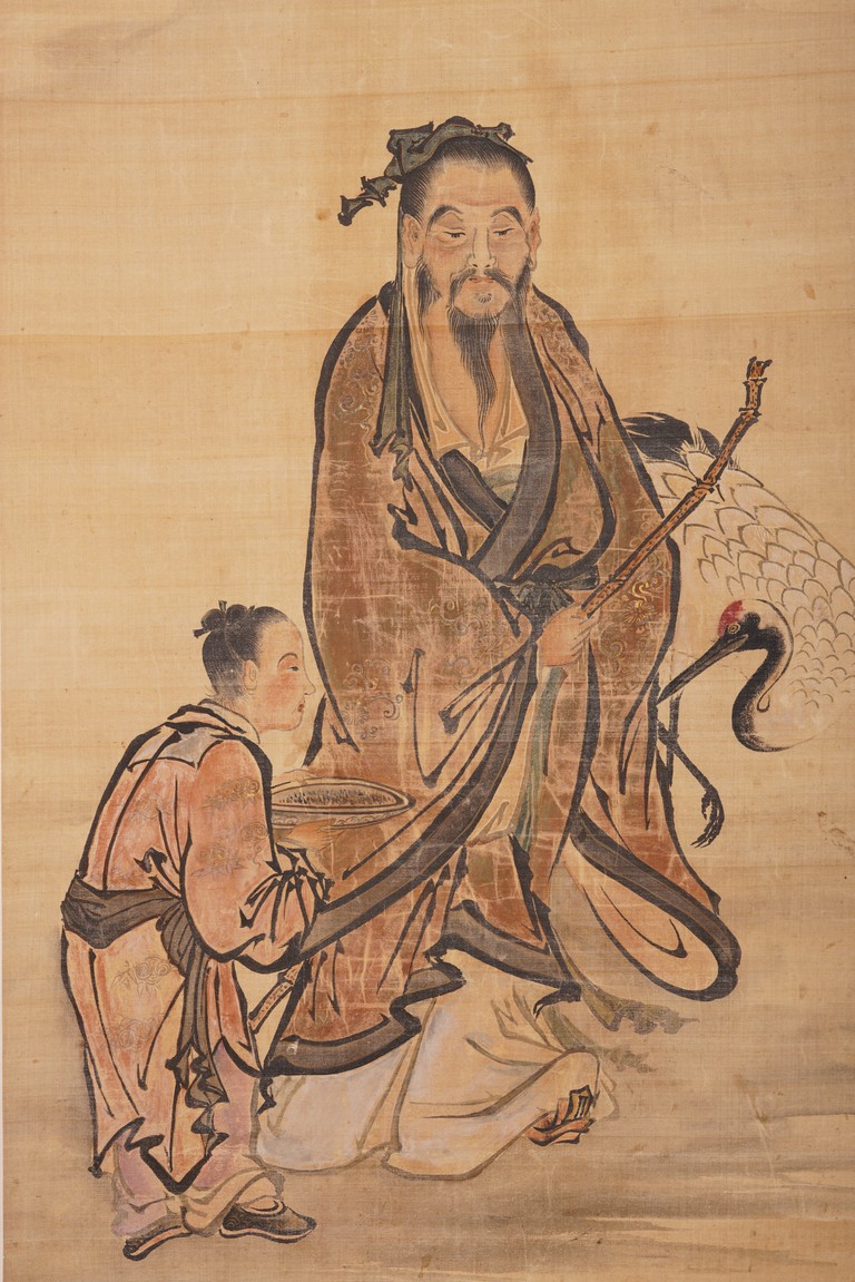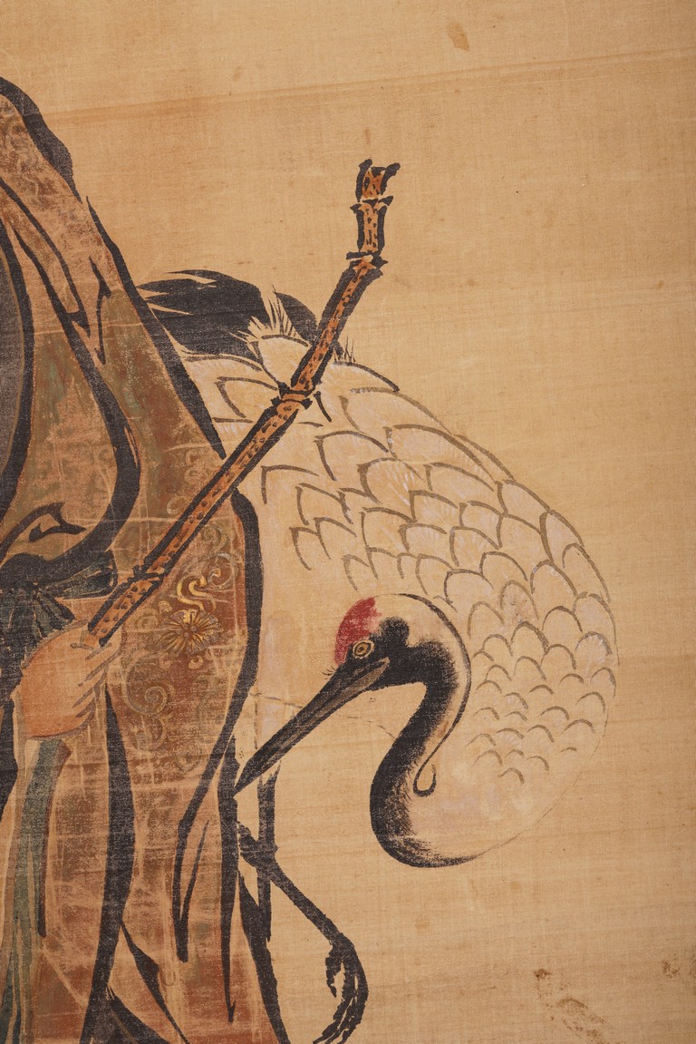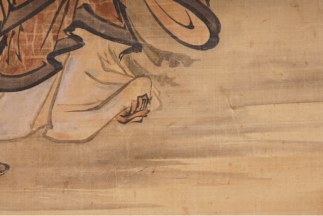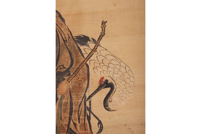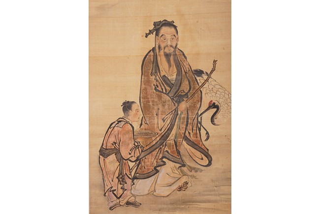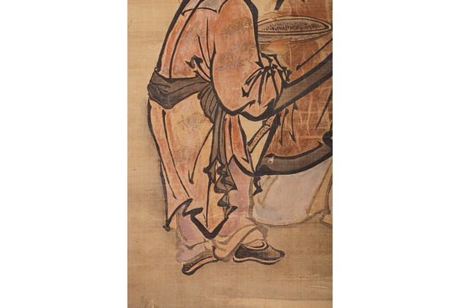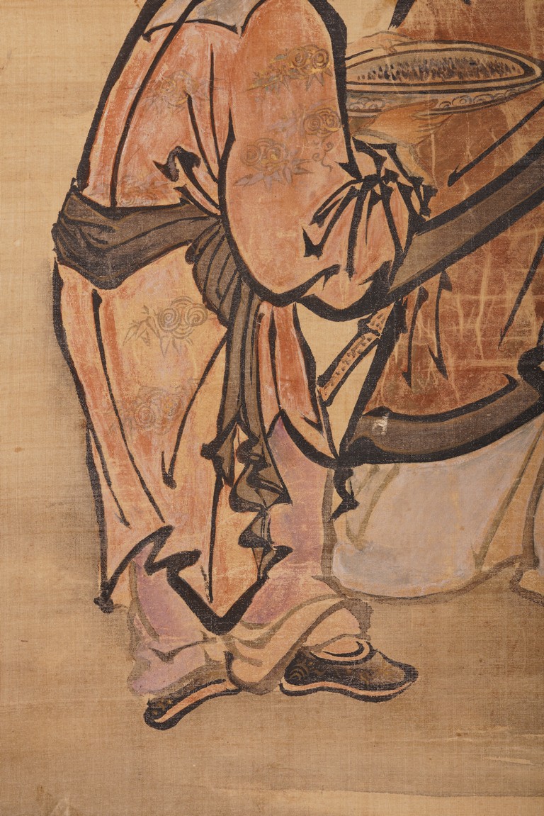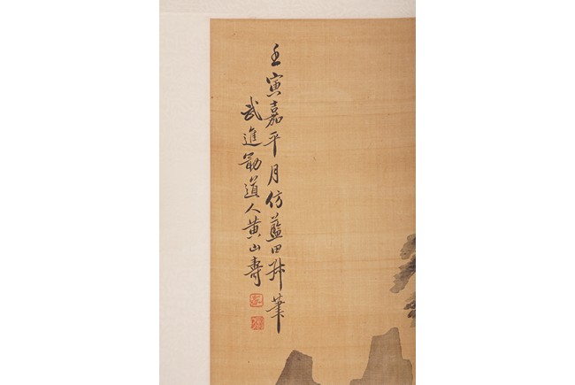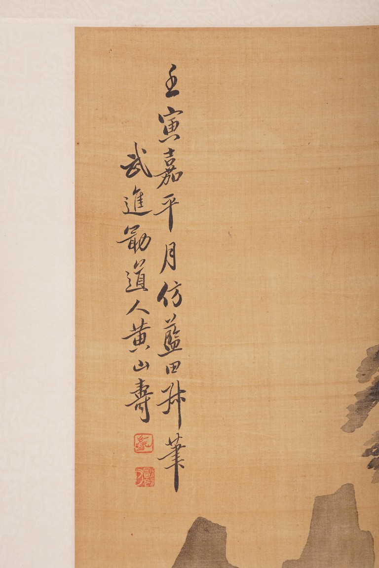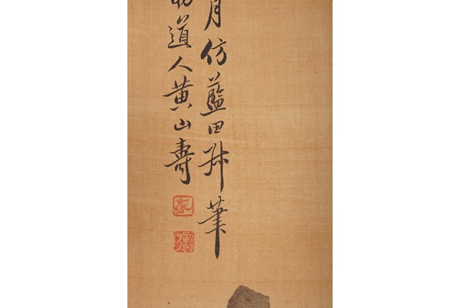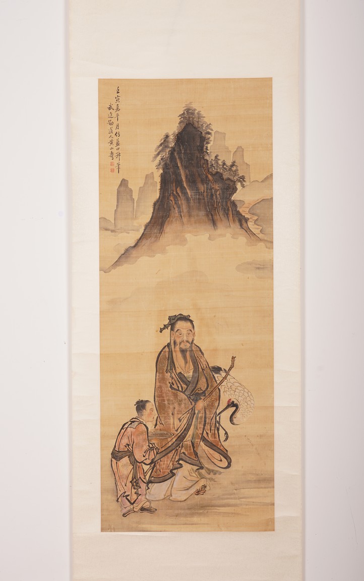 Color and ink on silk. Figures after Lan Tian. Hanging scroll. Inscribed and signed Huang Shanshou with two seal marks.