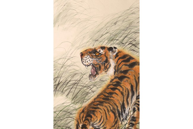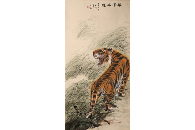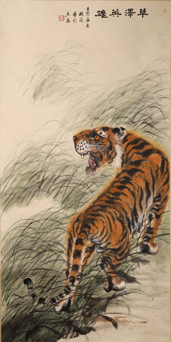 Color and ink on paper. Tiger. Hanging scroll. Inscribed and signed Qiuweng, with one seal mark.