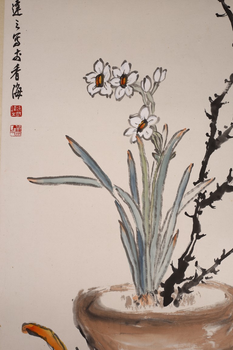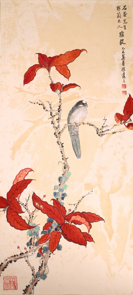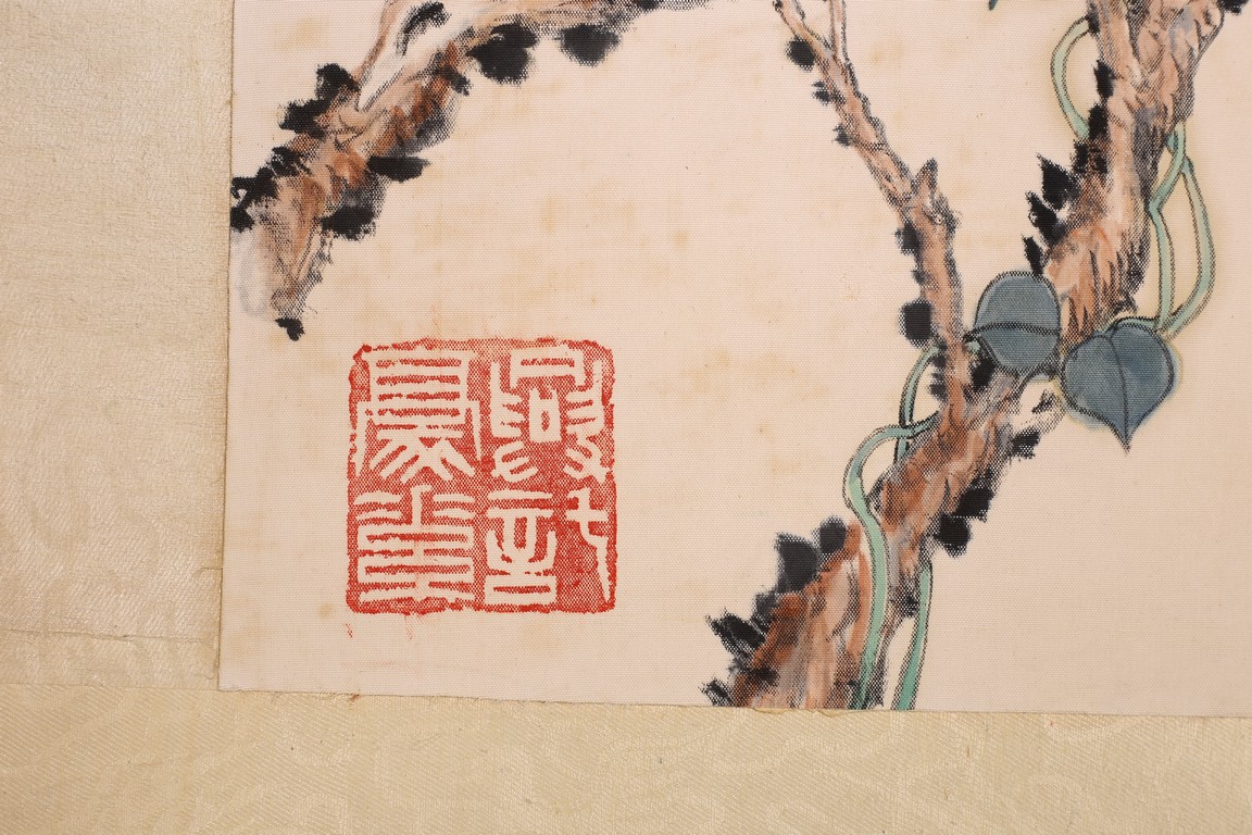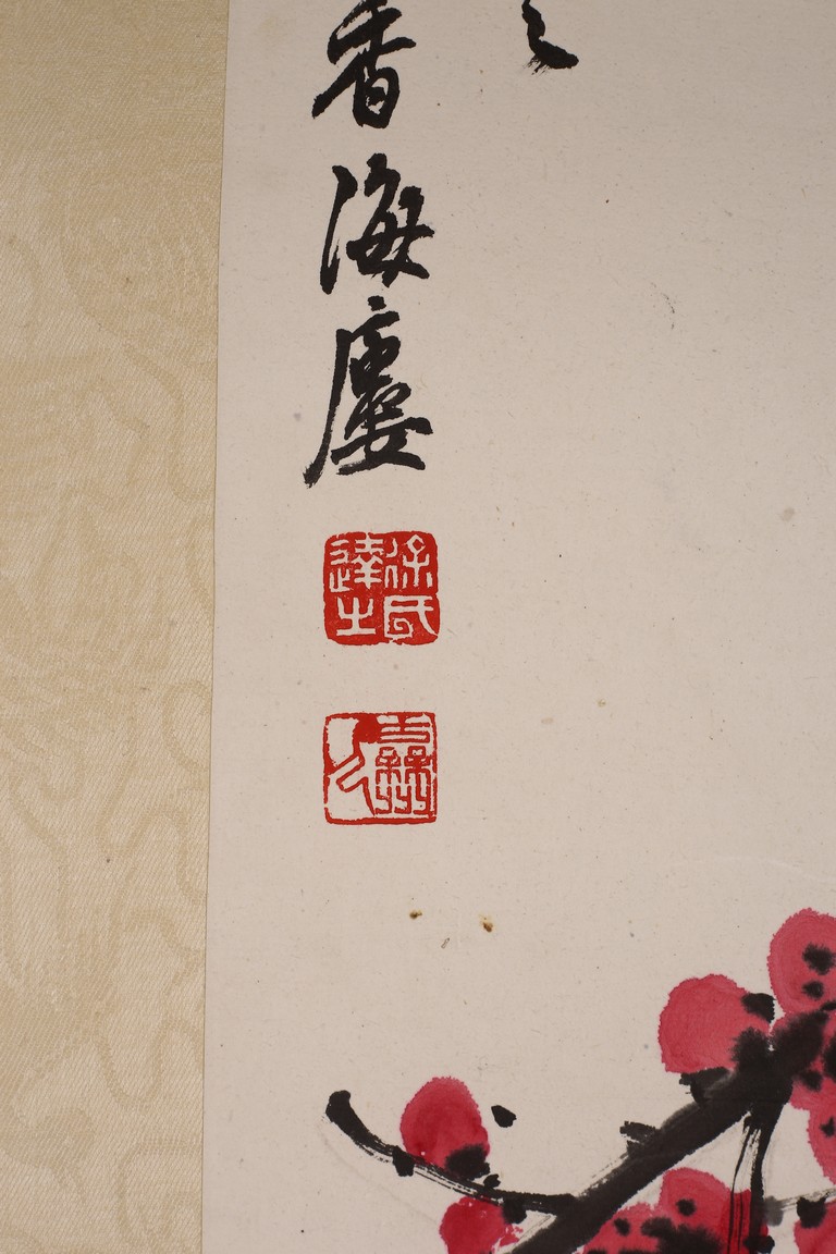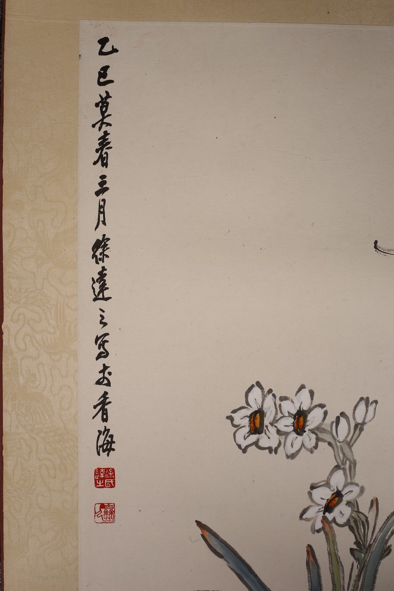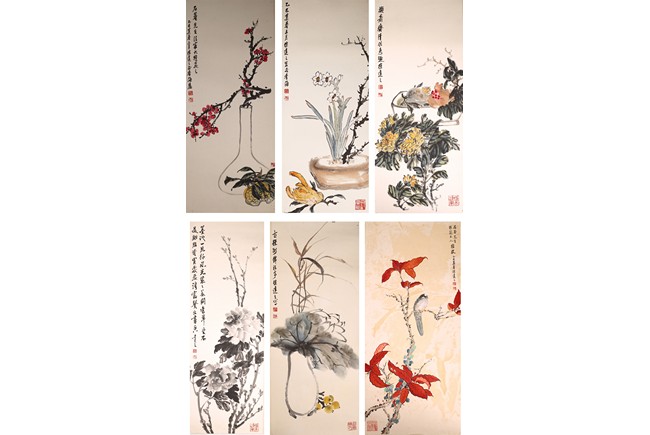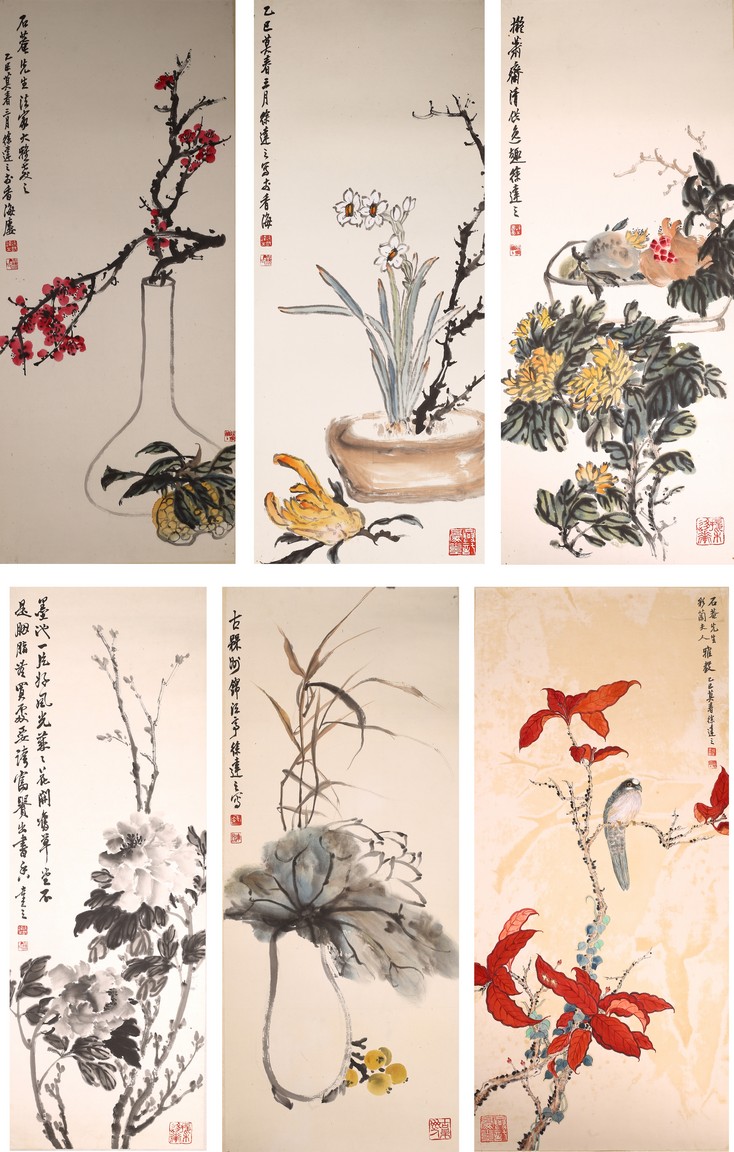 Set of six color and ink on paper paintings. Unframed. Flowers and birds. Each inscribed and signed Xu Dazhi, with three seal marks, dedicated to Shi An Xian Sheng.