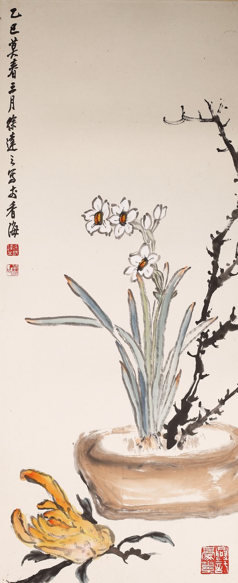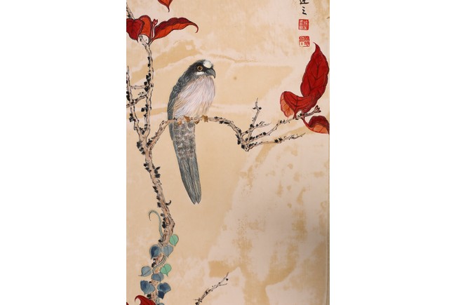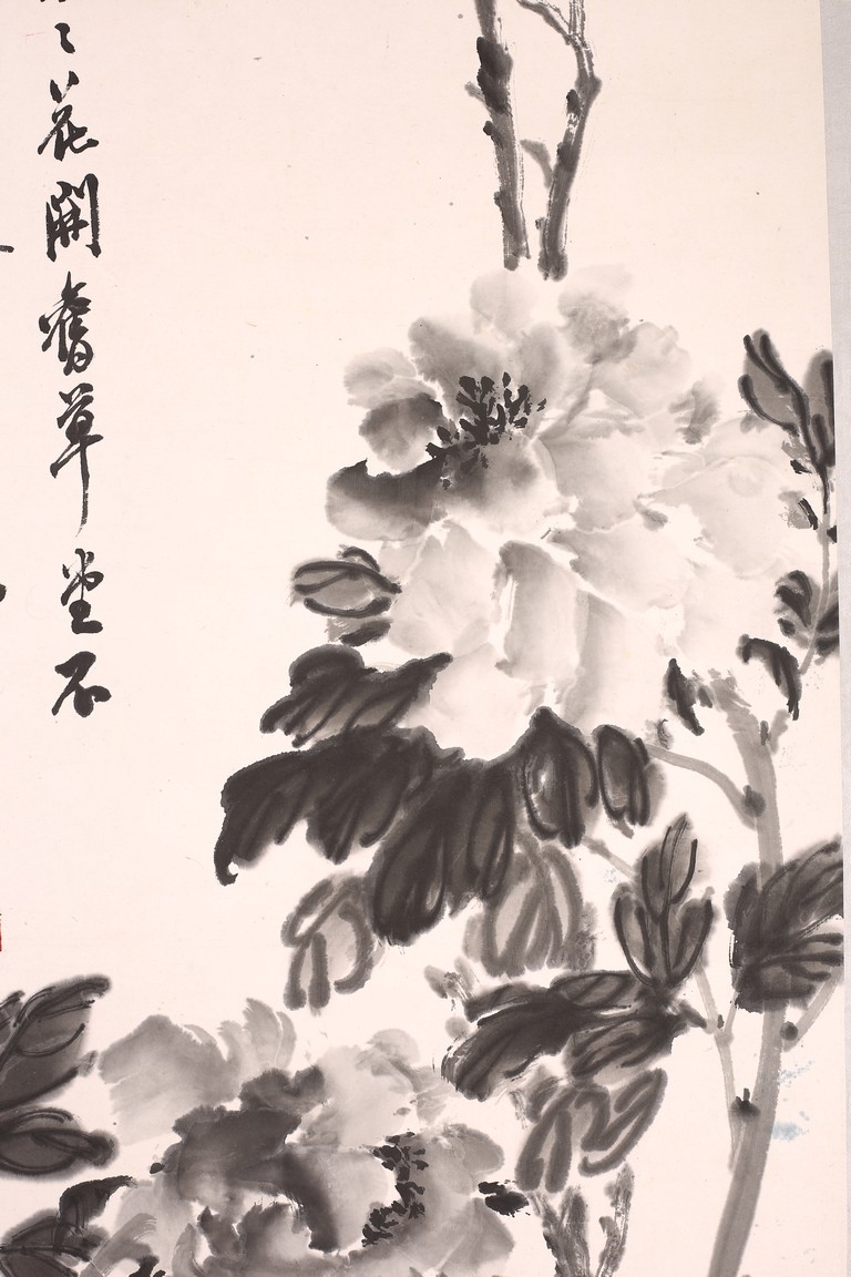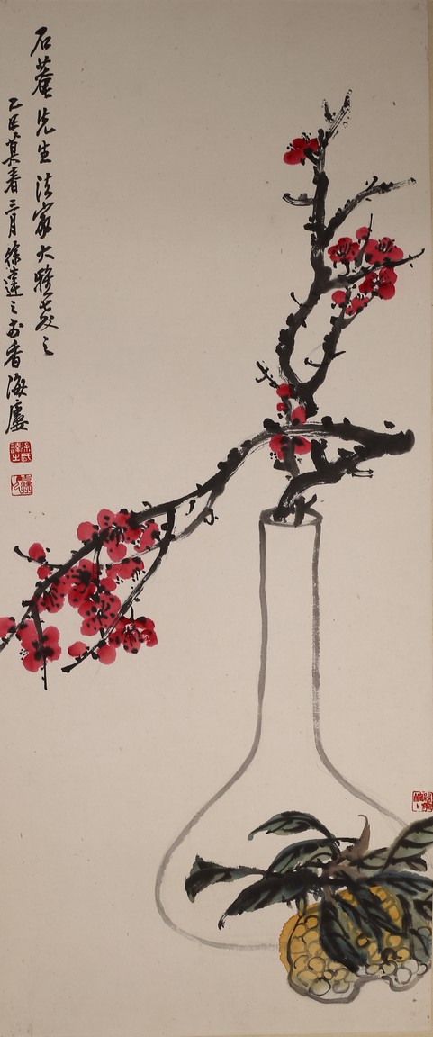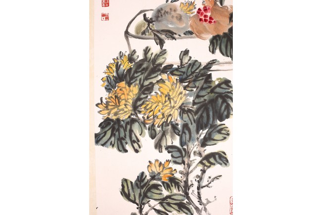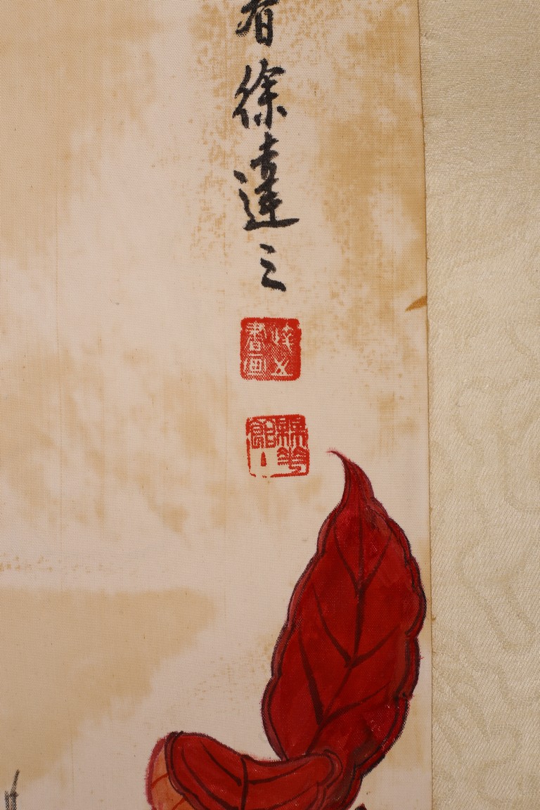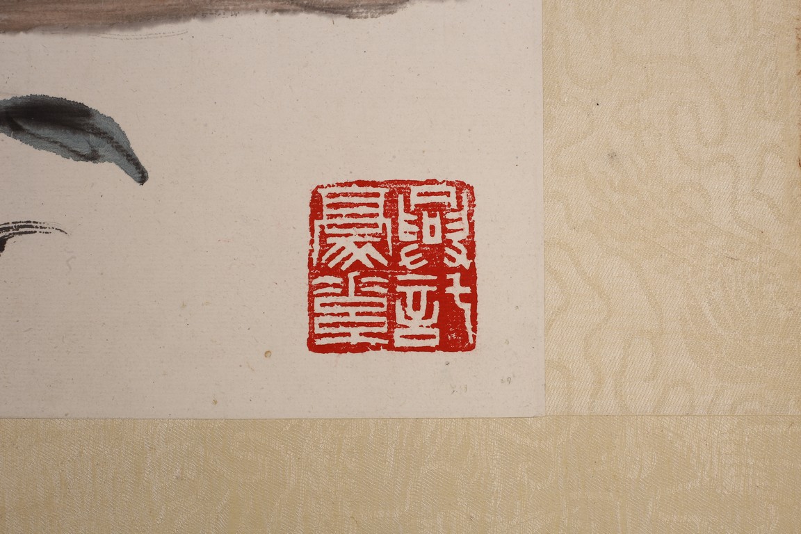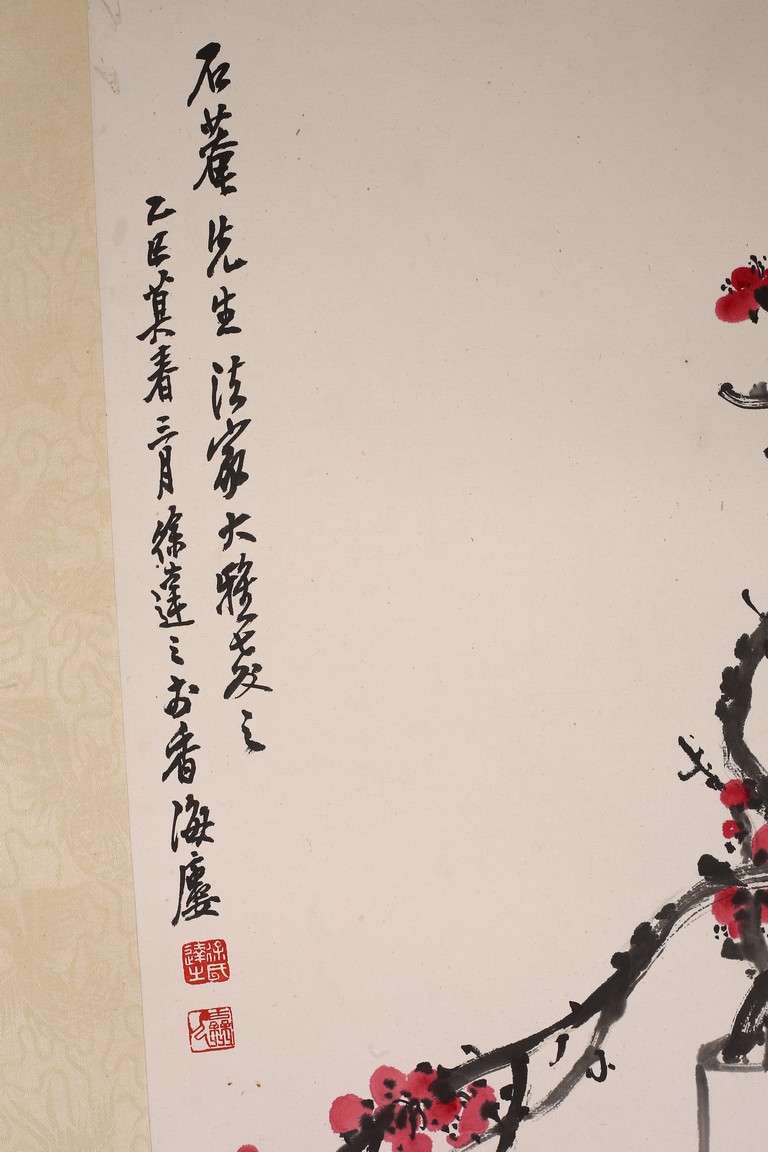 Set of six color and ink on paper paintings. Unframed. Flowers and birds. Each inscribed and signed Xu Dazhi, with three seal marks, dedicated to Shi An Xian Sheng.