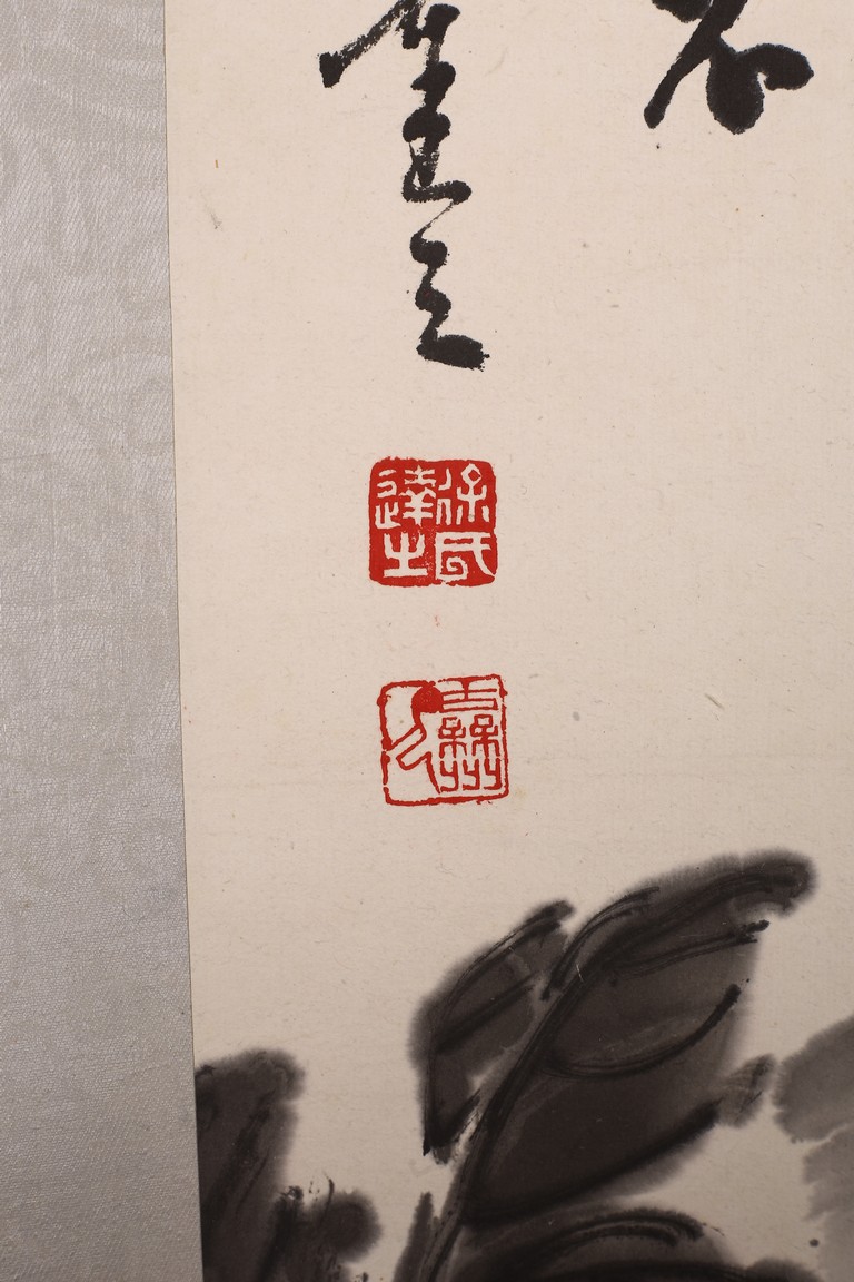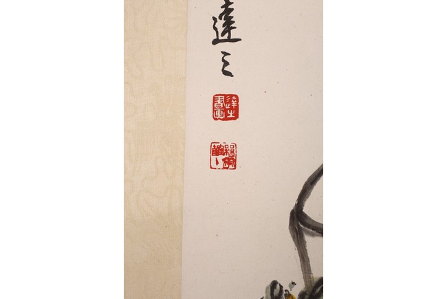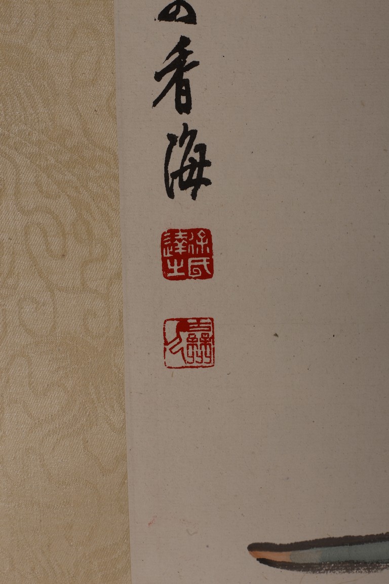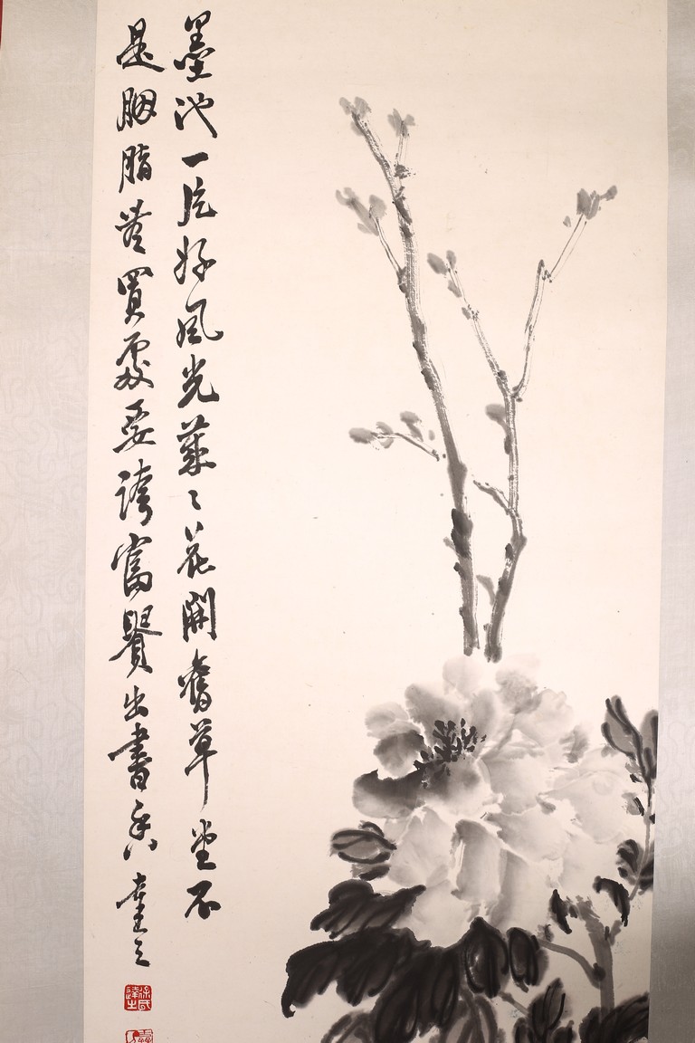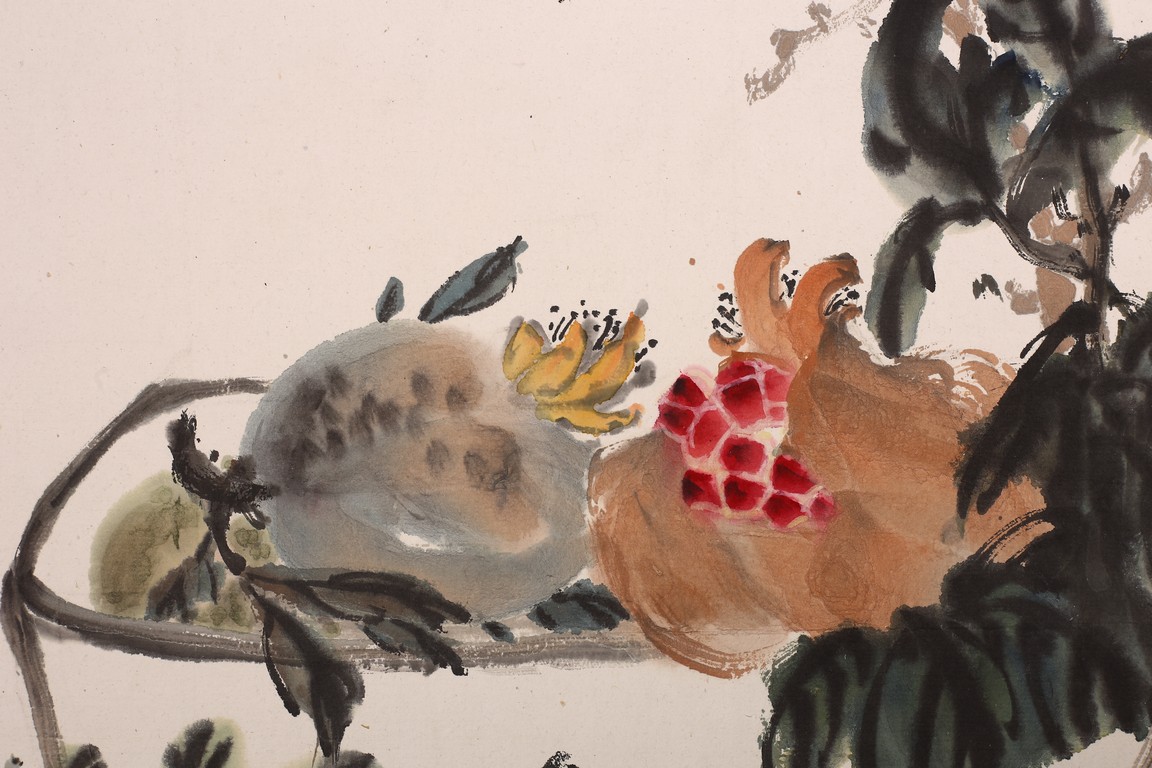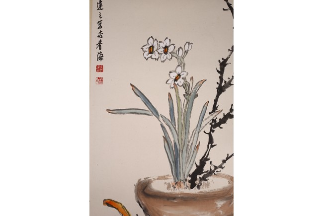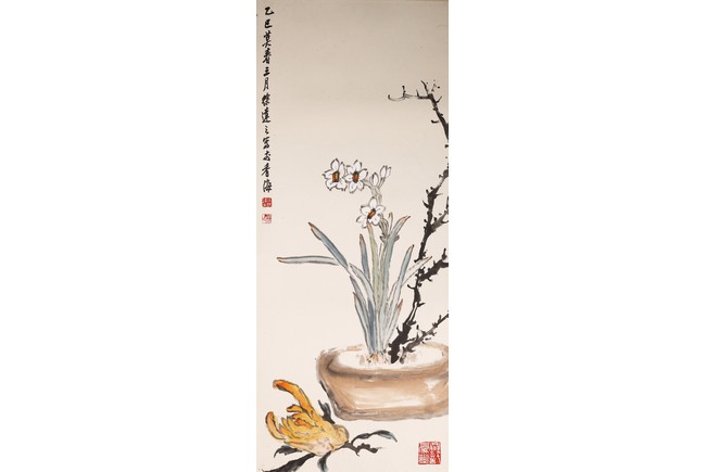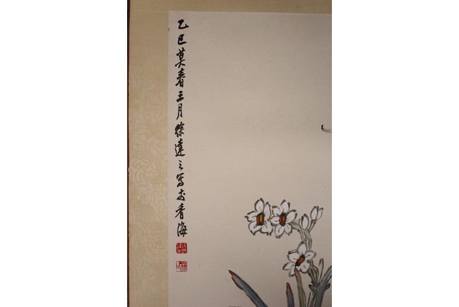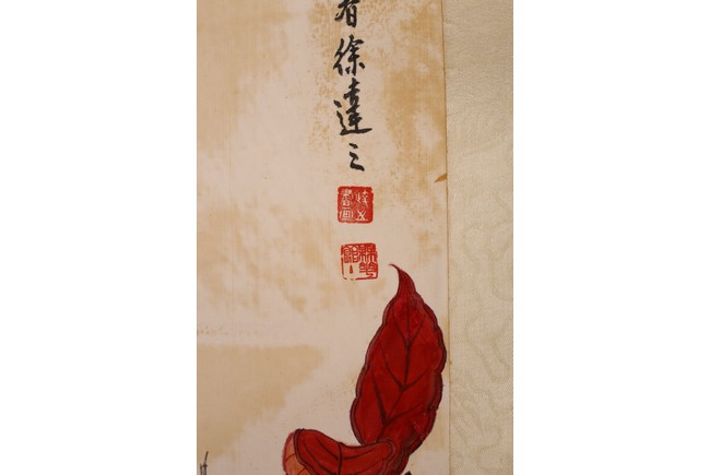 Set of six color and ink on paper paintings. Unframed. Flowers and birds. Each inscribed and signed Xu Dazhi, with three seal marks, dedicated to Shi An Xian Sheng.