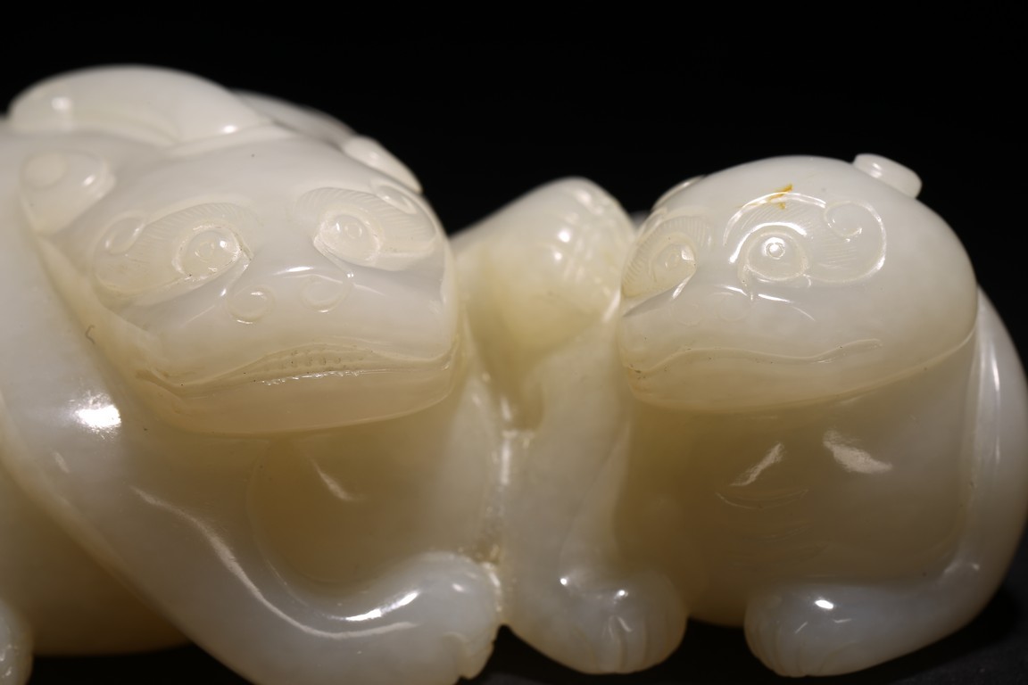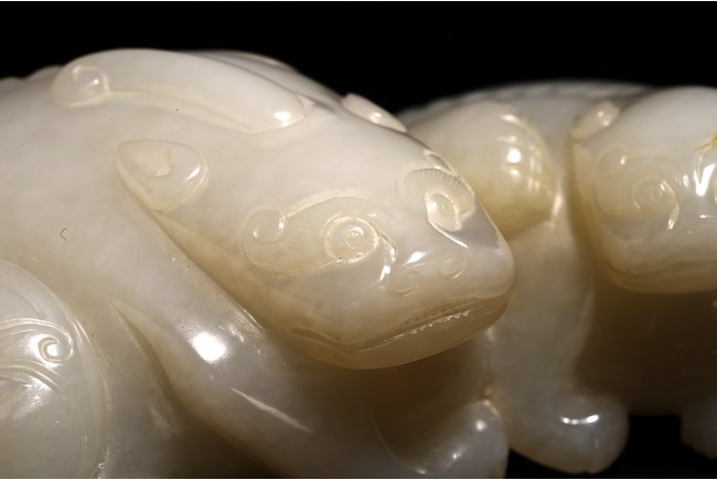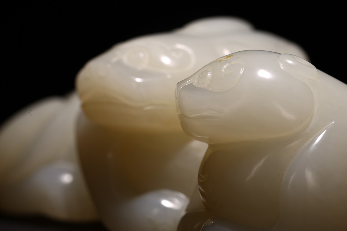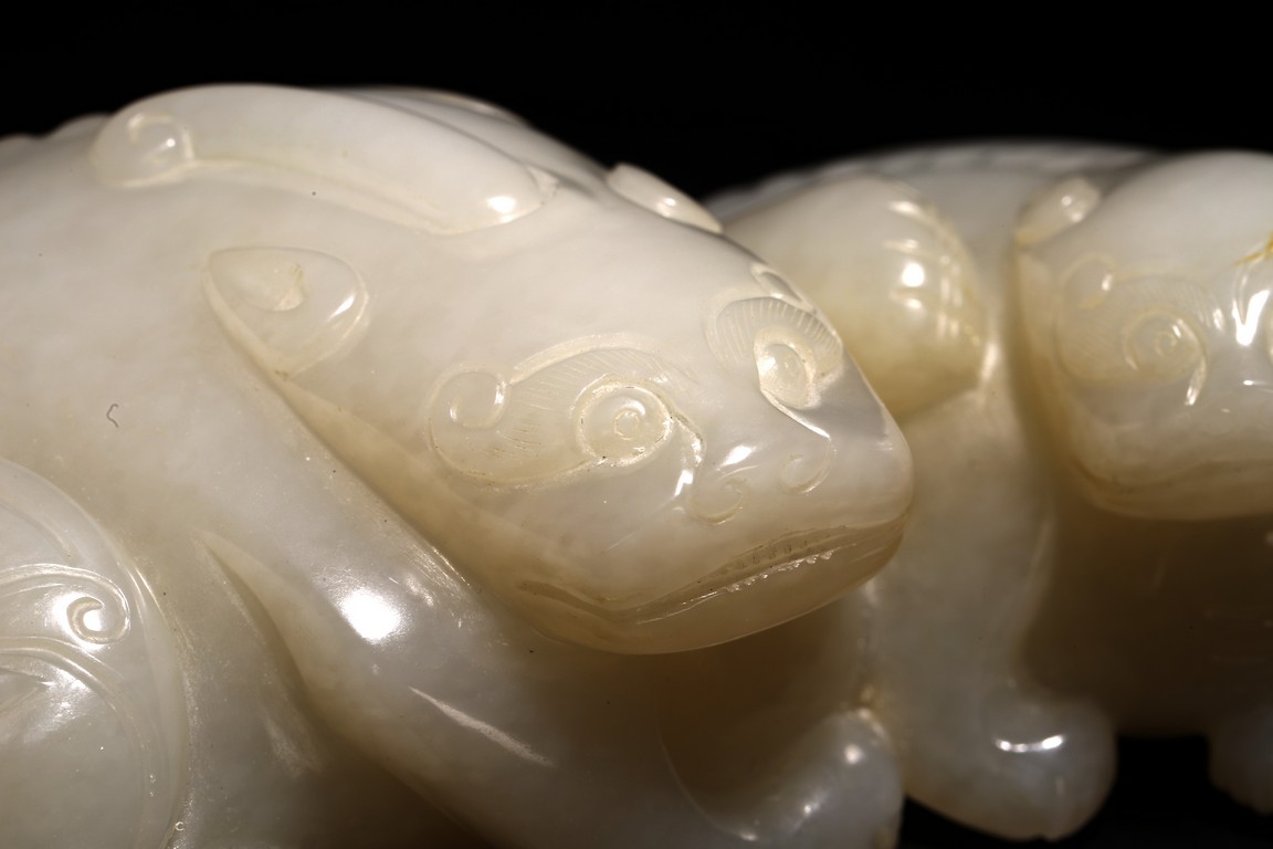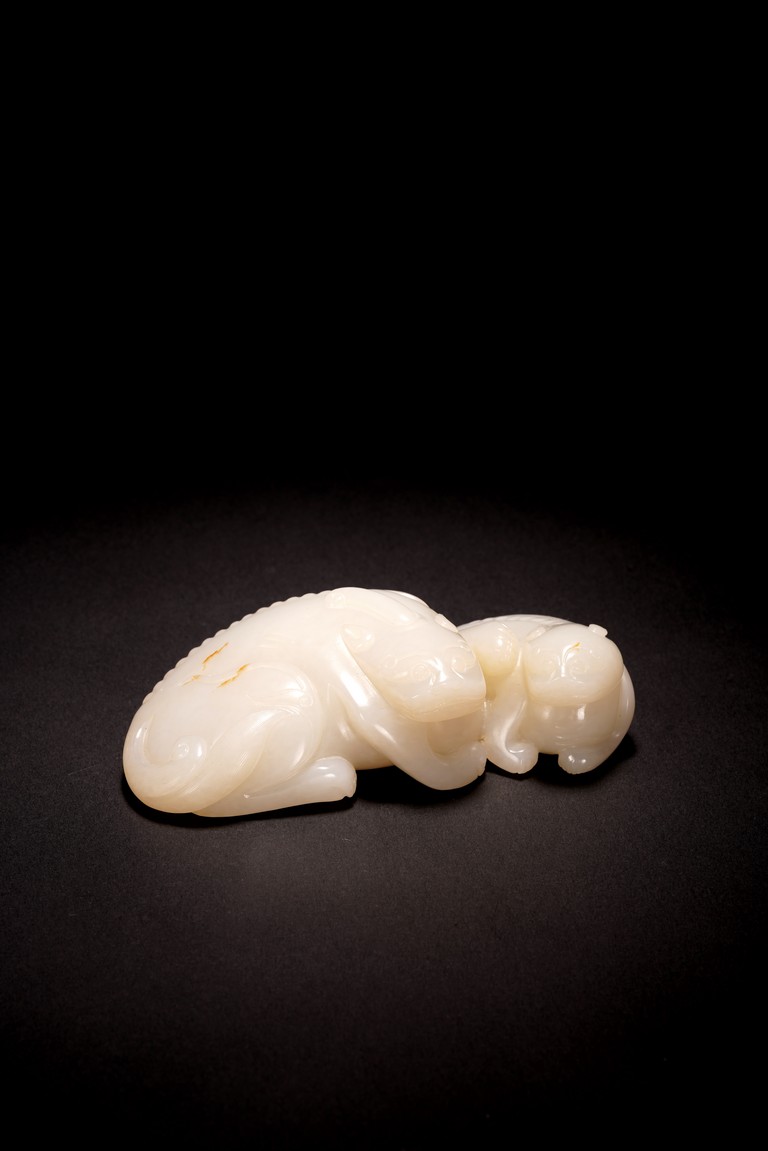 Carved in the form of two recumbent mythical beasts, one larger and the other smaller, each detailed with a pair of round eyes and flared nostrils, the stone of an even white tone.