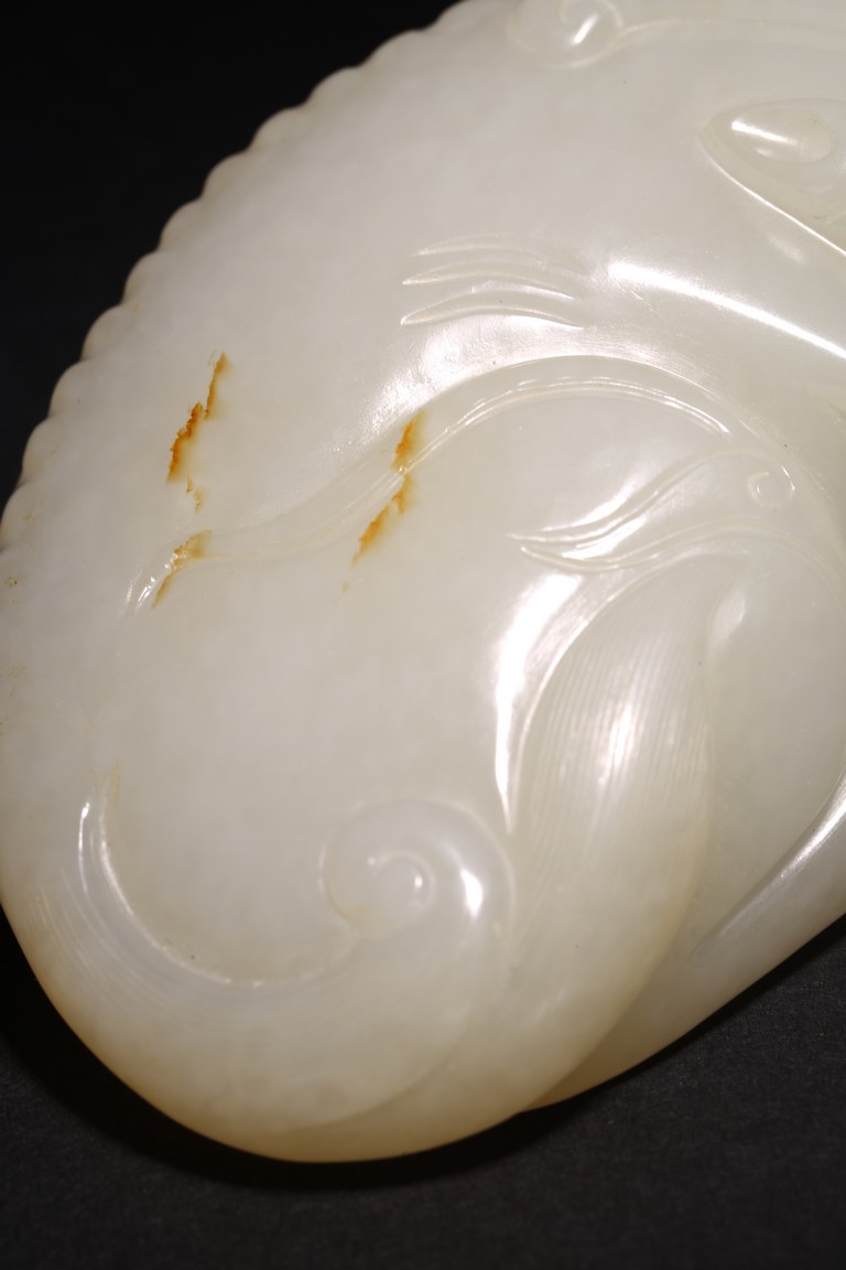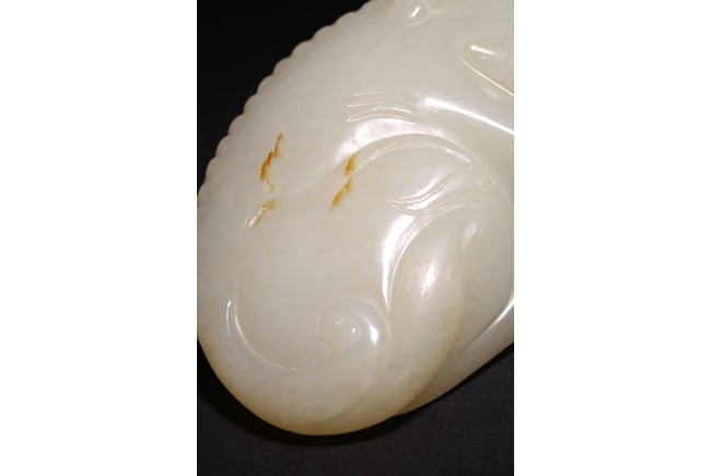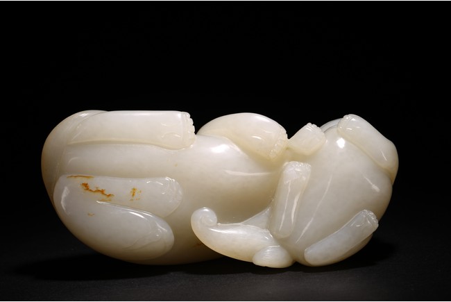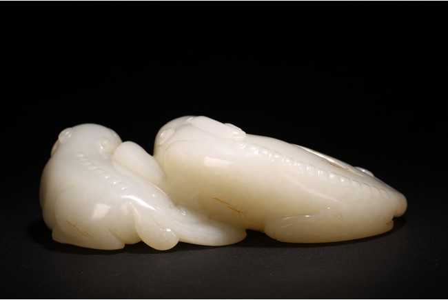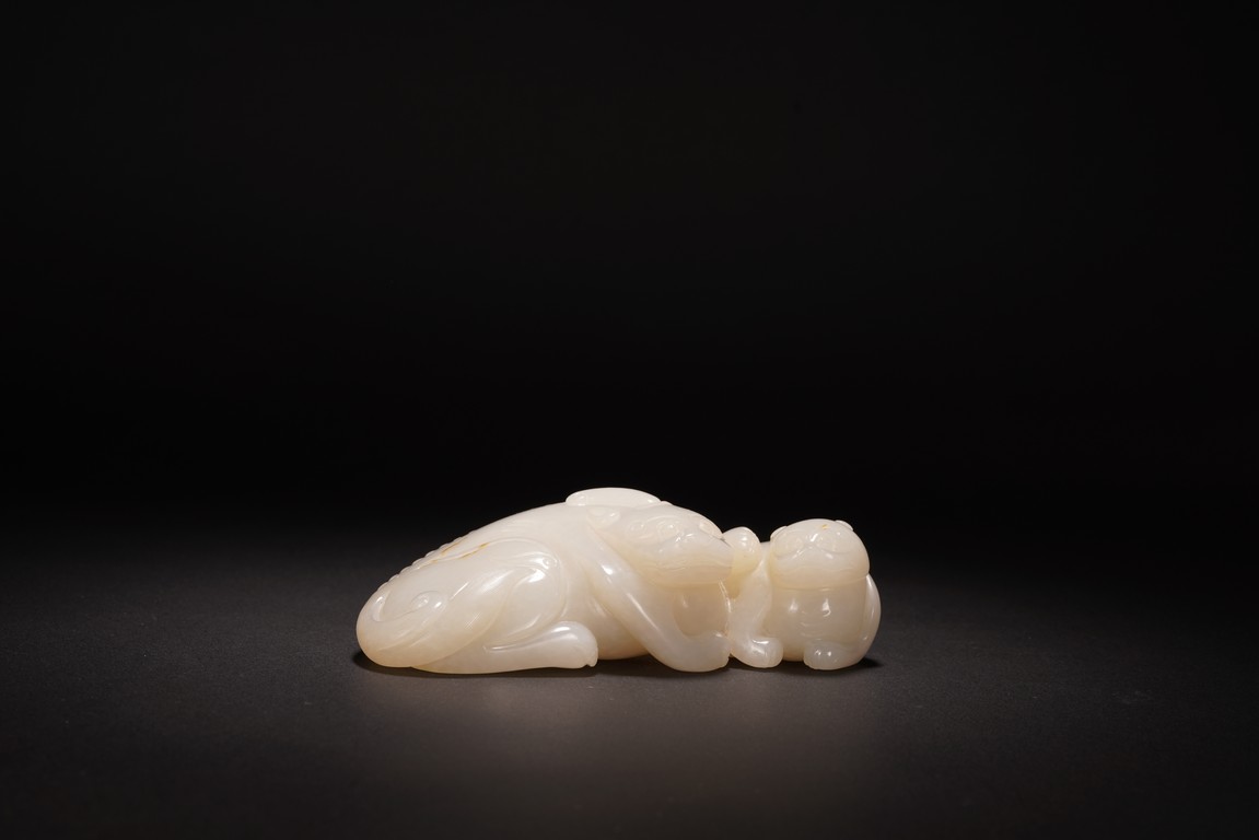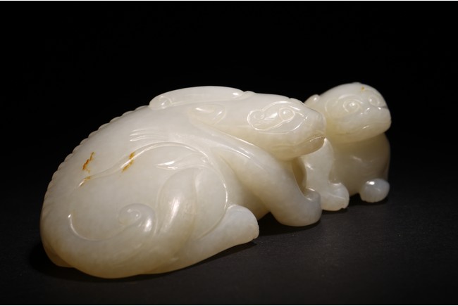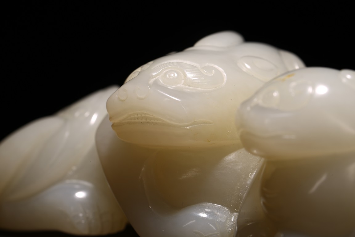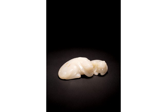 Carved in the form of two recumbent mythical beasts, one larger and the other smaller, each detailed with a pair of round eyes and flared nostrils, the stone of an even white tone.