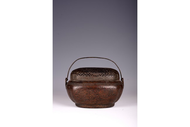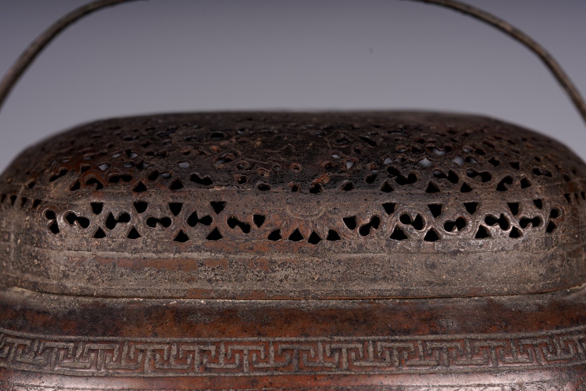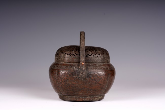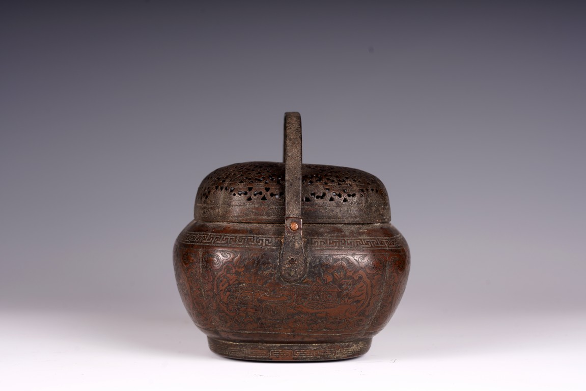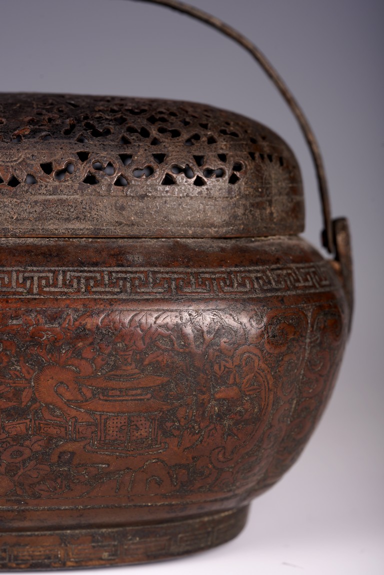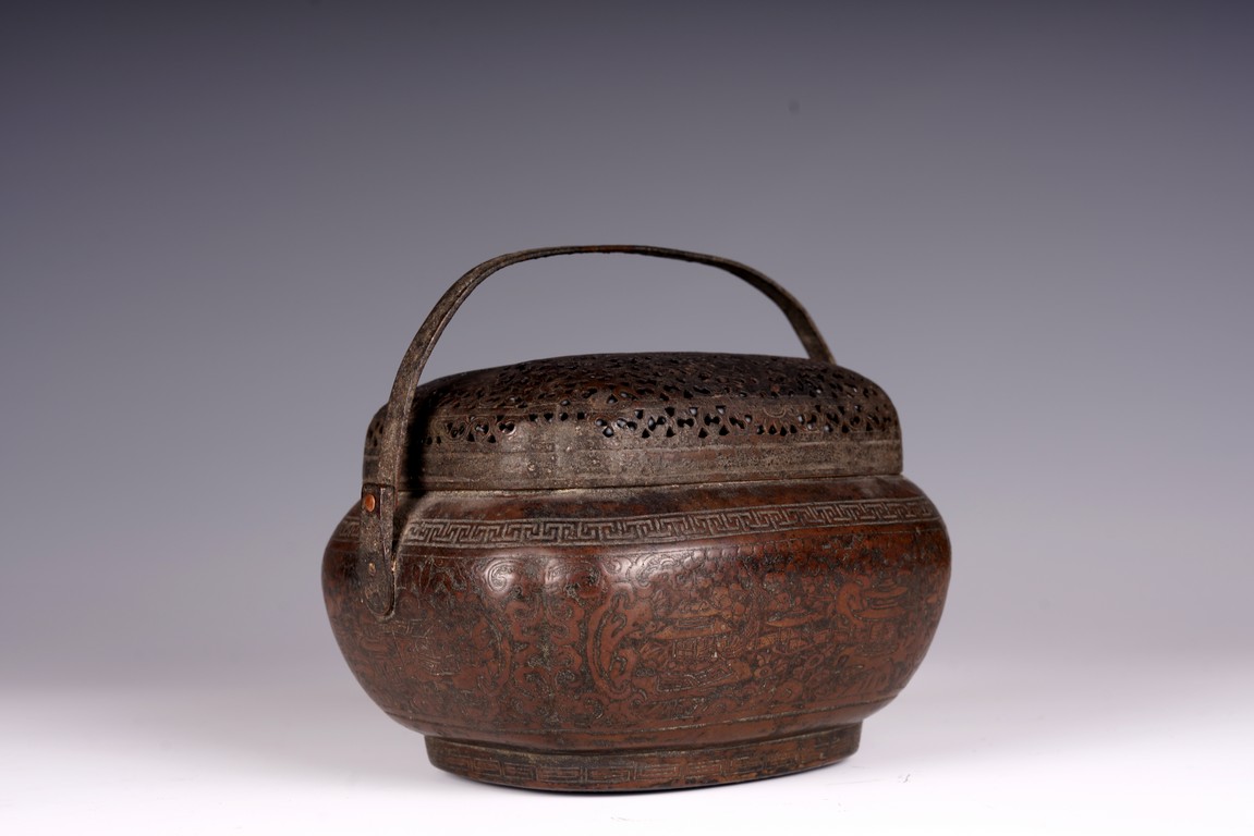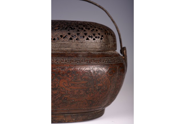 此爐以銅為材,器身呈瓜棱橢圓形,飾銅扁方提梁。蓋作鏤空花卉紋飾,肩腹部採淺刻萬字紋,足脛部淺刻迴紋,腹部模印主題紋飾為亭台樓閣紋。紋飾繁縟,工藝複雜,器形周正,包漿厚潤,器型較大,值得收藏。
