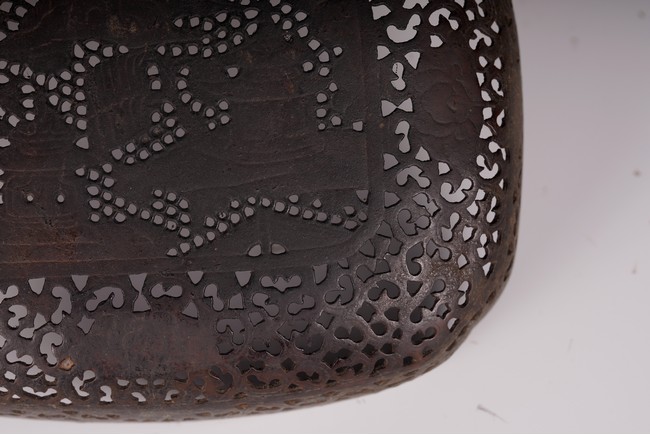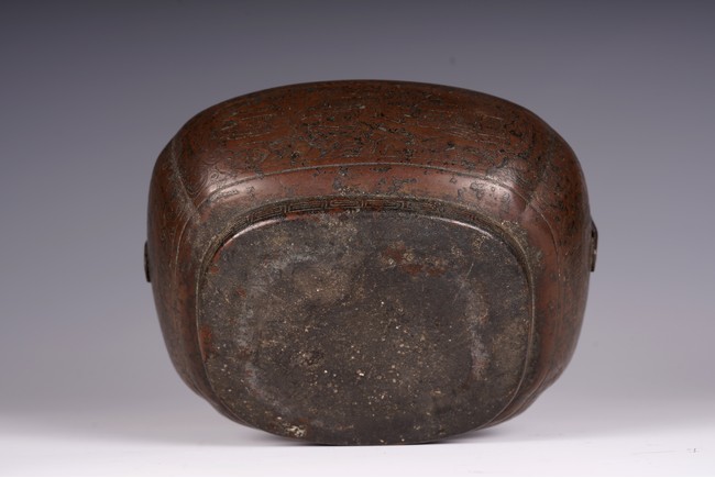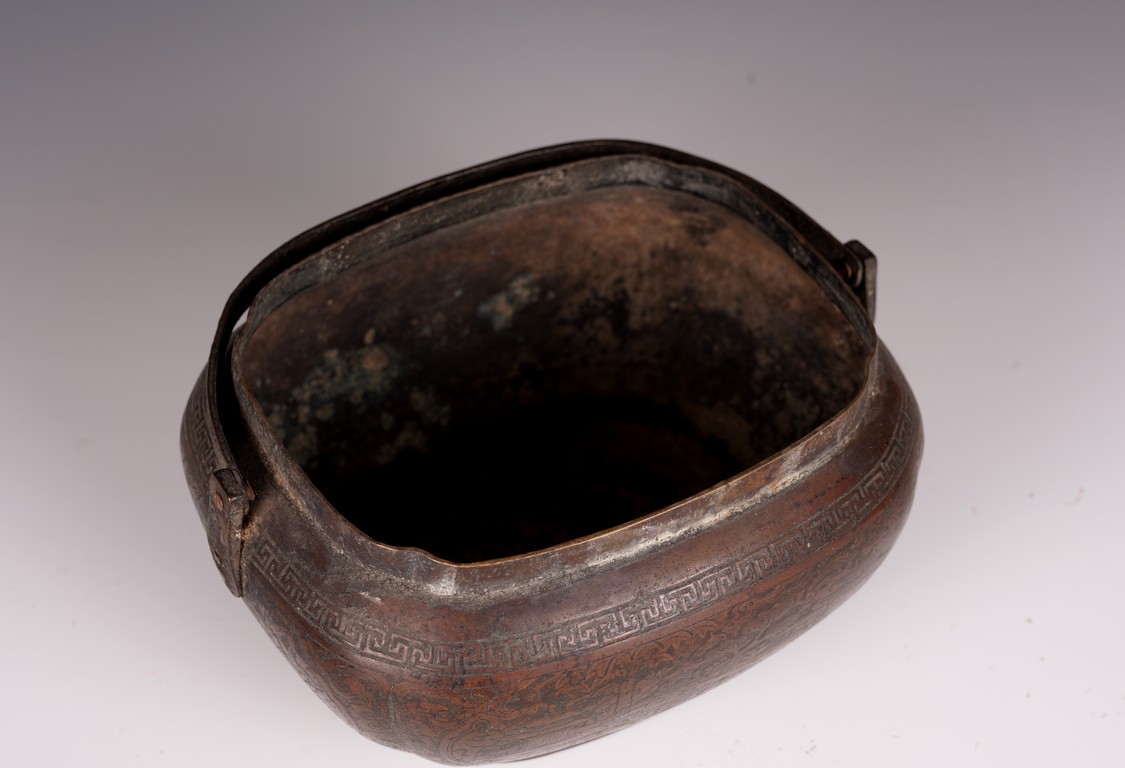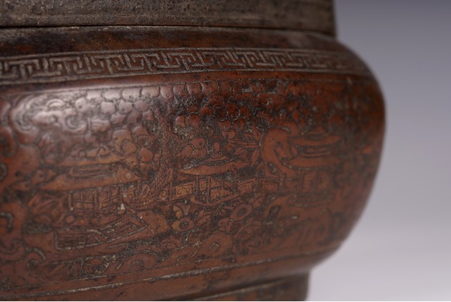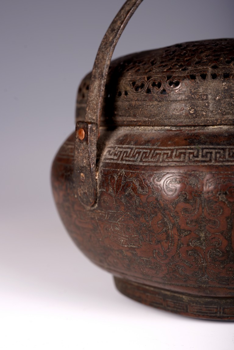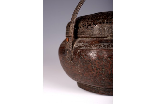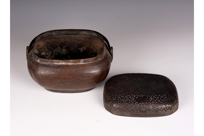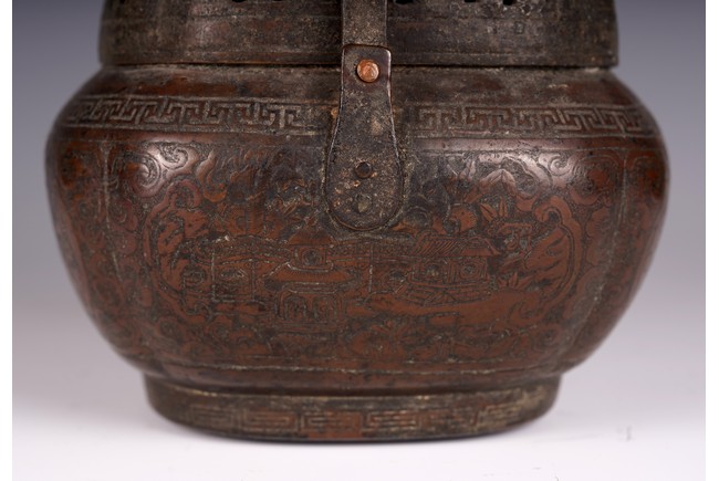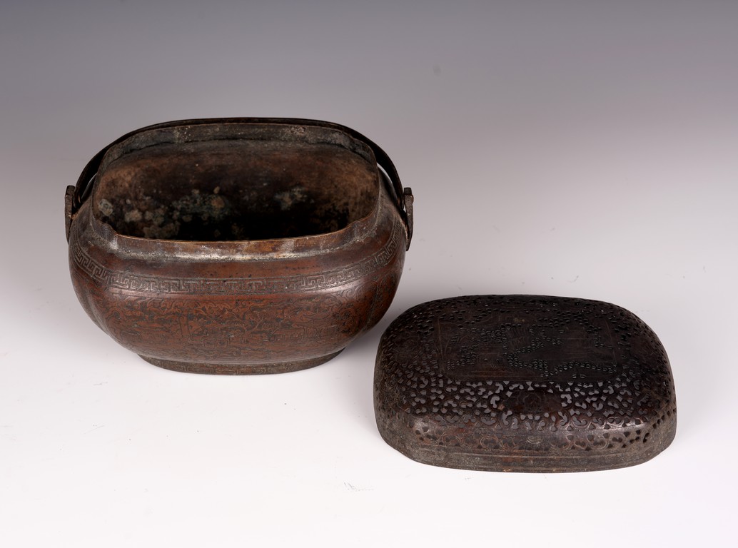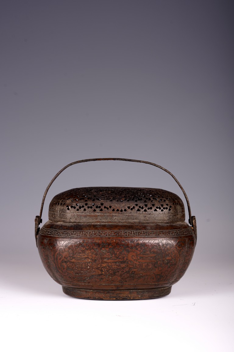 此爐以銅為材,器身呈瓜棱橢圓形,飾銅扁方提梁。蓋作鏤空花卉紋飾,肩腹部採淺刻萬字紋,足脛部淺刻迴紋,腹部模印主題紋飾為亭台樓閣紋。紋飾繁縟,工藝複雜,器形周正,包漿厚潤,器型較大,值得收藏。