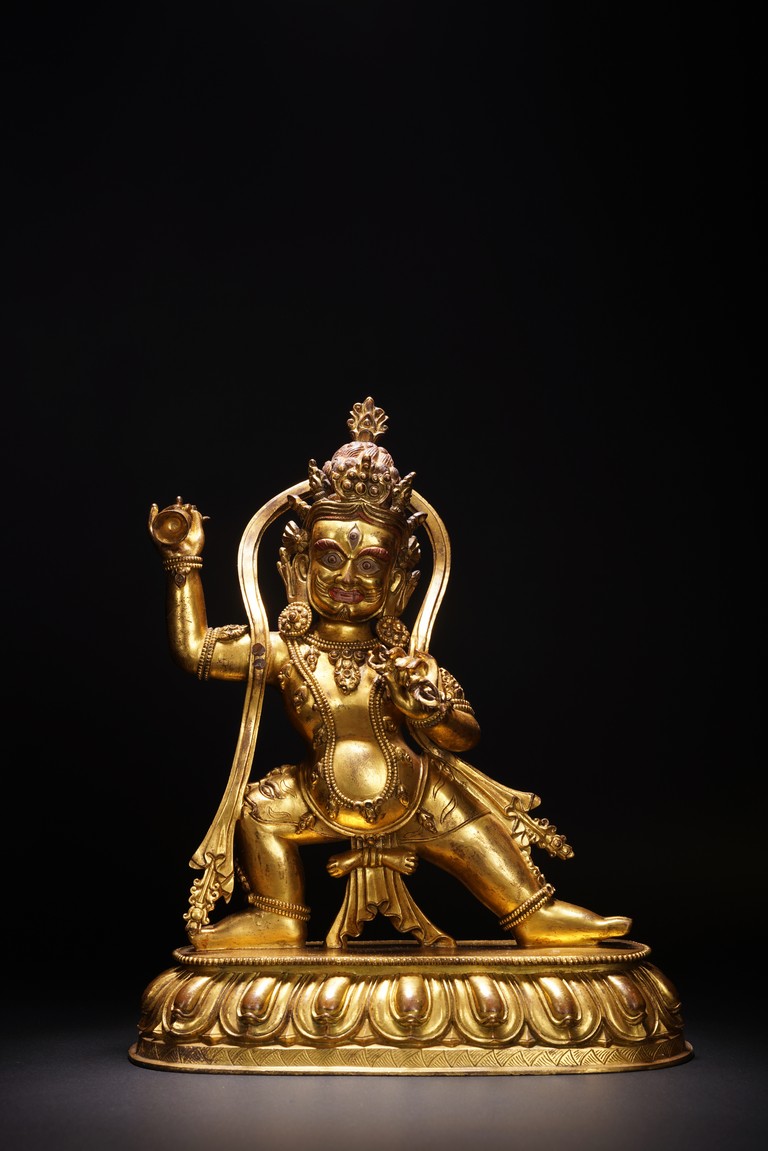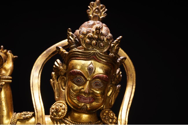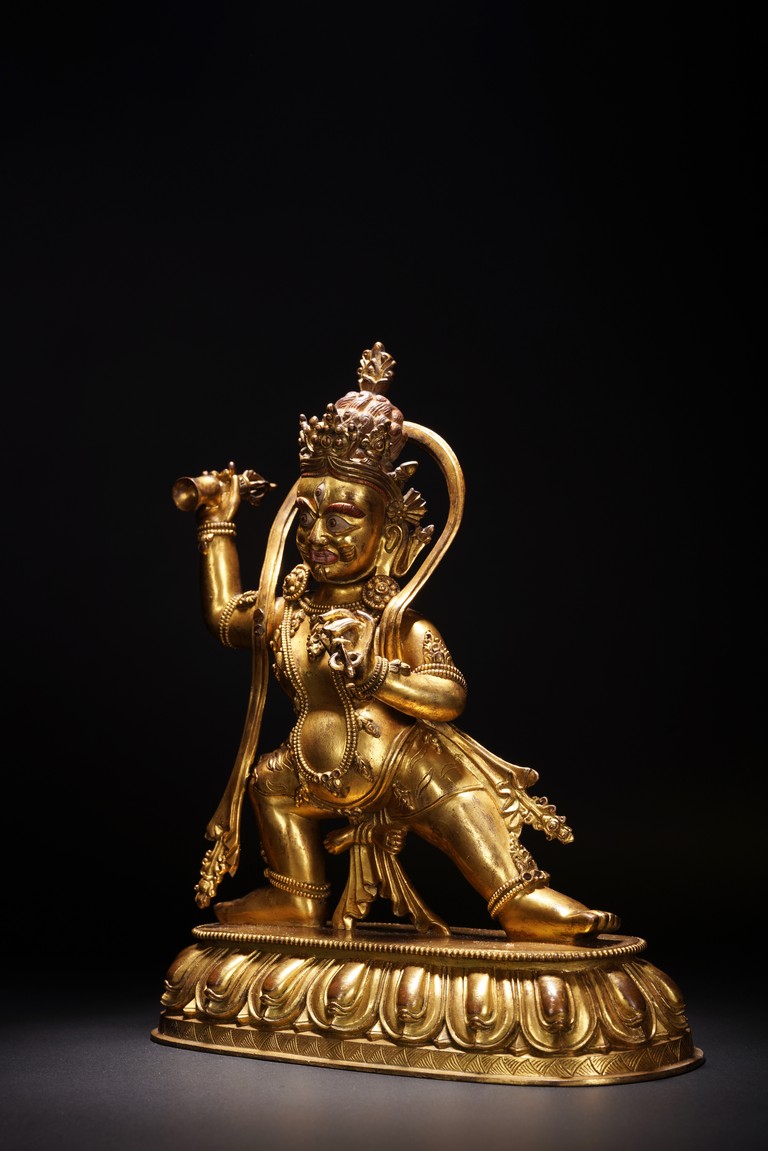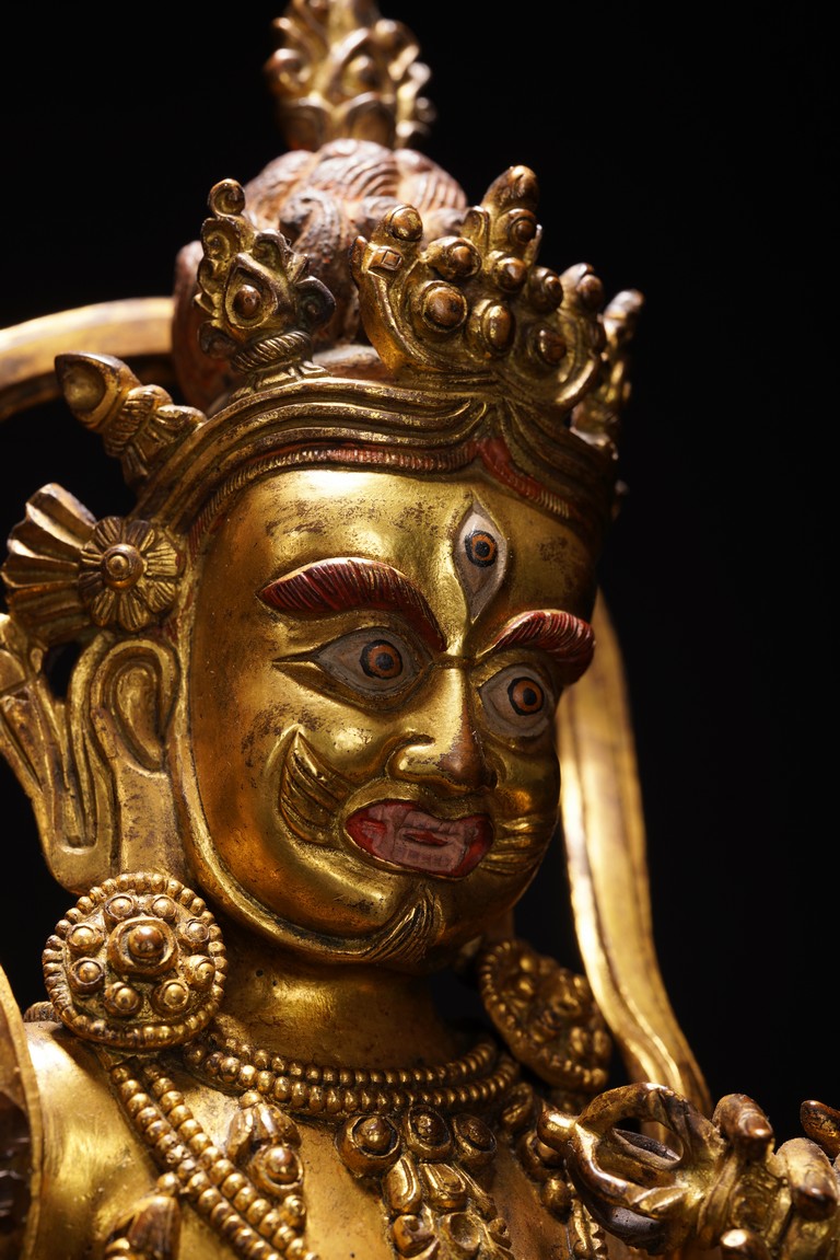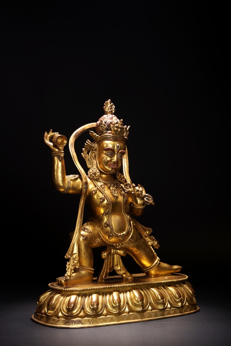 金剛手是大勢至菩薩的化身,為藏傳佛教崇奉的三大依怙主之一。金剛杵原來是古印度的一種兵器,後來被佛教密宗吸收為法器,密宗用金剛杵代表堅固,鋒利之智,表示佛的智能可斷除煩惱,除去魔障,金剛杵也表示如來金剛智印。此尊憤怒相,左展姿,右手高舉金剛鈴,左手於胸前持金剛杵,為金剛手菩薩常見姿態。頭項肉髻,頭戴五智寶冠,象徵五佛五智,濃眉怒目,嘴大張呲牙,上身袒露,飾以瓔珞,腰繫虎皮裙,釧鐲嚴飾。軀體壯實,四肢短粗,長長的帛帶自腦後飄逸而下至雙足,宛若背光,左展立於覆蓮座上。整體精巧而細膩,簡潔明快,鎏金亮麗,可謂同類造像中的精品。