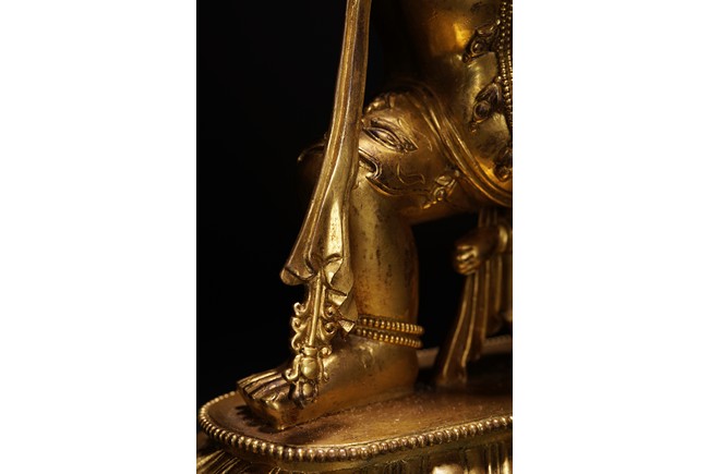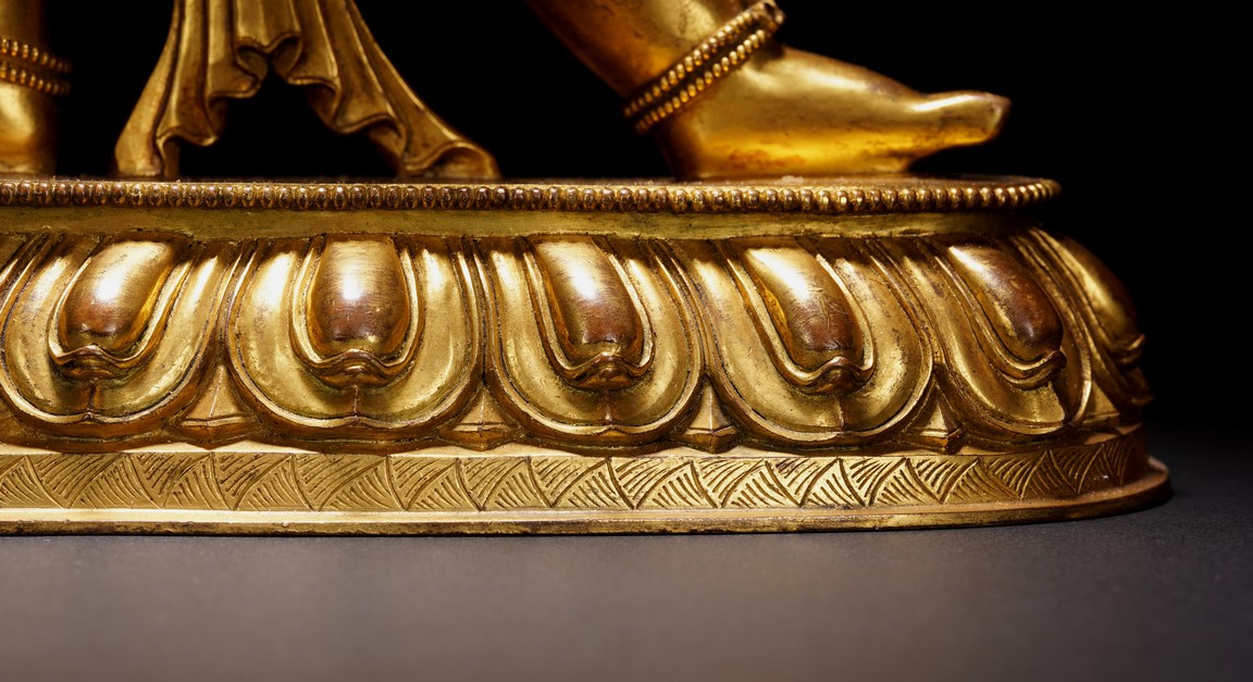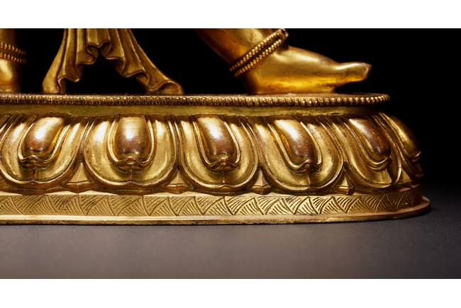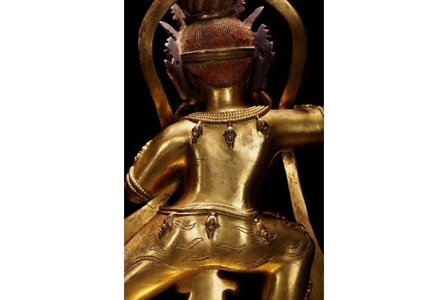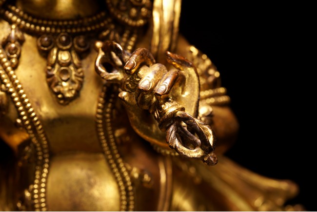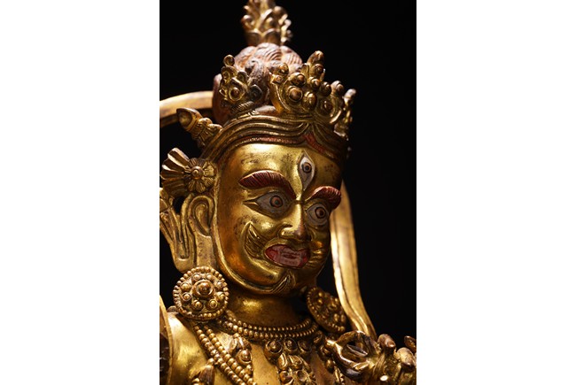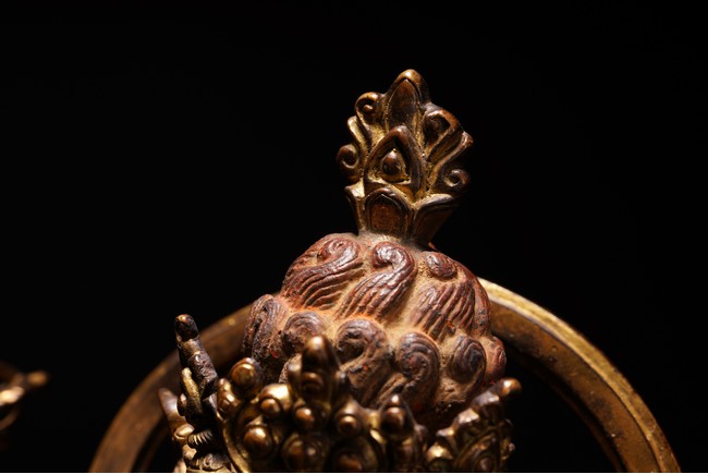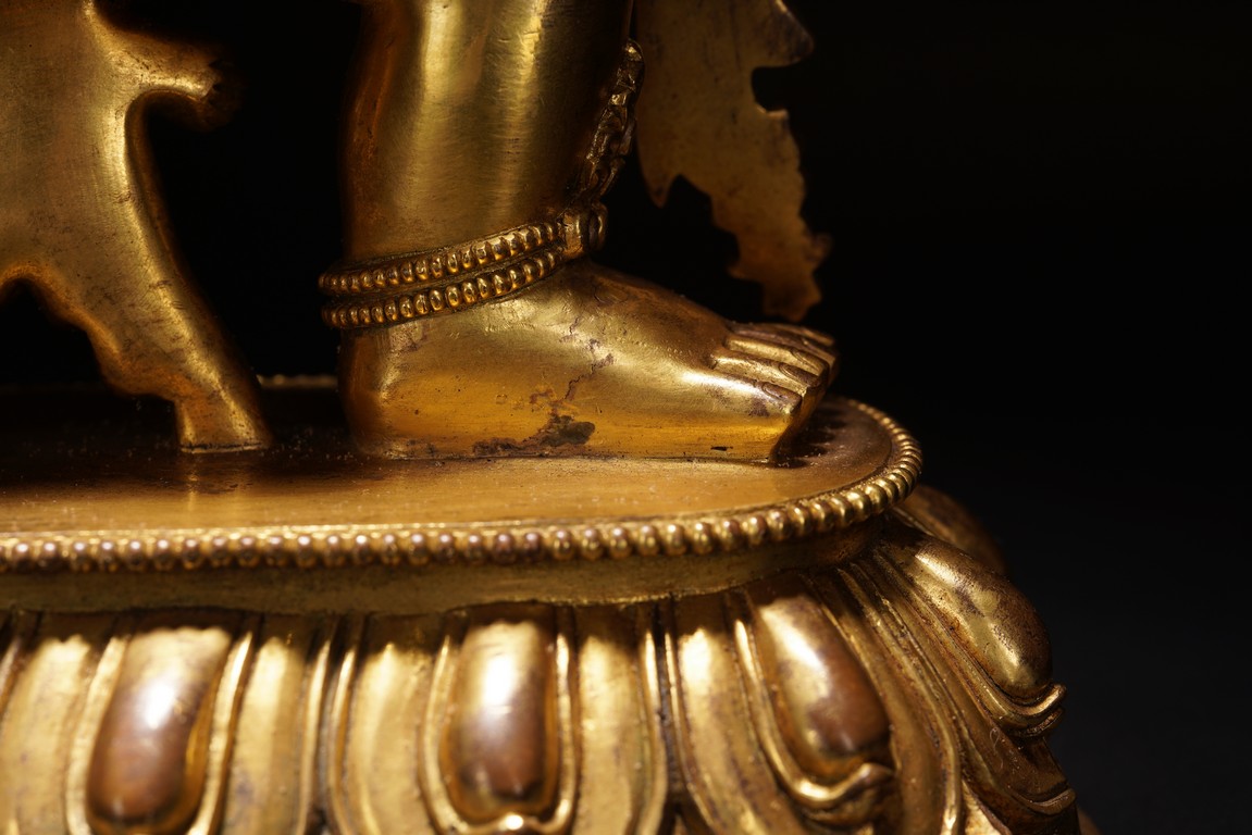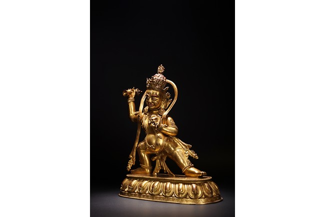 金剛手是大勢至菩薩的化身,為藏傳佛教崇奉的三大依怙主之一。金剛杵原來是古印度的一種兵器,後來被佛教密宗吸收為法器,密宗用金剛杵代表堅固,鋒利之智,表示佛的智能可斷除煩惱,除去魔障,金剛杵也表示如來金剛智印。此尊憤怒相,左展姿,右手高舉金剛鈴,左手於胸前持金剛杵,為金剛手菩薩常見姿態。頭項肉髻,頭戴五智寶冠,象徵五佛五智,濃眉怒目,嘴大張呲牙,上身袒露,飾以瓔珞,腰繫虎皮裙,釧鐲嚴飾。軀體壯實,四肢短粗,長長的帛帶自腦後飄逸而下至雙足,宛若背光,左展立於覆蓮座上。整體精巧而細膩,簡潔明快,鎏金亮麗,可謂同類造像中的精品。