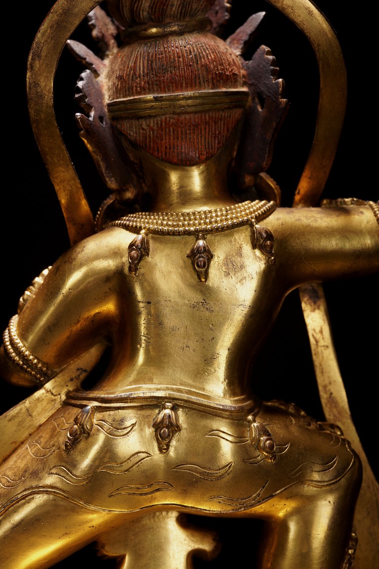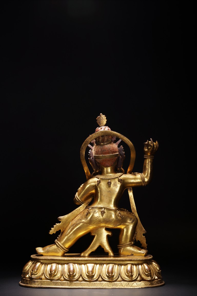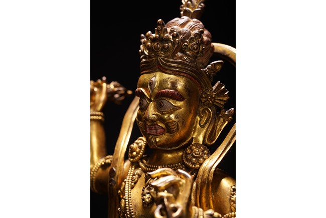 Qing Dynasty period. Shown standing upon a lotus throne wearing a dhoti, with a vajra on both of his right hands, wearing lavish jewellery on his chest, face with wrathful expression, wearing a pointed tiara.