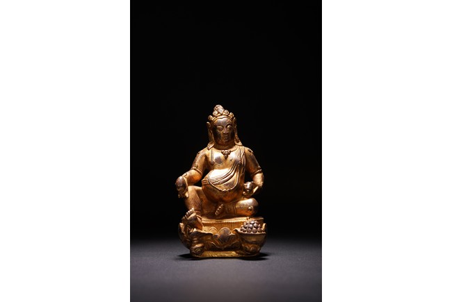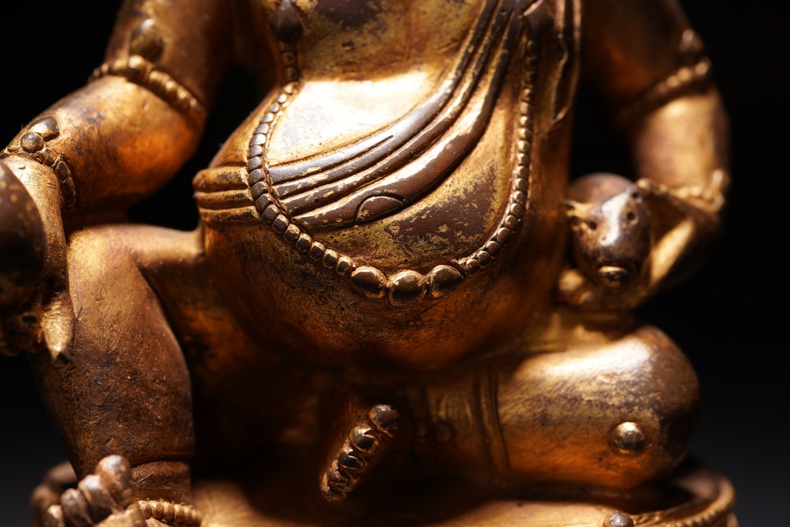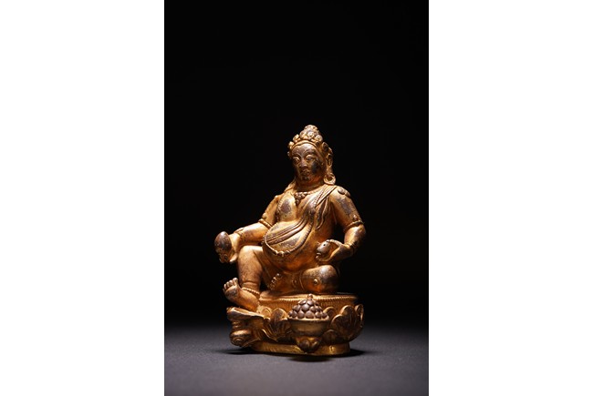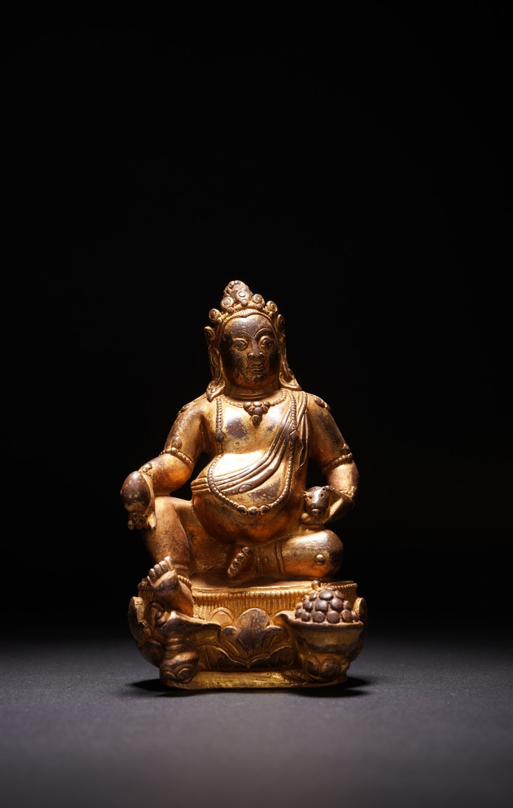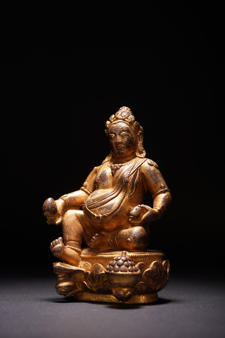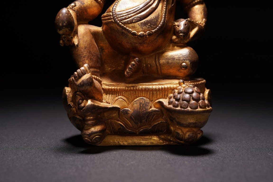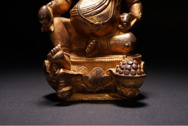 此財神以遊戲姿坐於蓮座之上,頭戴寶冠,髮髻高聳,面相方闊,眉頭微蹙,雙目圓鼓,神態威武兇猛。身體圓潤,上身袒露,佩戴瓔珞、臂釧。右手持元寶,左手輕握吐寶鼠,彷彿鼠嘴含寶正欲源源不斷吐出。左腳跏趺於台上,右腳踩於海螺之上。面部及頸部泥金,局部略傷彩,以表現財神法相威嚴。