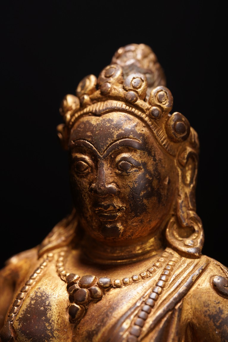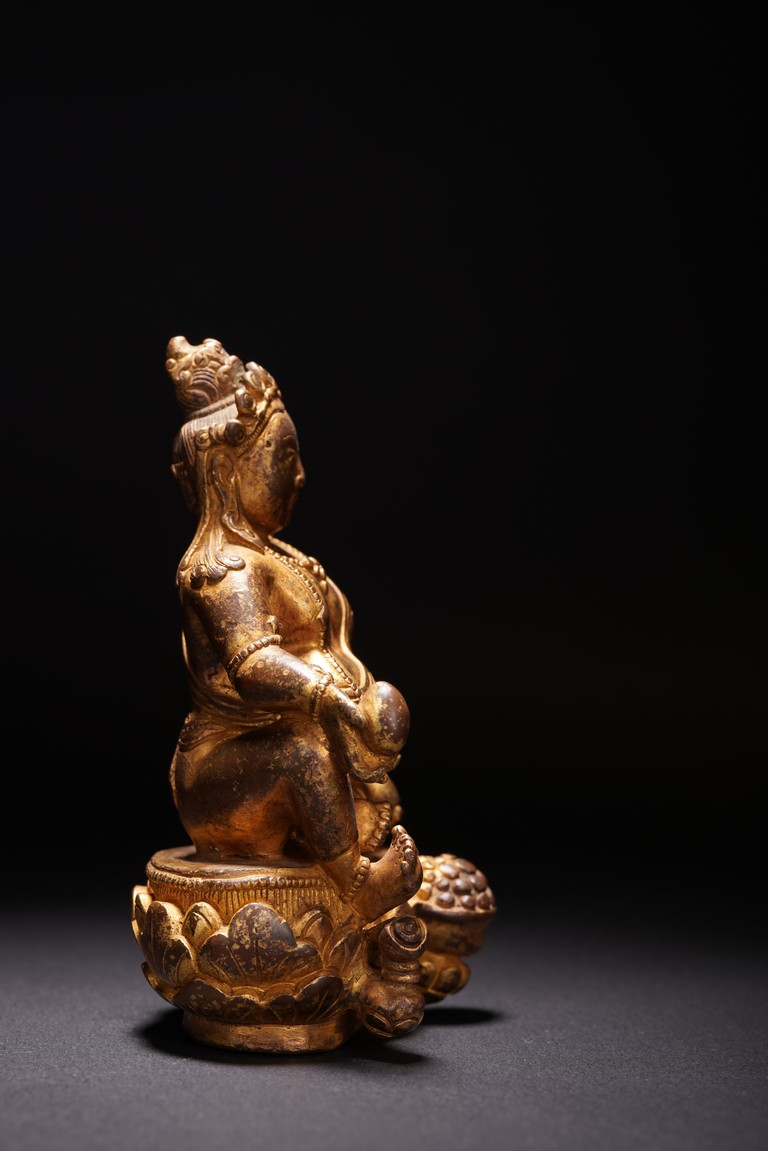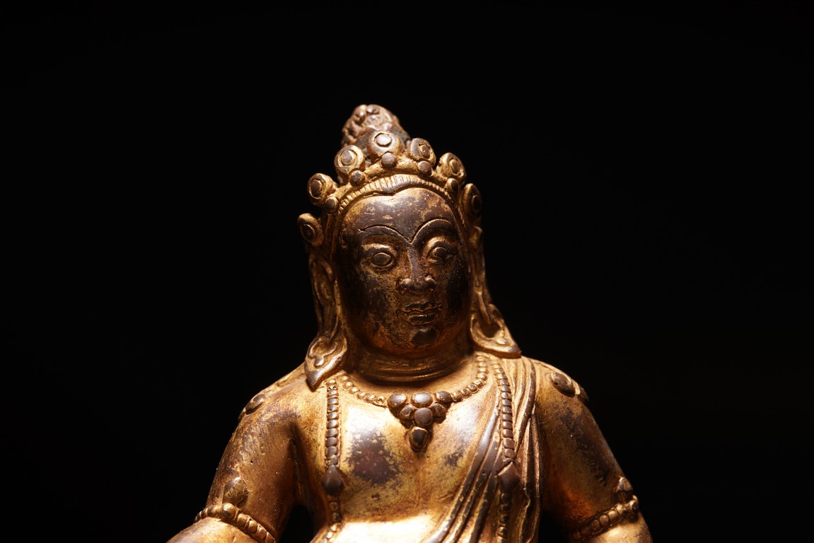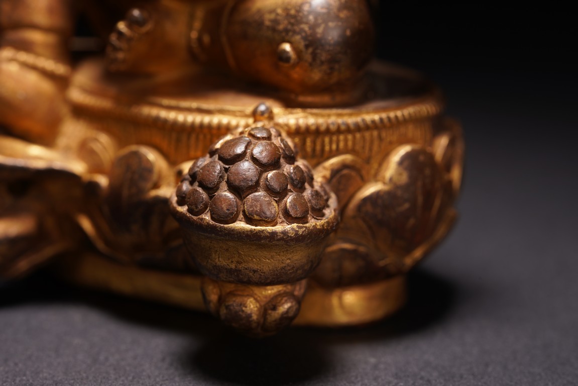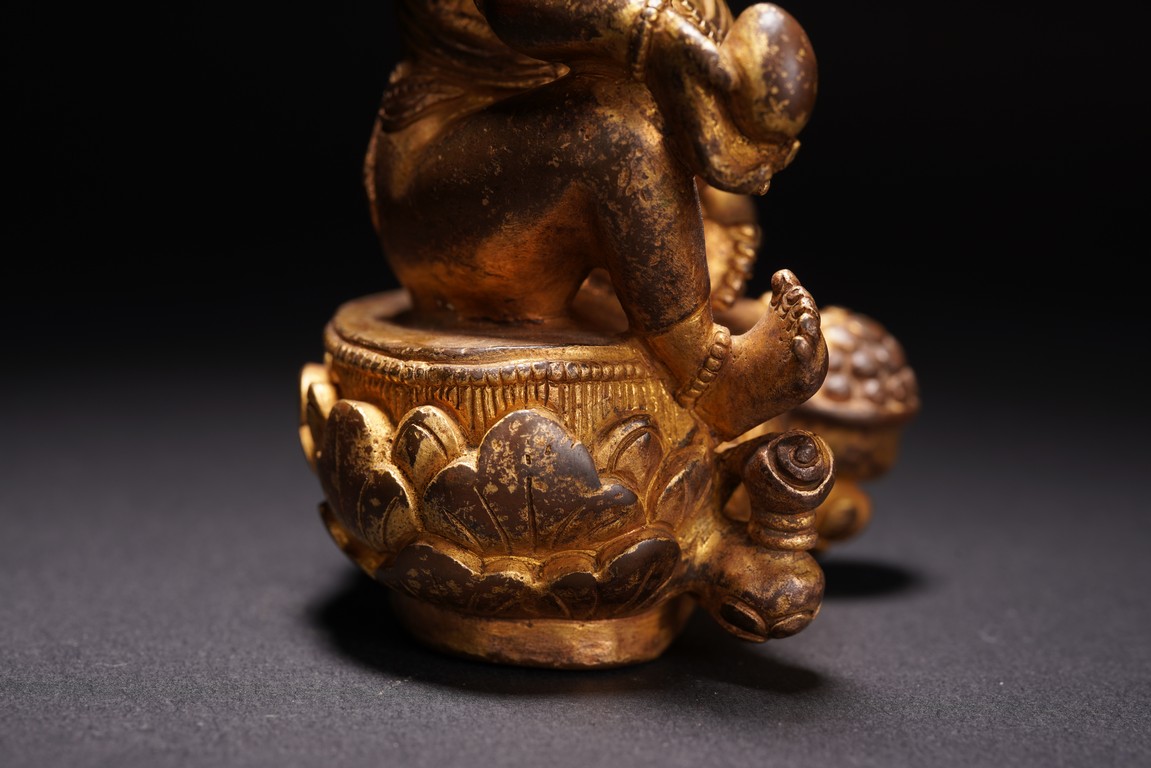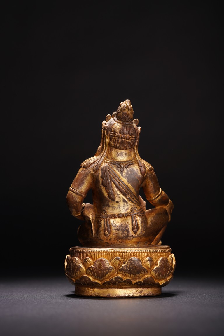 此財神以遊戲姿坐於蓮座之上,頭戴寶冠,髮髻高聳,面相方闊,眉頭微蹙,雙目圓鼓,神態威武兇猛。身體圓潤,上身袒露,佩戴瓔珞、臂釧。右手持元寶,左手輕握吐寶鼠,彷彿鼠嘴含寶正欲源源不斷吐出。左腳跏趺於台上,右腳踩於海螺之上。面部及頸部泥金,局部略傷彩,以表現財神法相威嚴。