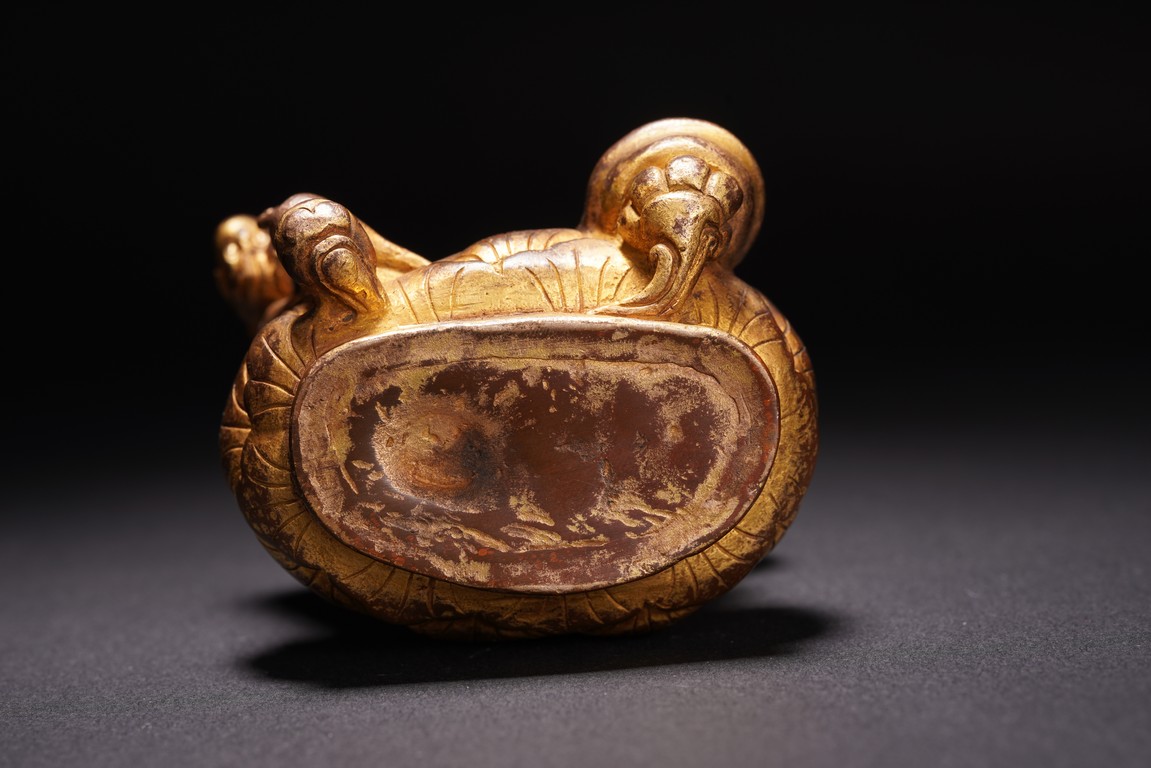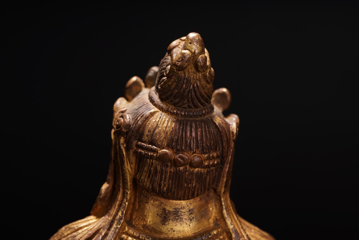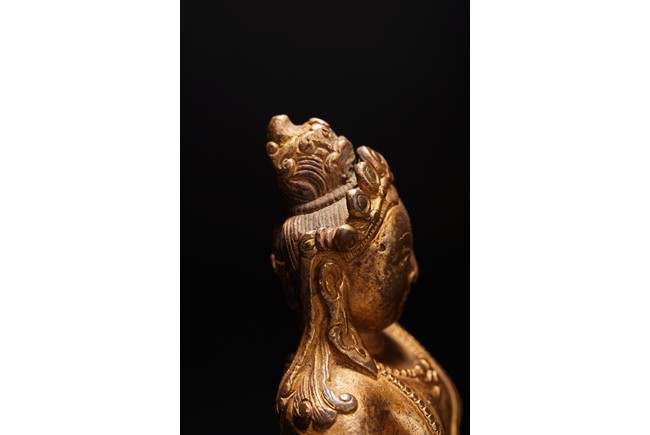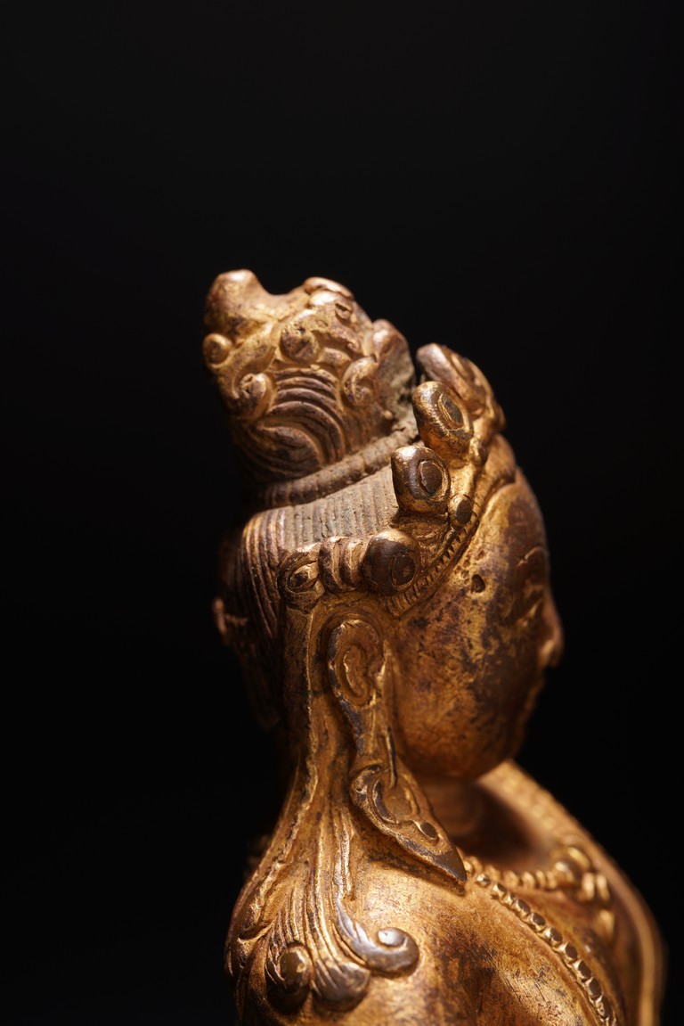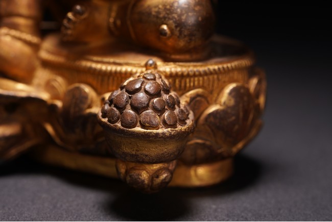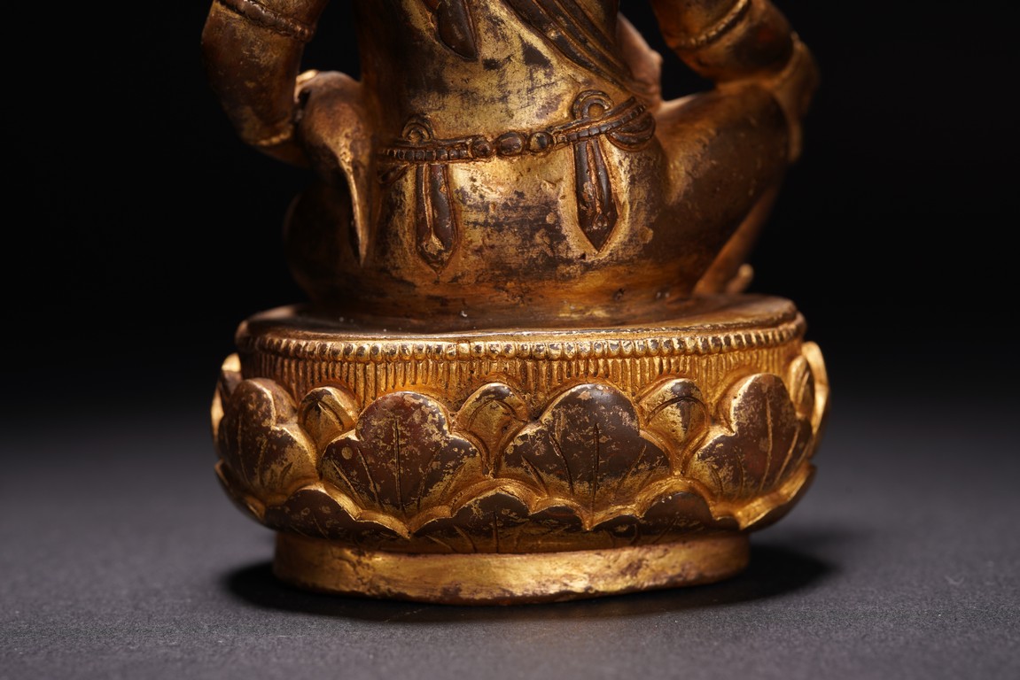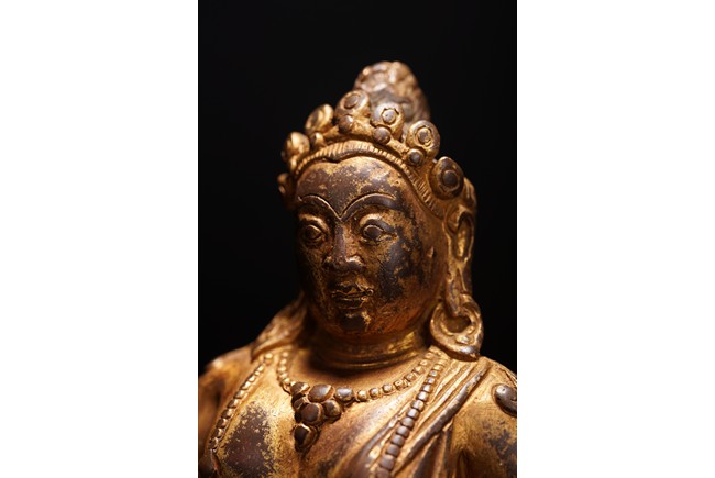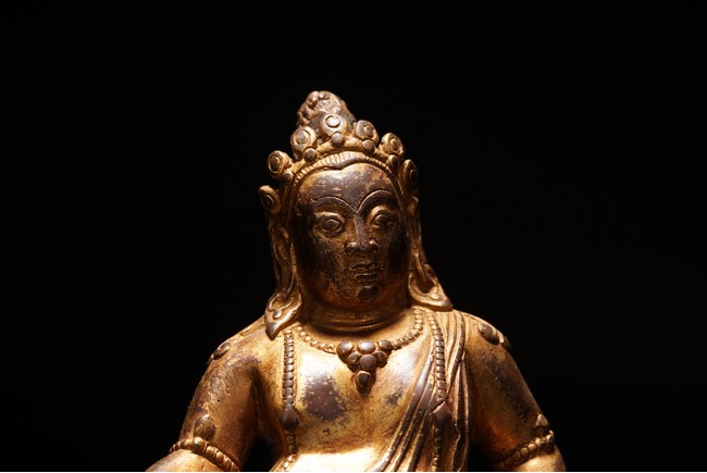 此財神以遊戲姿坐於蓮座之上,頭戴寶冠,髮髻高聳,面相方闊,眉頭微蹙,雙目圓鼓,神態威武兇猛。身體圓潤,上身袒露,佩戴瓔珞、臂釧。右手持元寶,左手輕握吐寶鼠,彷彿鼠嘴含寶正欲源源不斷吐出。左腳跏趺於台上,右腳踩於海螺之上。面部及頸部泥金,局部略傷彩,以表現財神法相威嚴。