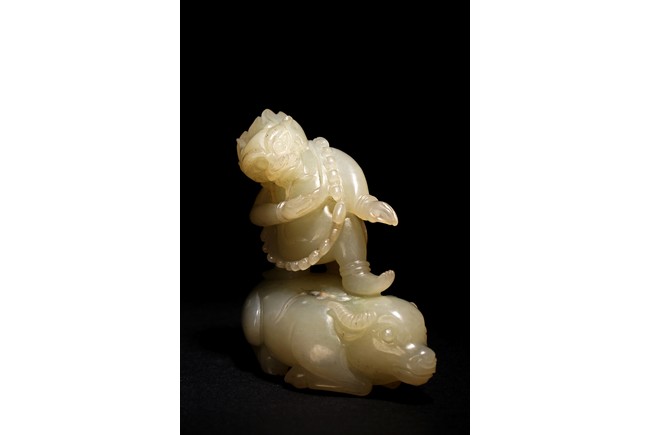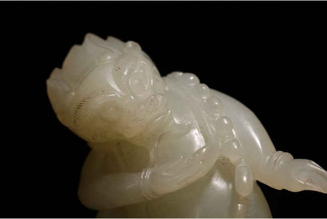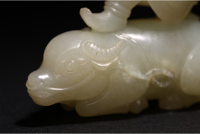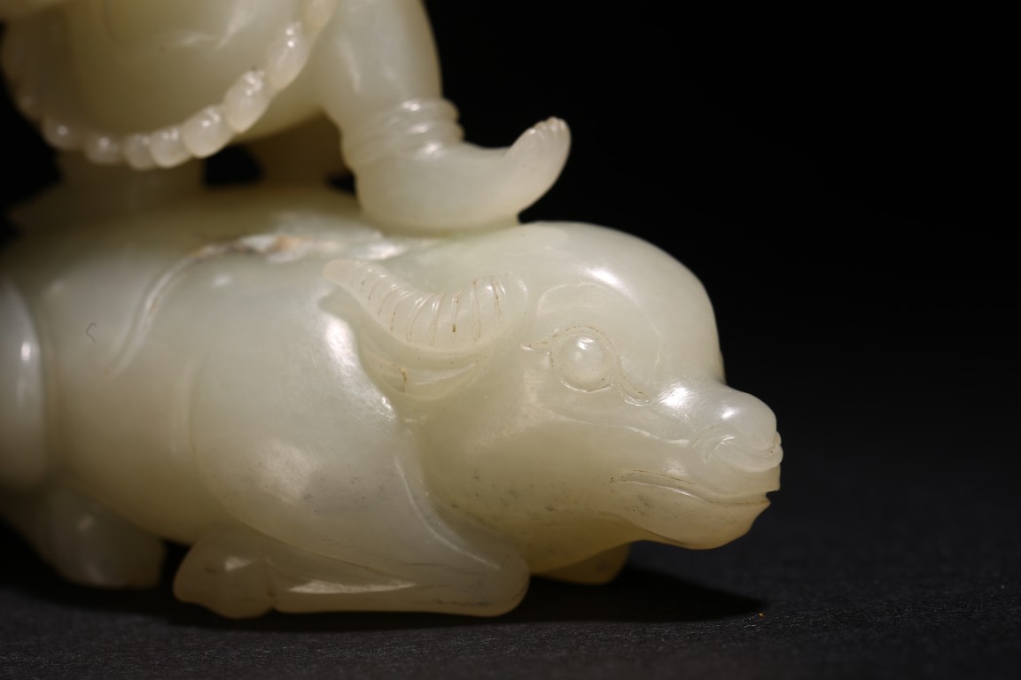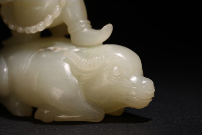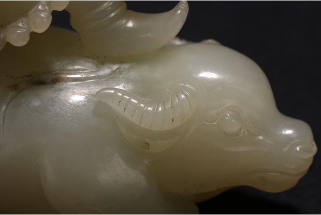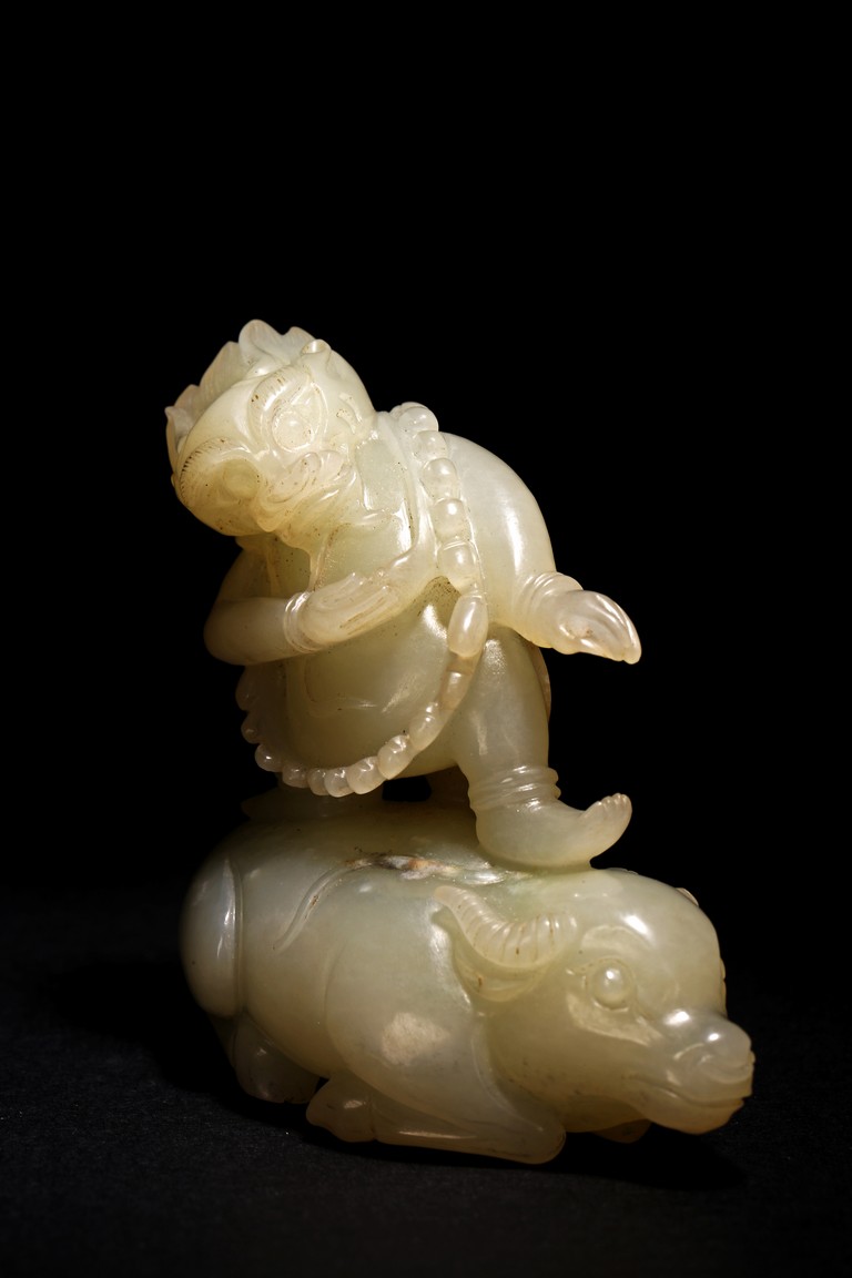 Carved in the form of a beast-head Tibetan buddhist deity wearing beaded necklace standing on top of recumbent buffalo.