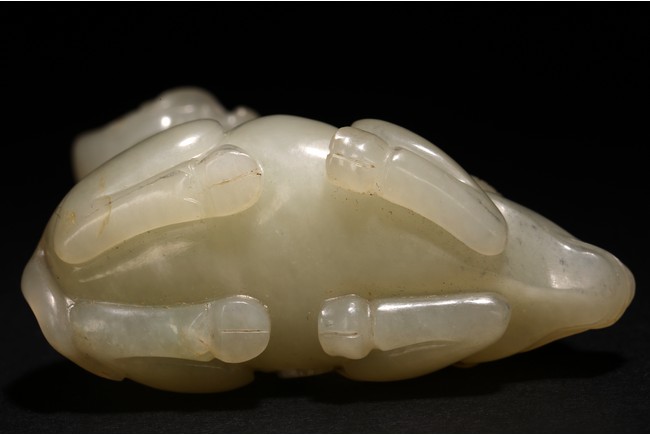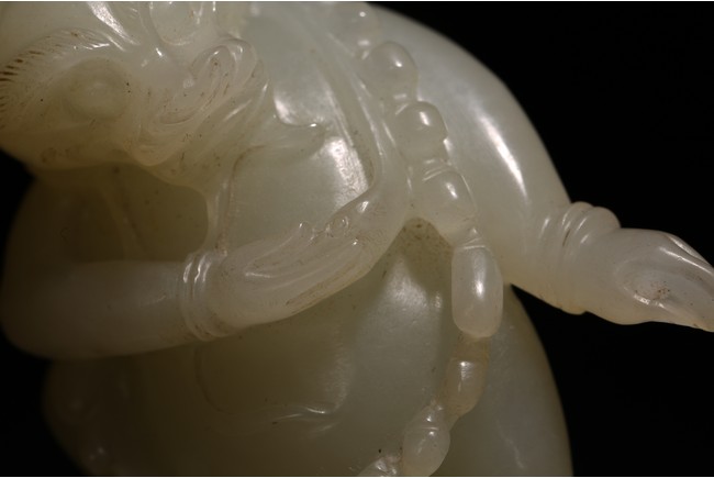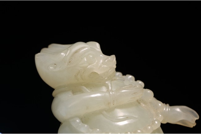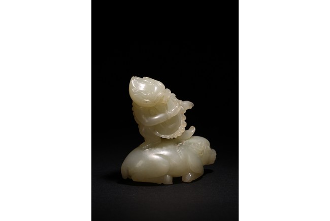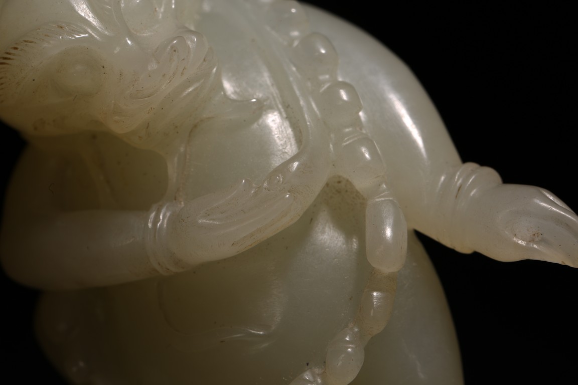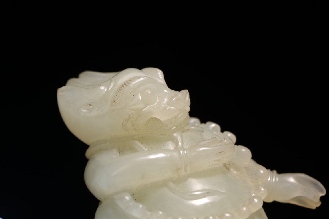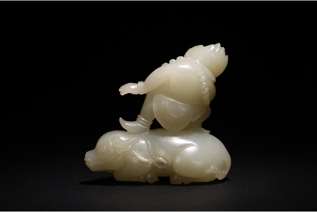 Carved in the form of a beast-head Tibetan buddhist deity wearing beaded necklace standing on top of recumbent buffalo.