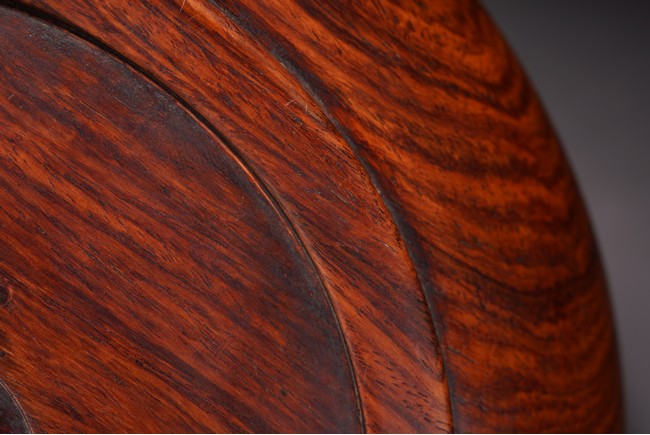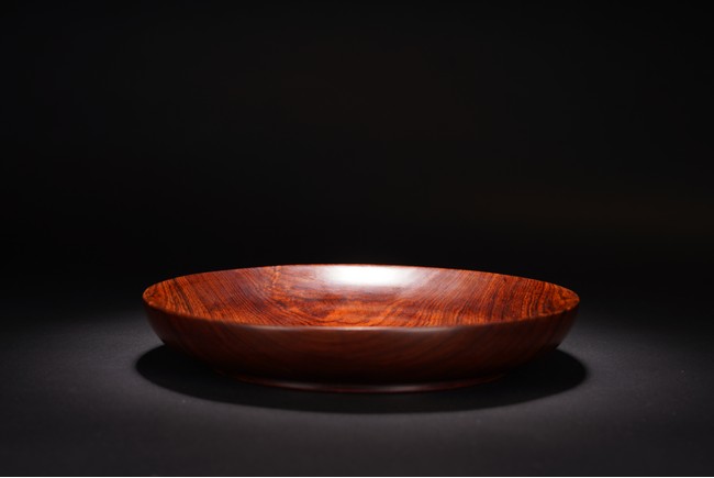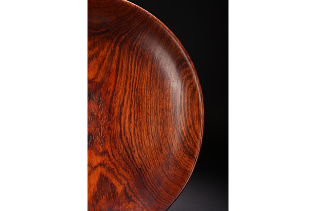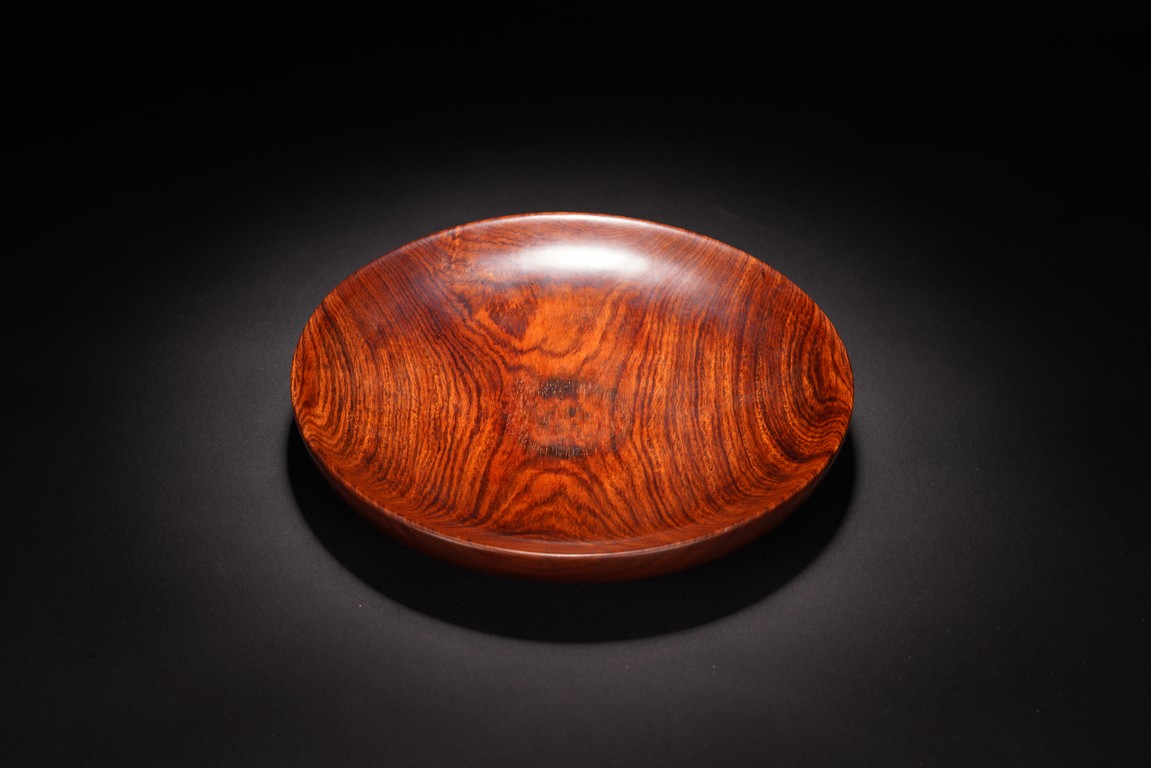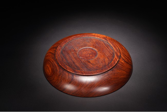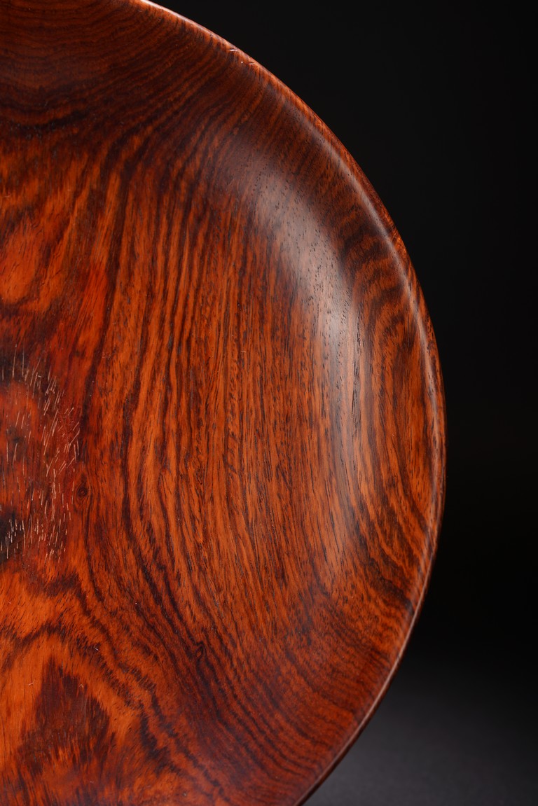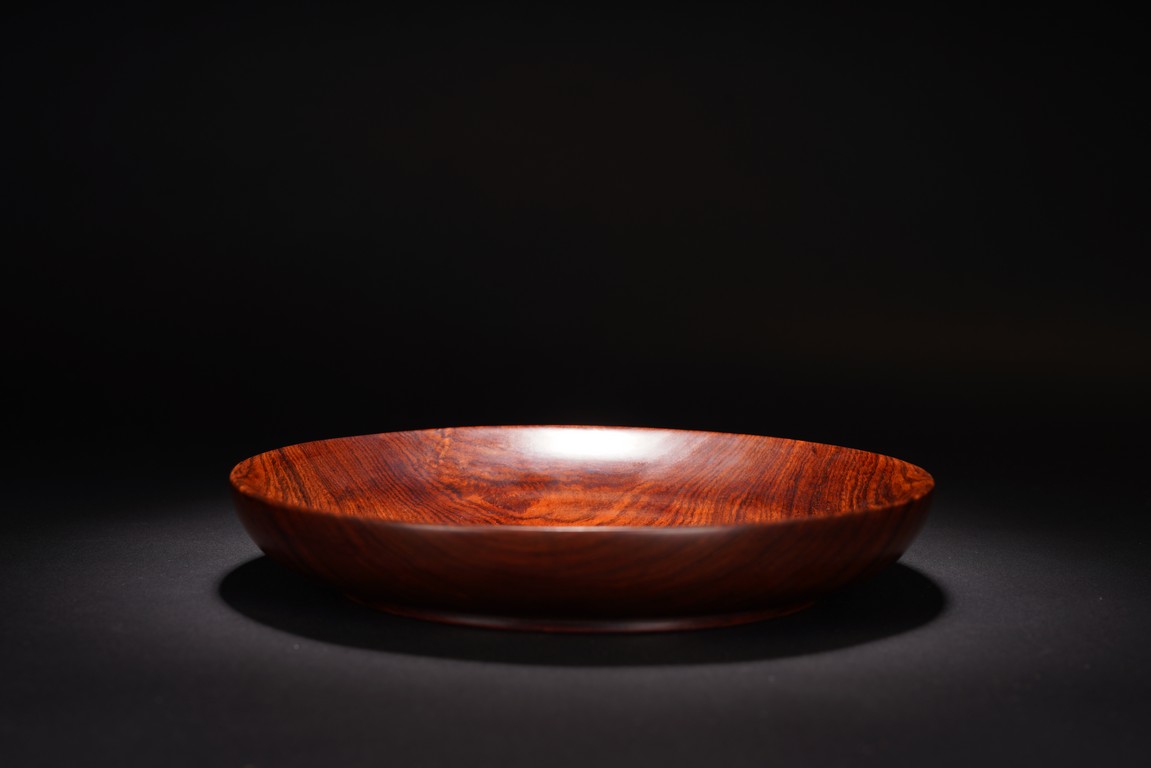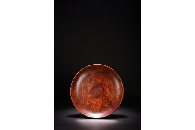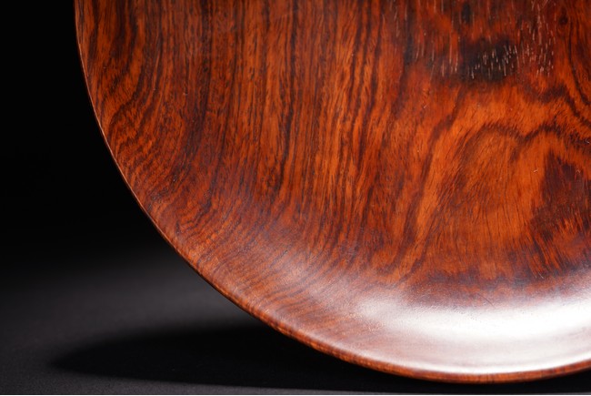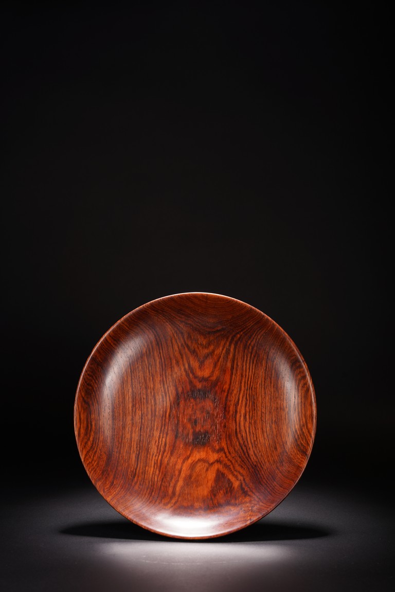 此盤用珍貴的黃花梨木整挖而成,仿傳統瓷盤形制,敞口、淺弧腹、圈足。製作精良,一氣呵成,光素無紋,唯見木頭的自然紋理,精緻美觀。整體製作工藝精湛,形制規整,黃花梨紋理清晰自然,包漿瑩潤。